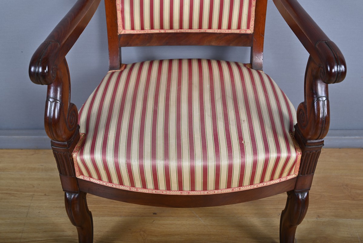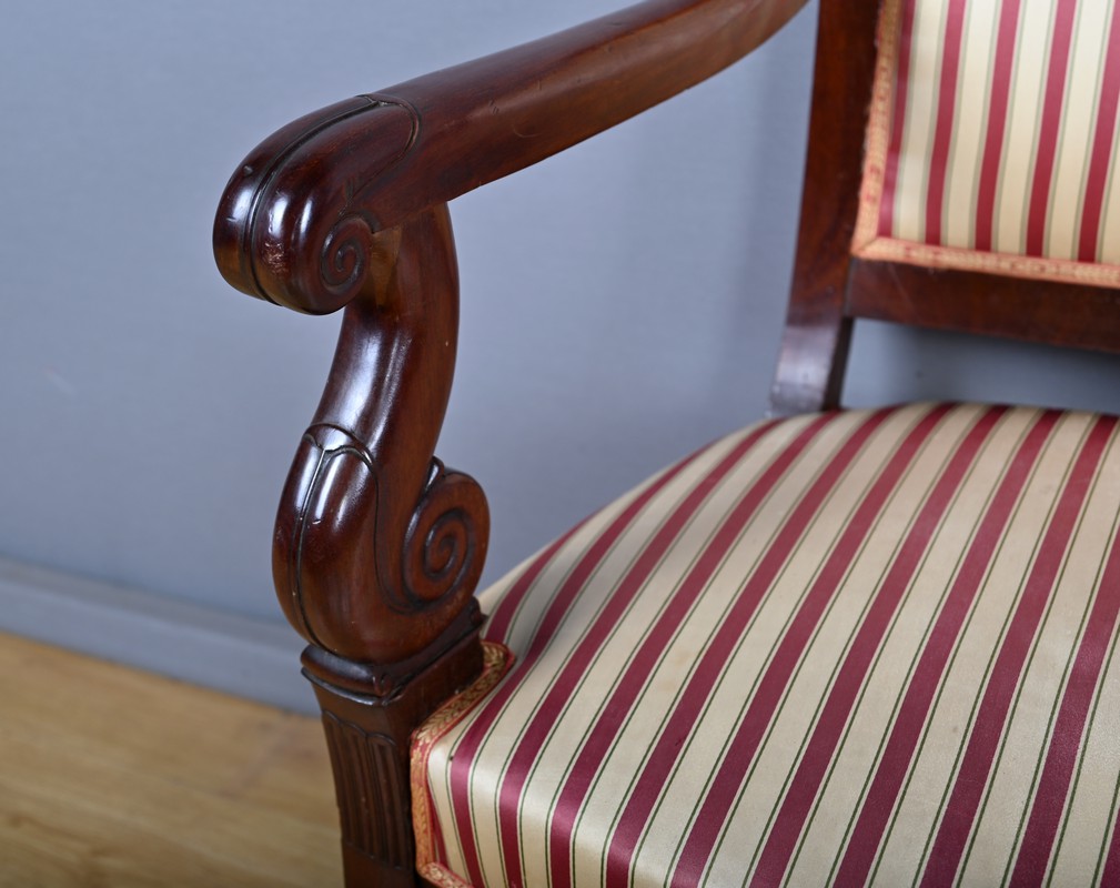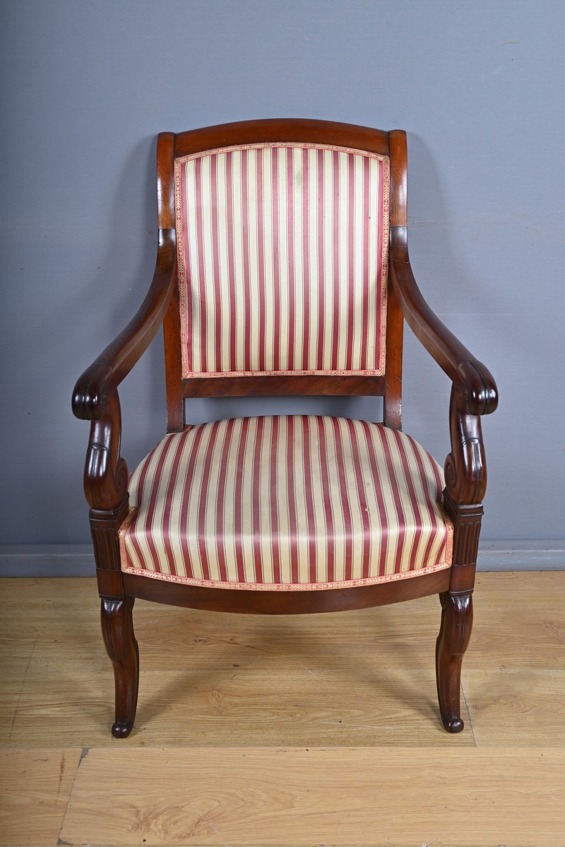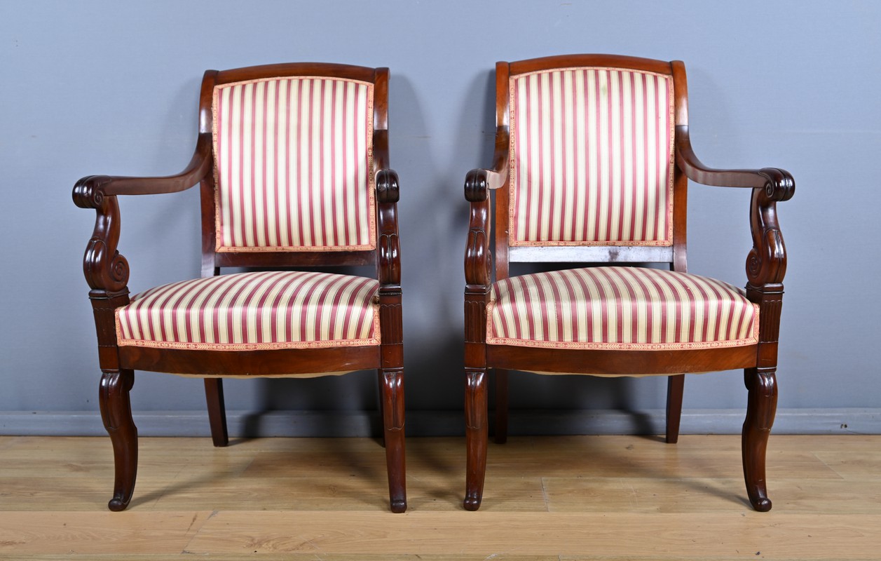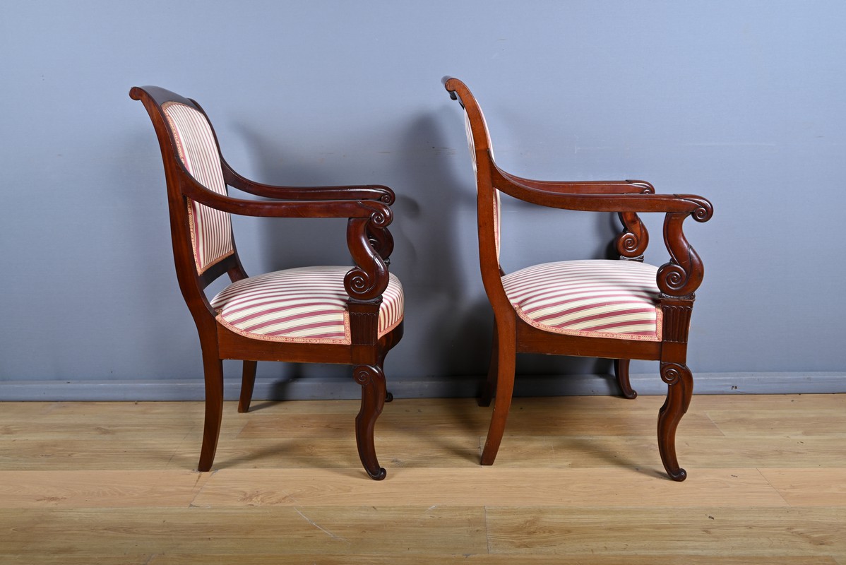 Élégants fauteuils en acajou de Cuba massif reposant sur des pieds avant à jarret et des pieds arrière sabre.