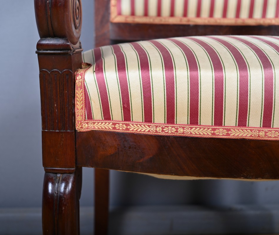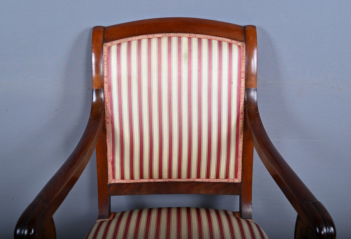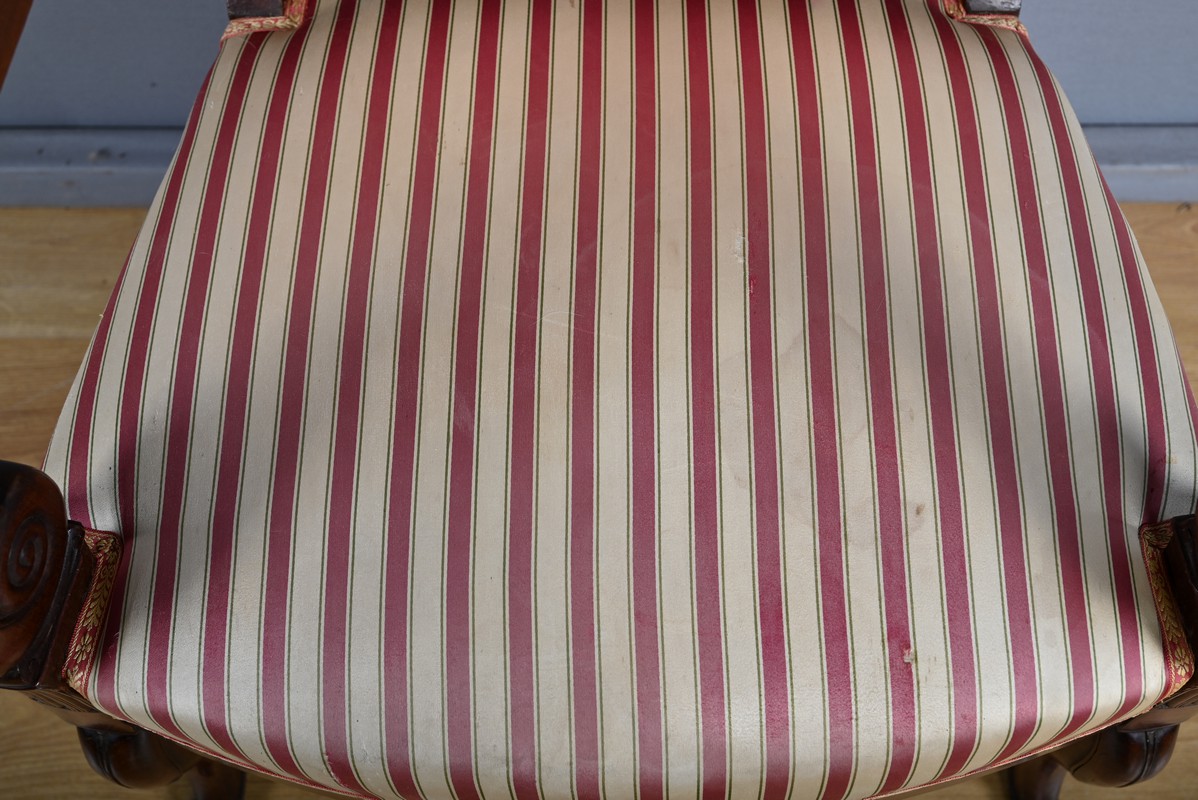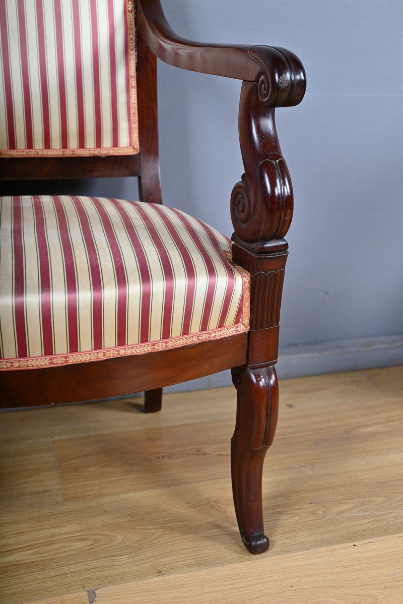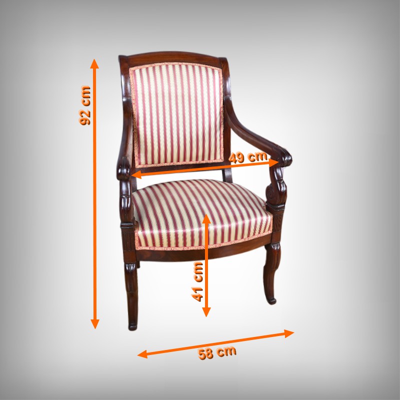 Chaque assise est réalisée à l’ancienne avec sangles, ressorts et crin. Elle est recouverte d’un tissu de soierie rayé qu’il conviendra de changer à votre convenance.