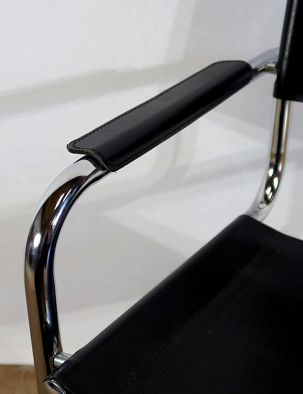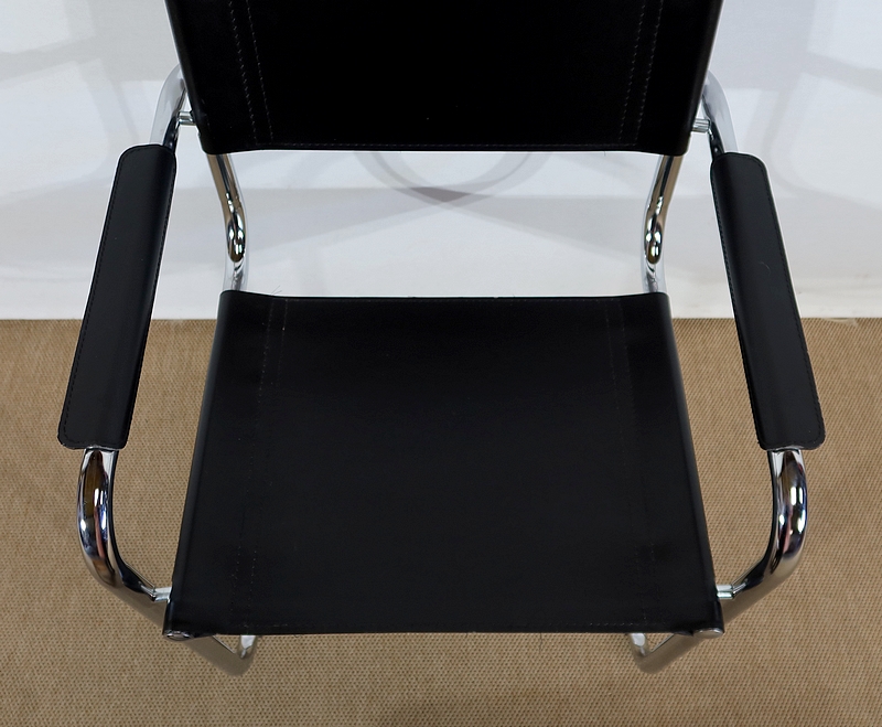 Le dossier, l’assise et les manchettes d’accotoirs sont tendus d’un cuir noir en excellent état. Il est piqué à point sellier, technique de couture à deux aiguilles, très appréciée car des plus solides.