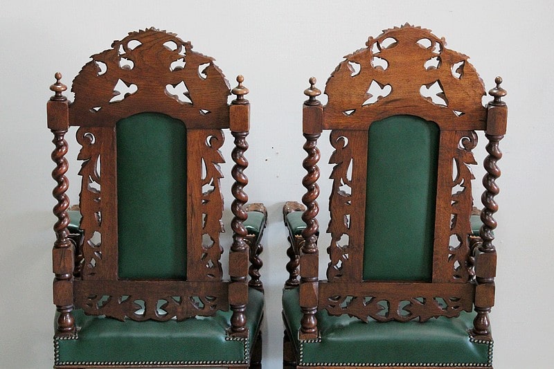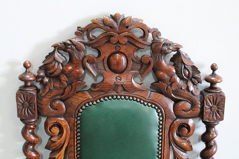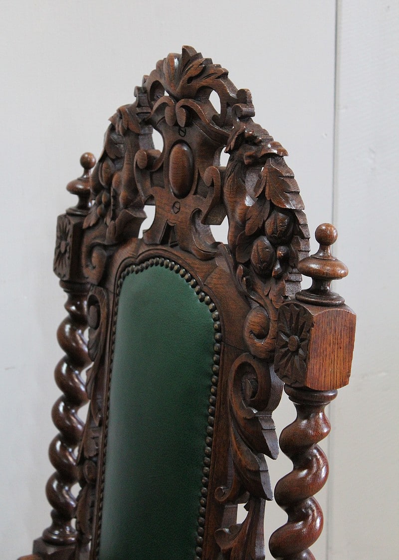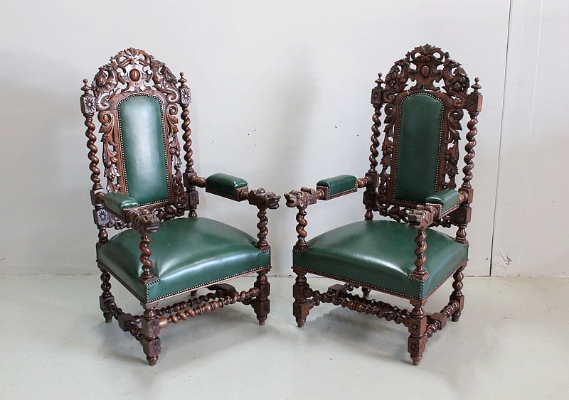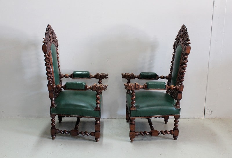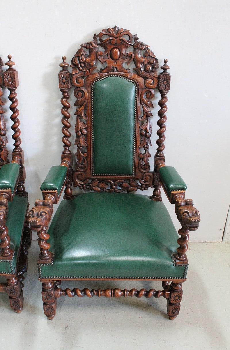 Les dossiers sont sculptés de colonnes torsadées ainsi que de rinceaux, d’un médaillon central et de chimères.