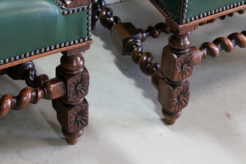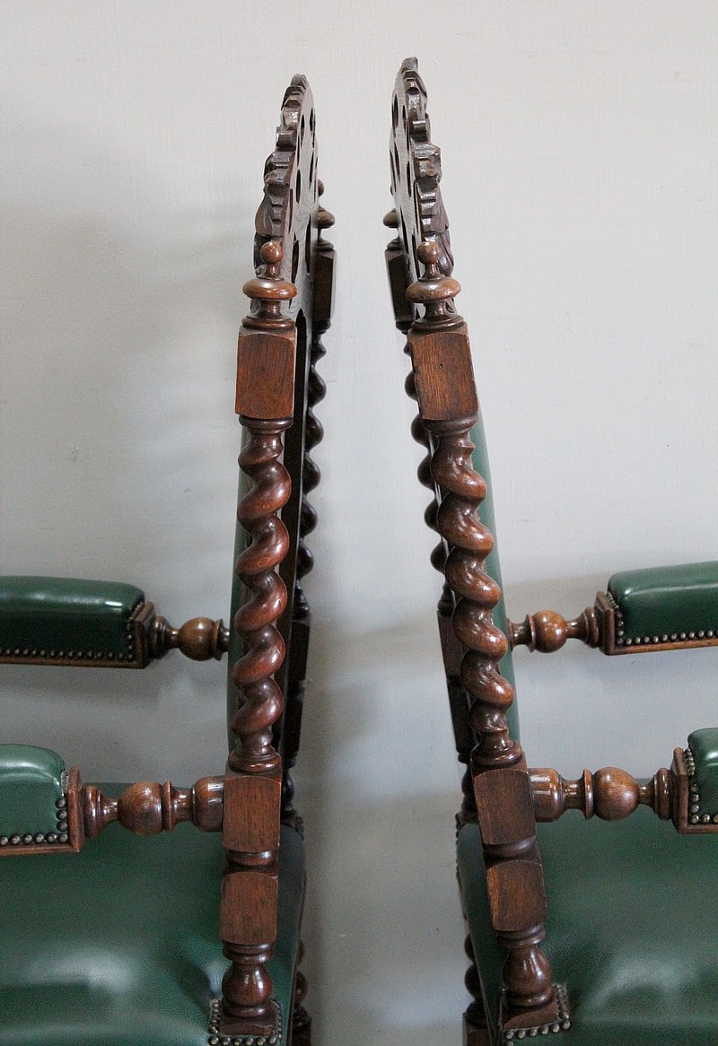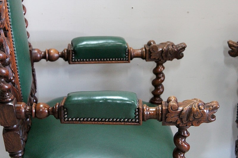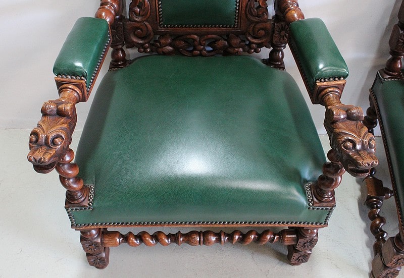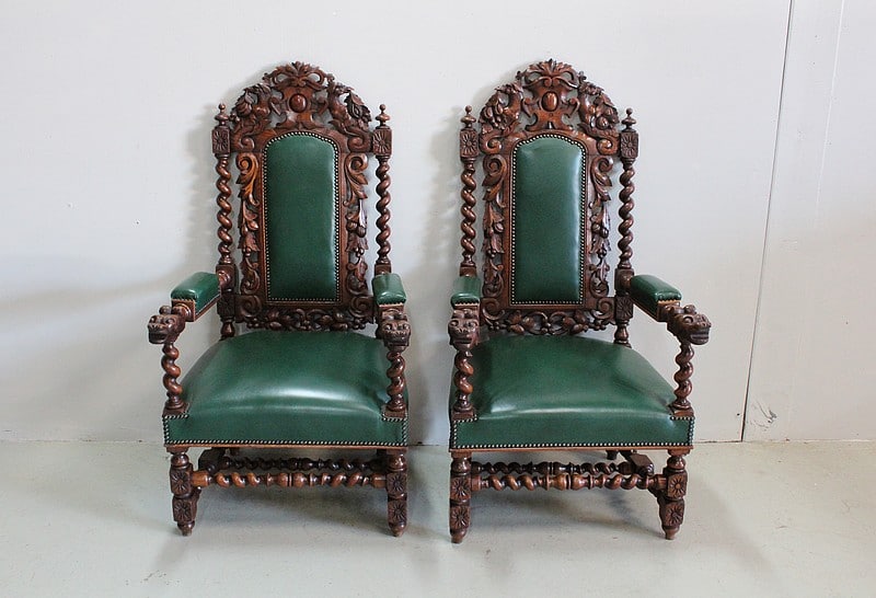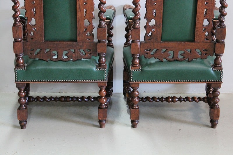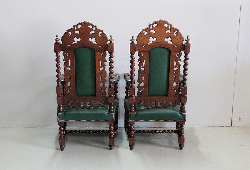 Les dossiers sont sculptés de colonnes torsadées ainsi que de rinceaux, d’un médaillon central et de chimères.