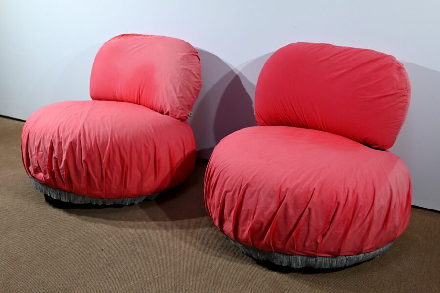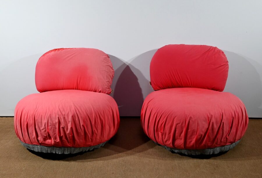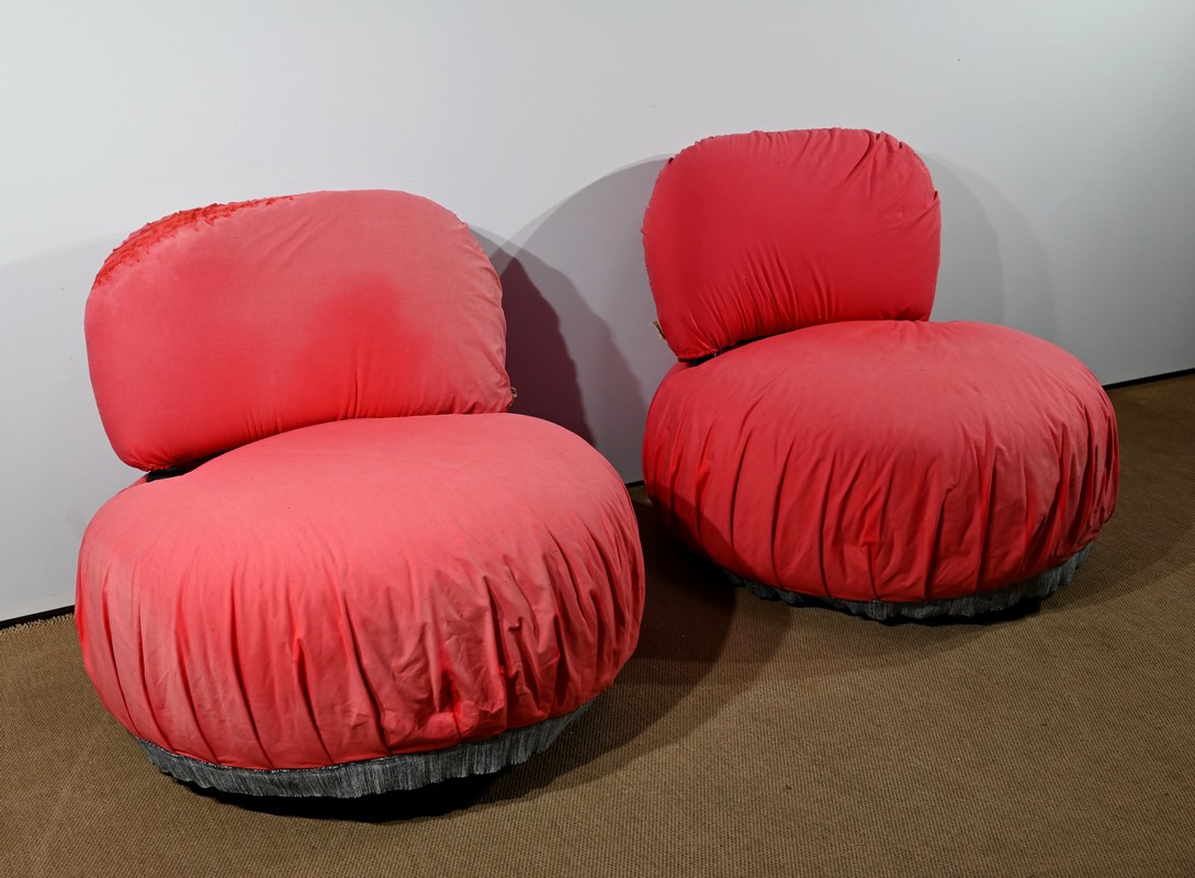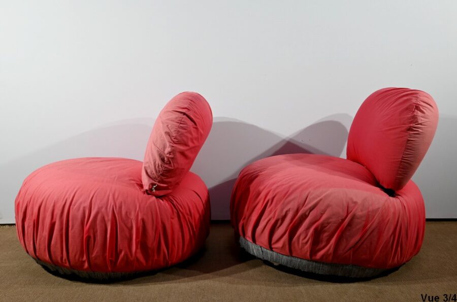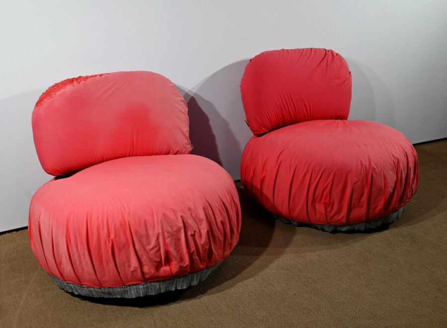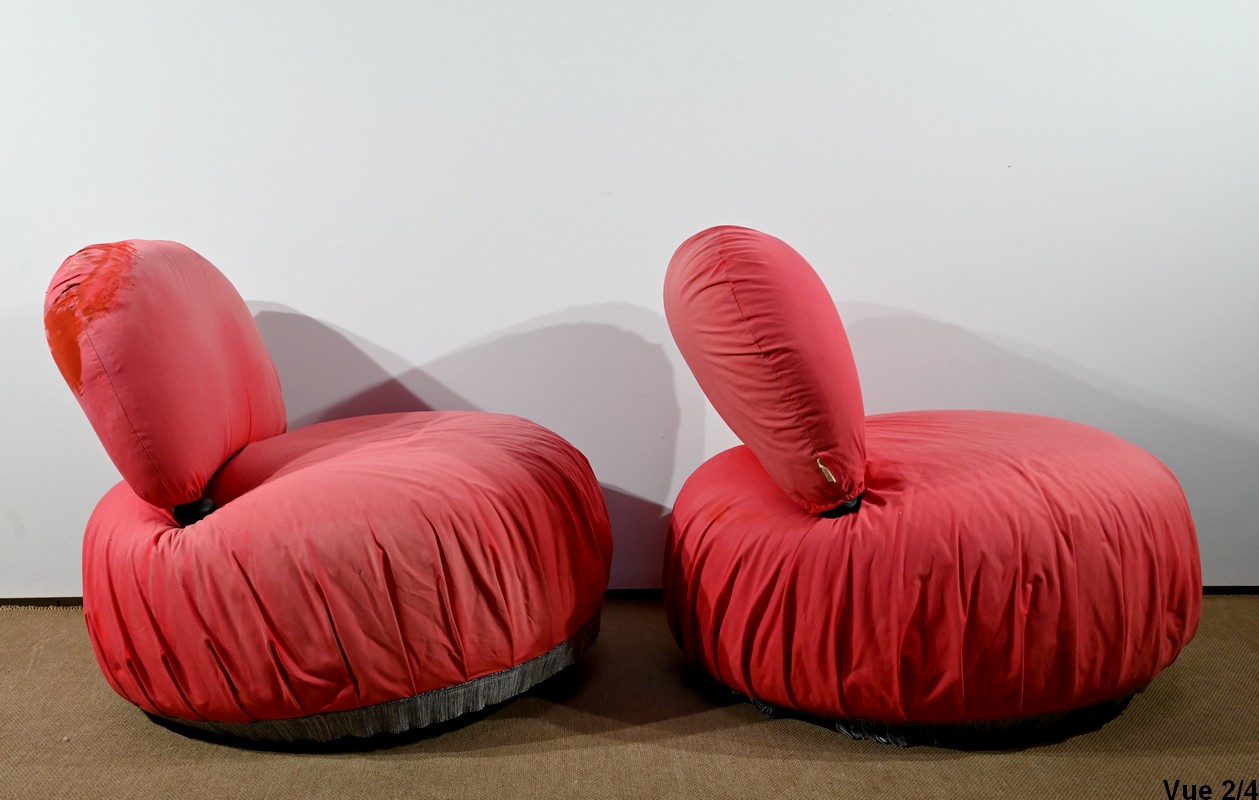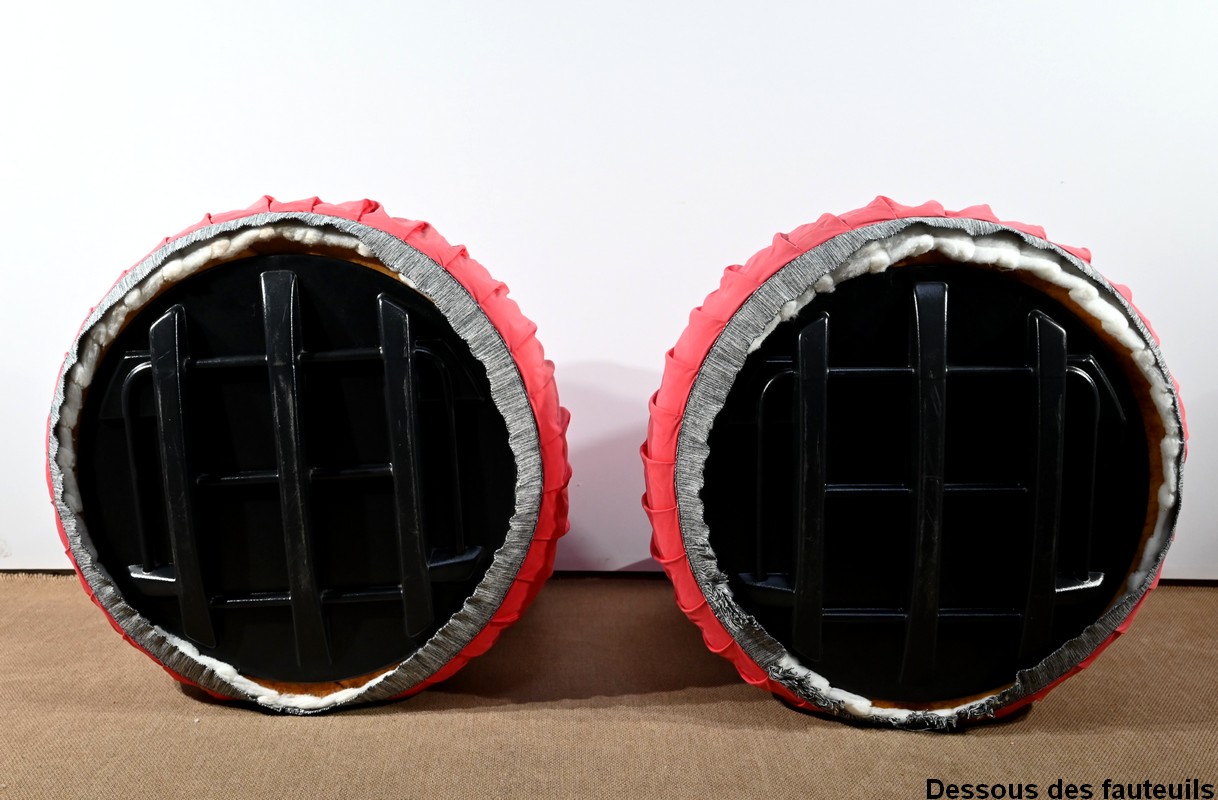 Ces produits design, de forme circulaire, sont garnis d’un tissu rouge grenadine. Les dossiers amovibles sont fixés à l’aide de tiges métalliques dans l’esprit des repose-têtes de sièges pour automobiles.