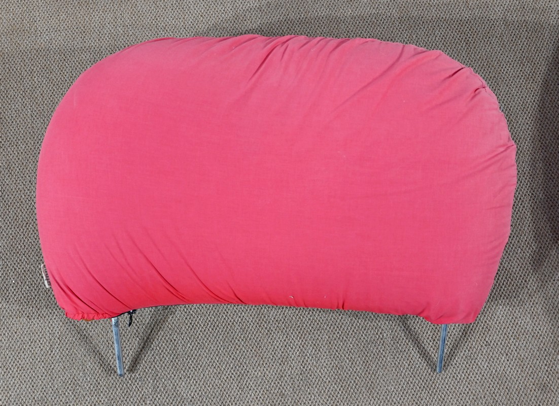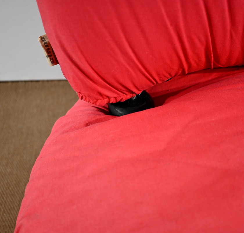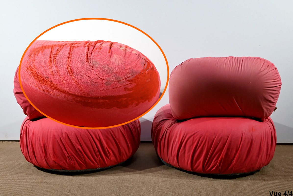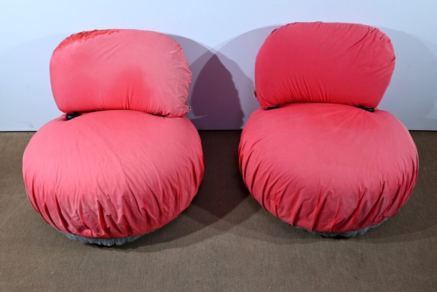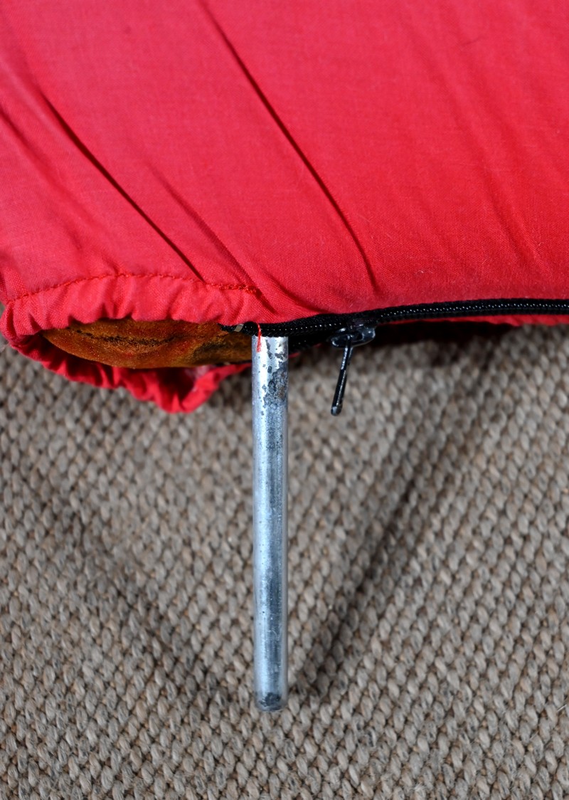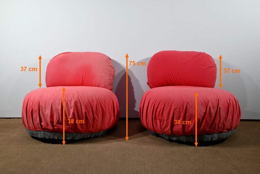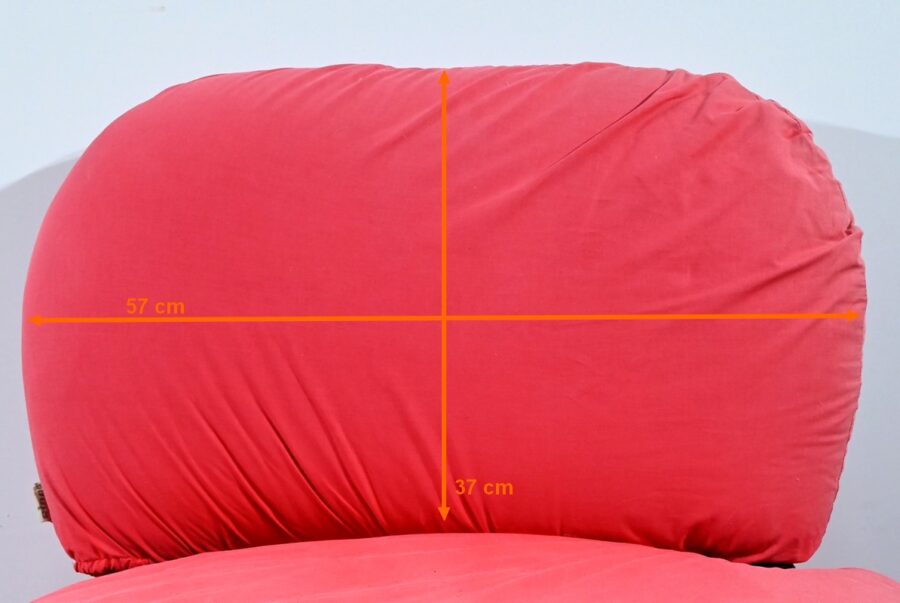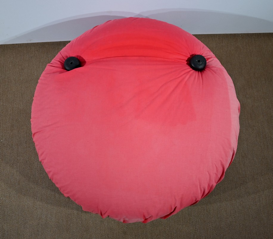 Ces produits design, de forme circulaire, sont garnis d’un tissu rouge grenadine. Les dossiers amovibles sont fixés à l’aide de tiges métalliques dans l’esprit des repose-têtes de sièges pour automobiles.