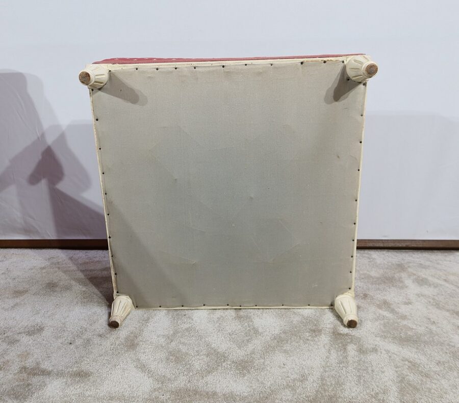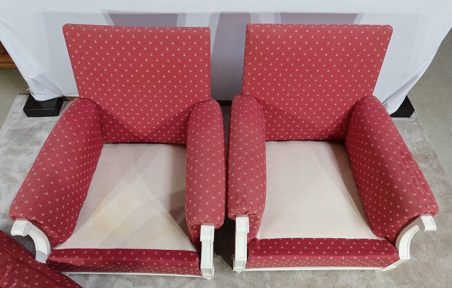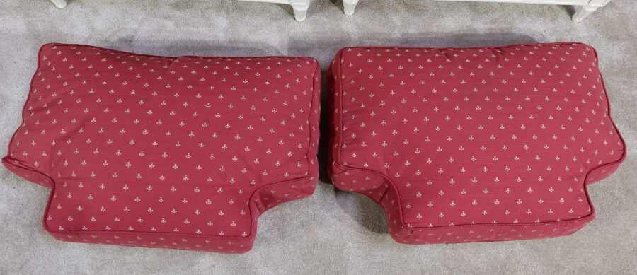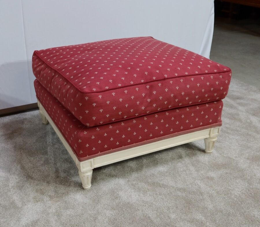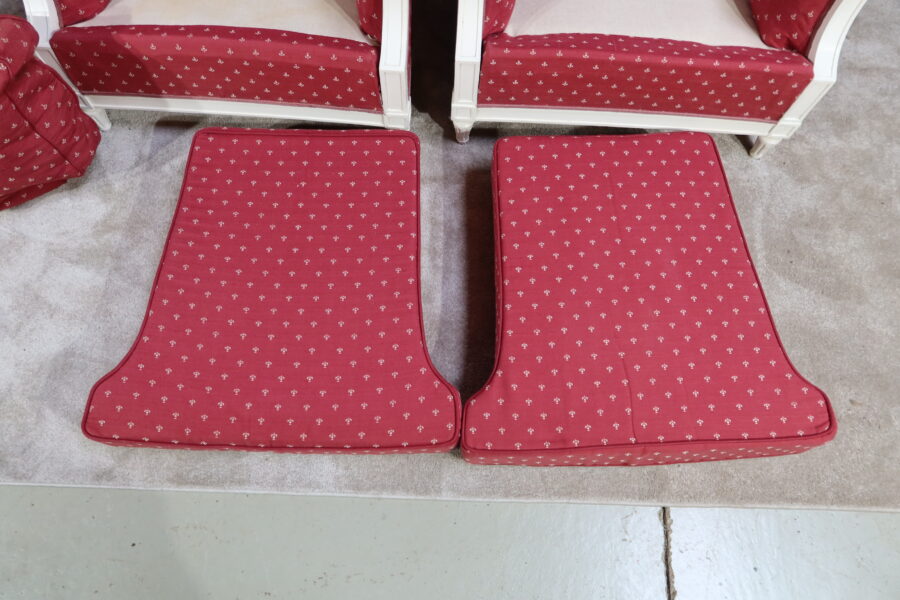 Ces assises reposent sur des pieds toupie Louis XVI à cannelures. Ces sièges solides se complètent d’un large ottoman.