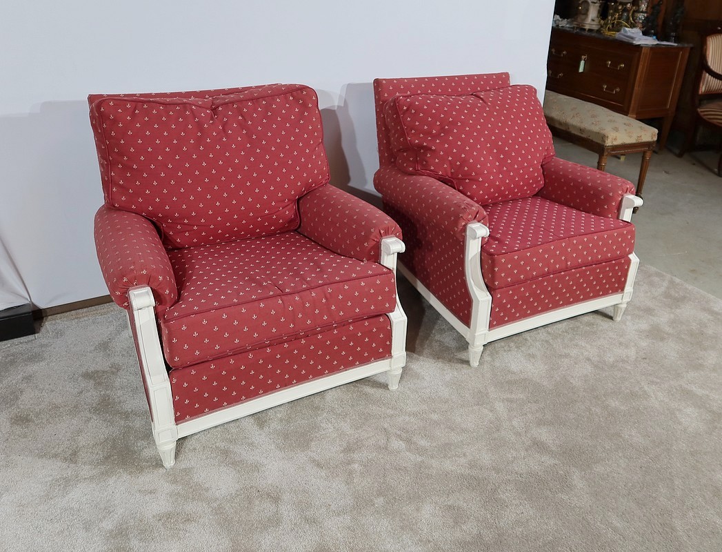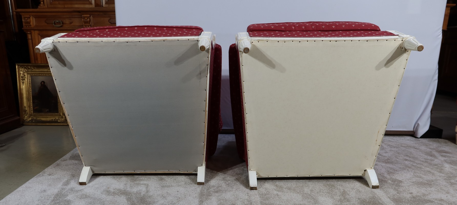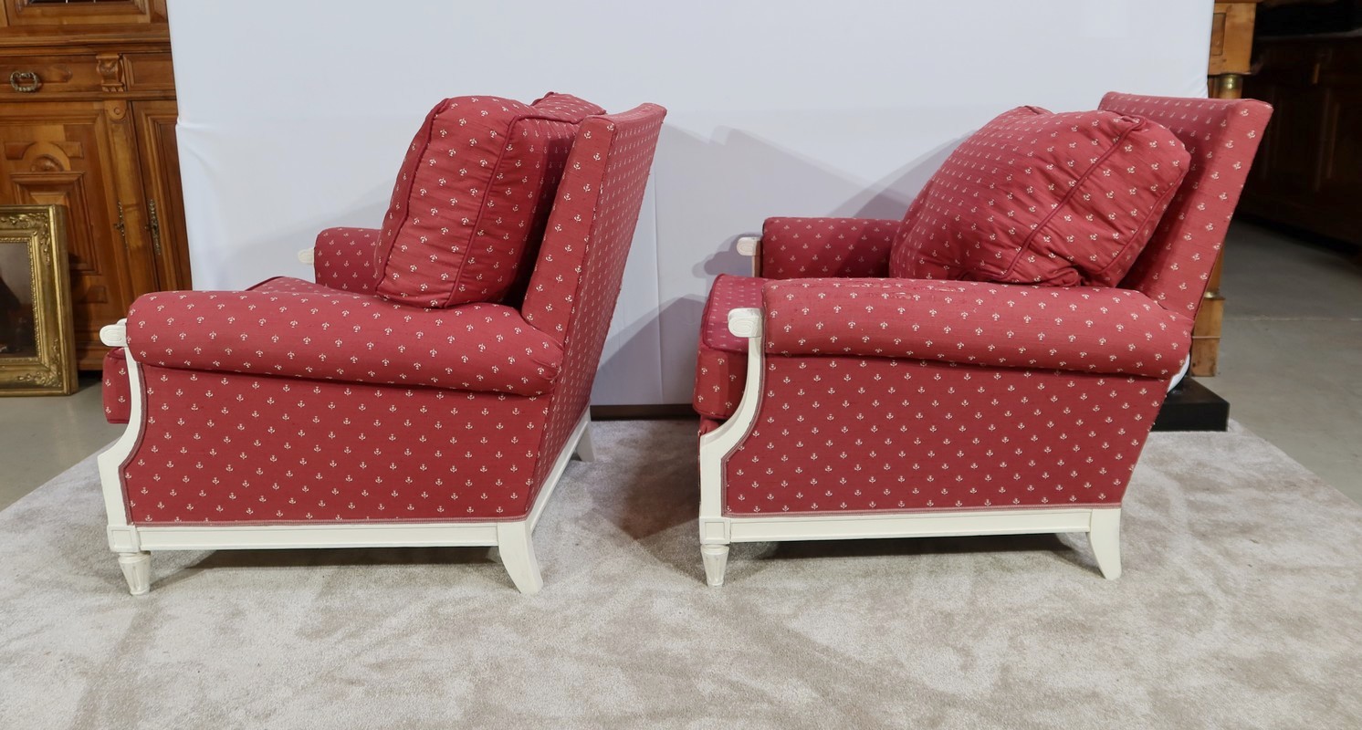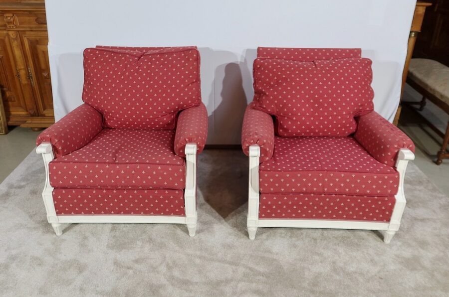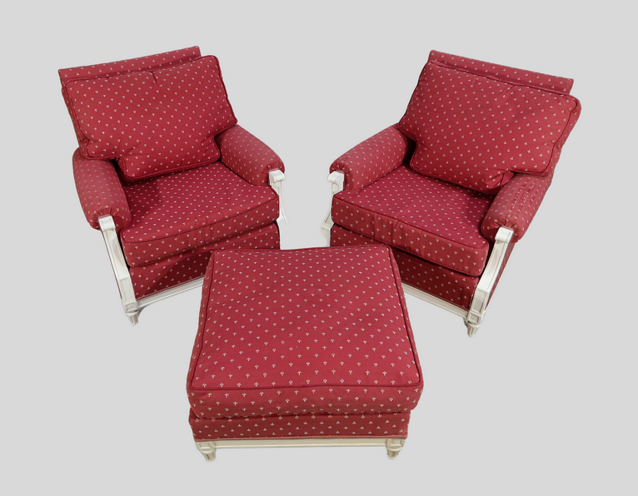 Charmants fauteuils accompagnés d’un ottoman assorti, dotés d’une ossature en hêtre teinté crème et d’un tissu framboise décoré de fleurettes stylisées. Ce tissu est en état d’usage.