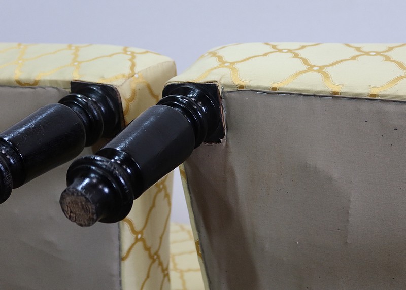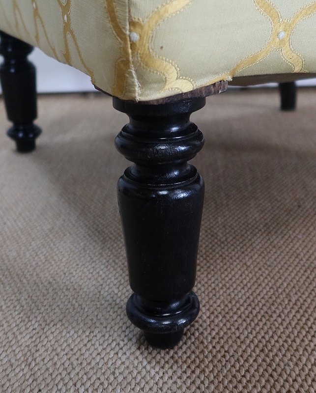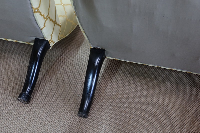 Chacune possède un dossier légèrement renversé à crosse vers l’arrière . Elles reposent sur le devant par deux pieds tournés en fuseau et à l’arrière de deux pieds cambrés vers l’extérieur en vernis noir.