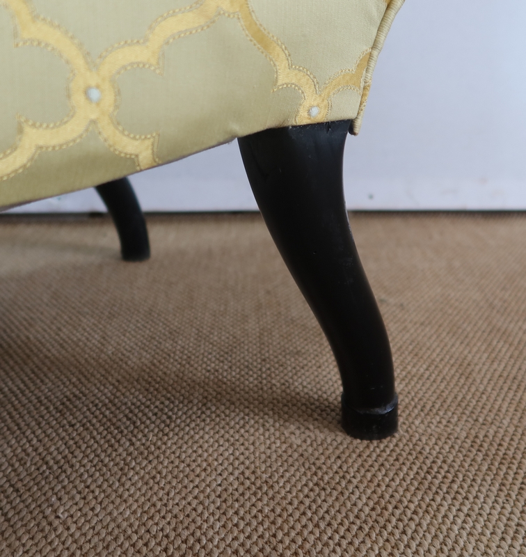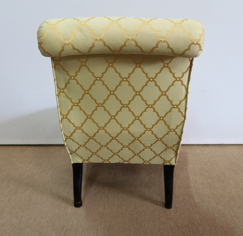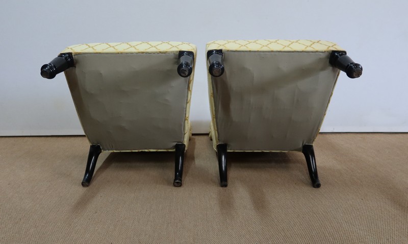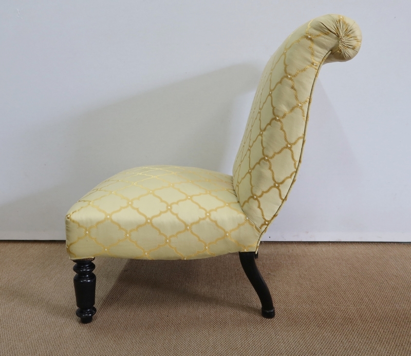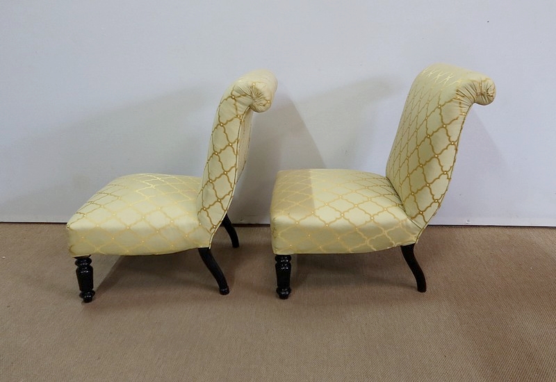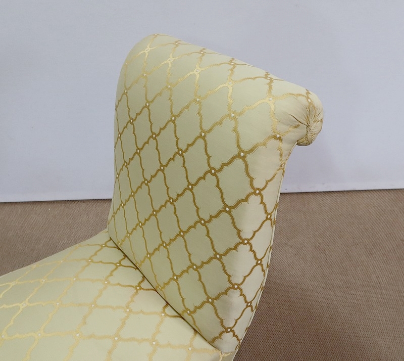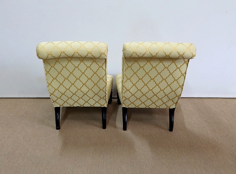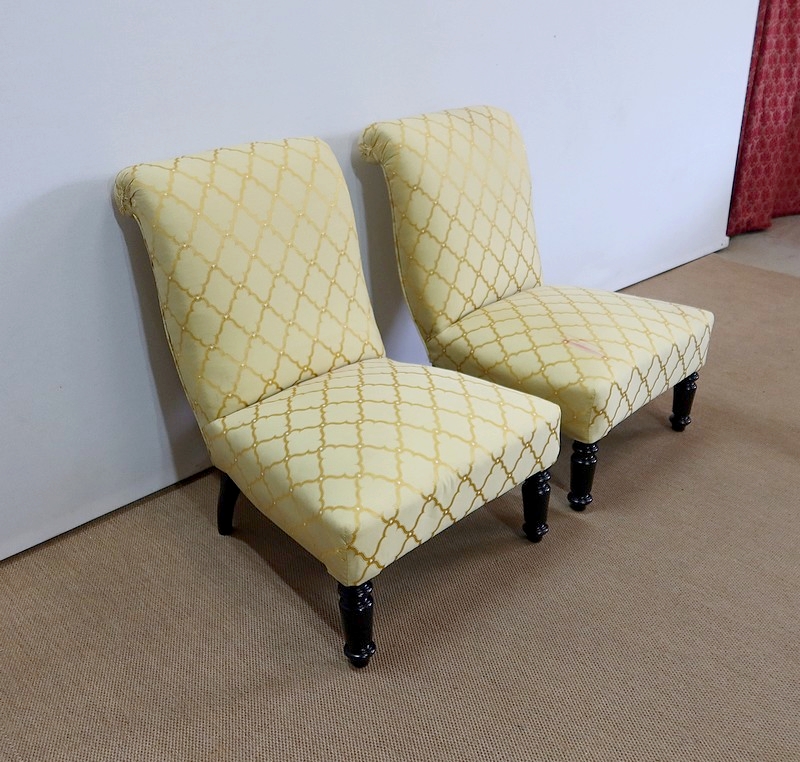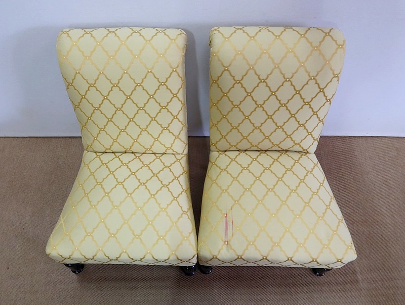 Charmante paire de chauffeuses couvertes d’un tissu jaune pastel décoré d’arabesques dorées et entrelacées. Ces sièges refaits à neufs il y a peu bénéficient d’une assise traditionnelle confortable en parfait état faite de sangles, de ressorts et de crin.