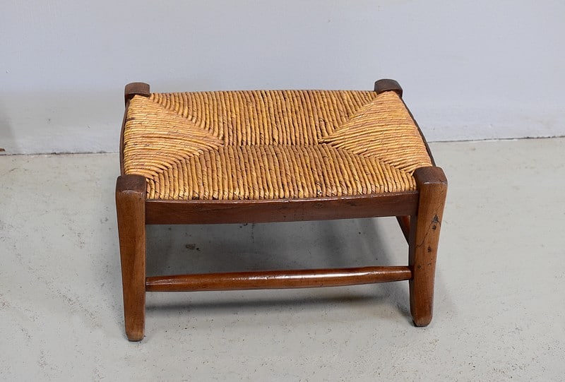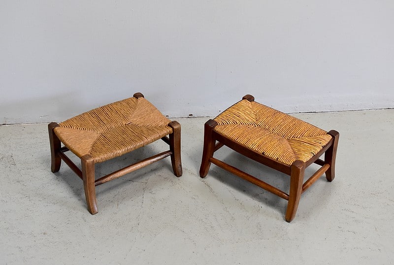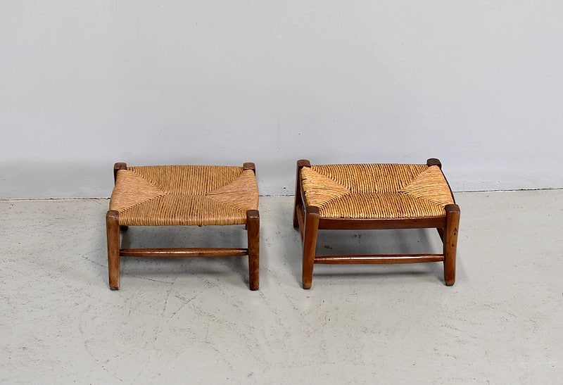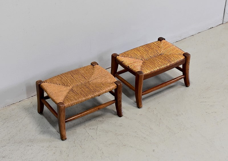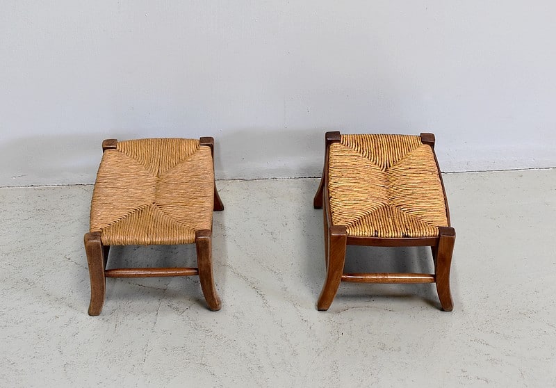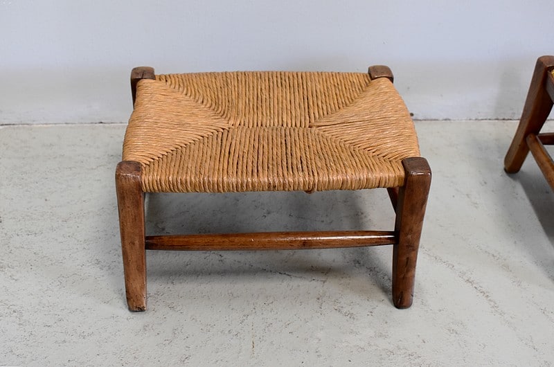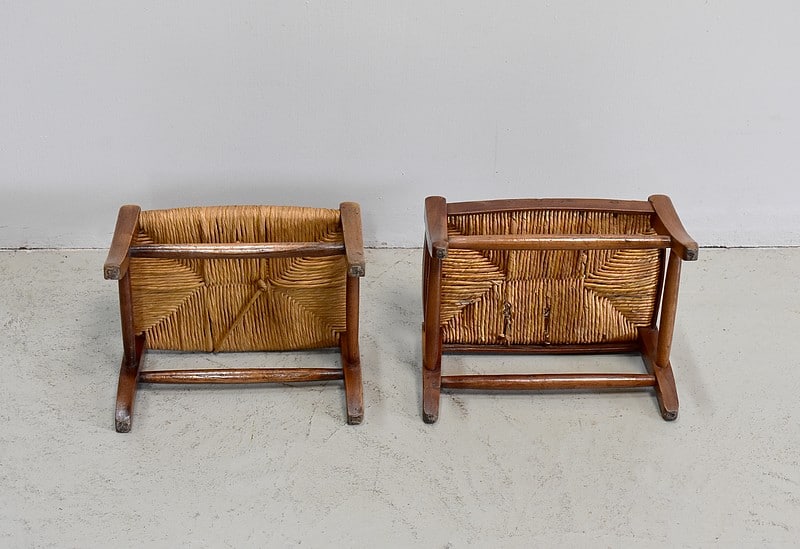Paire de petits repose-pieds paillés pour enfants en merisier.