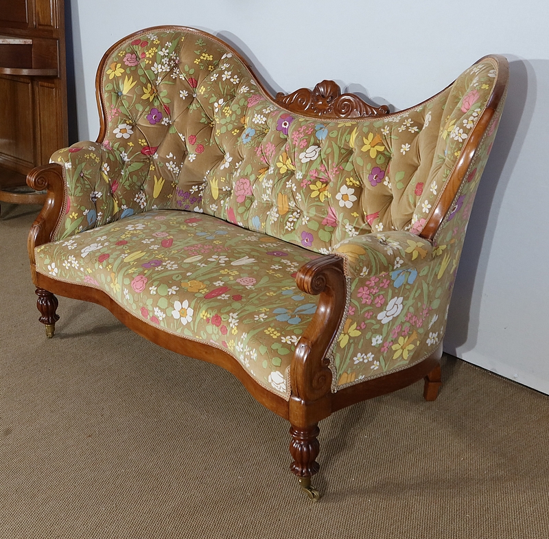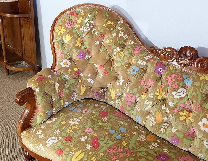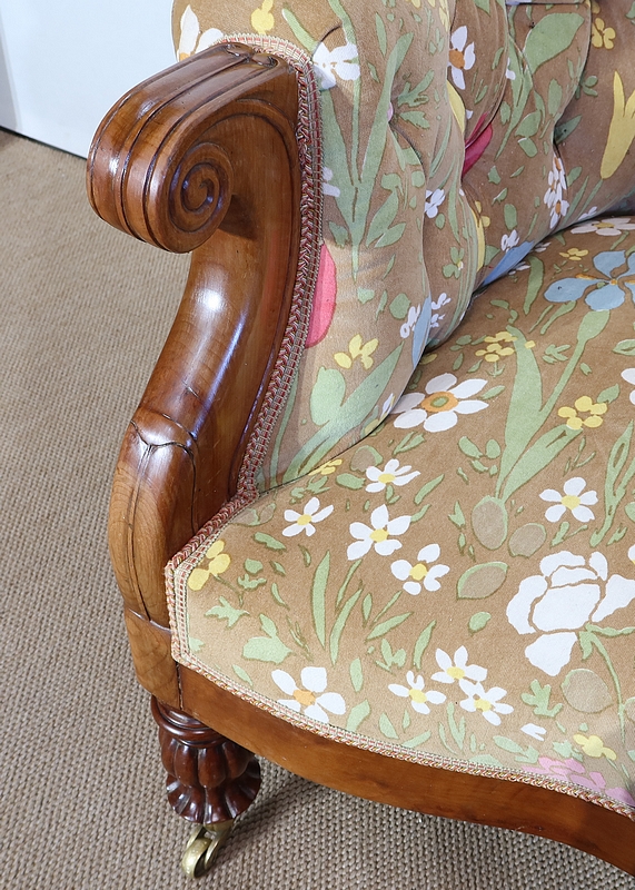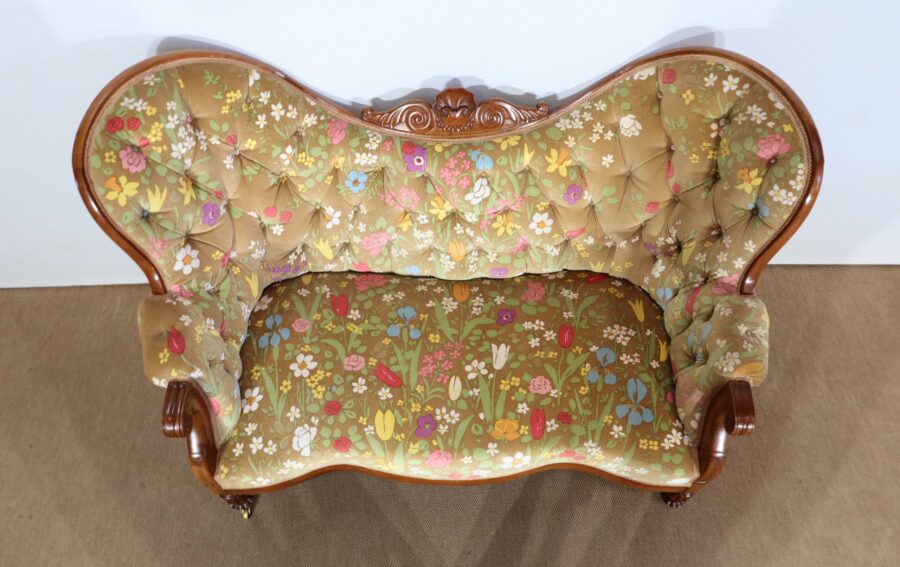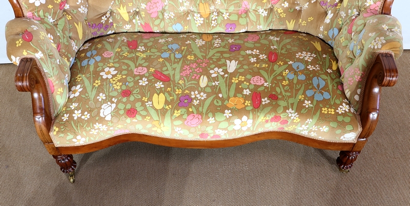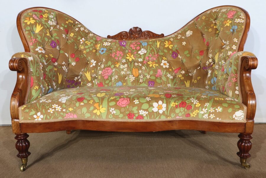 En façade, une ceinture à mouvement concave repose sur des pieds tournés, godronnés et sur roulettes. A l’arrière, des pieds sabres soutiennent ce canapé.