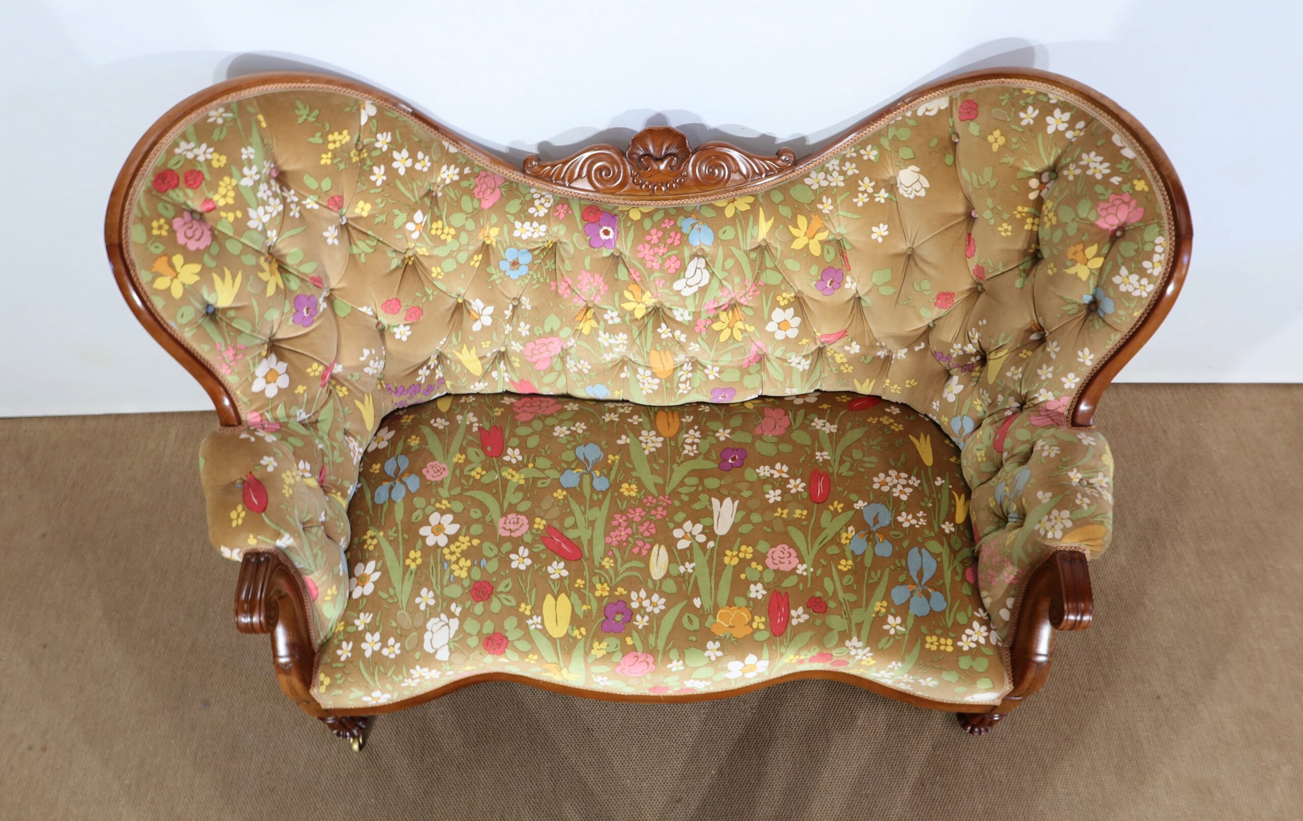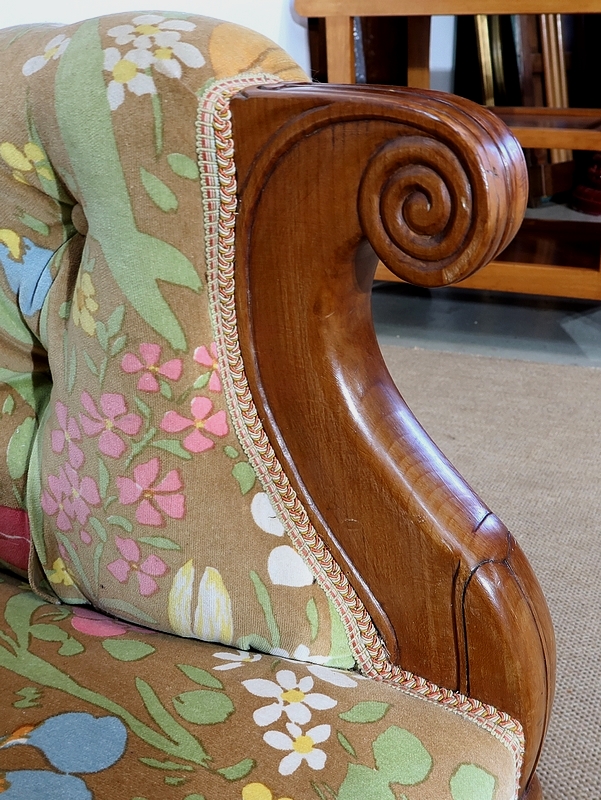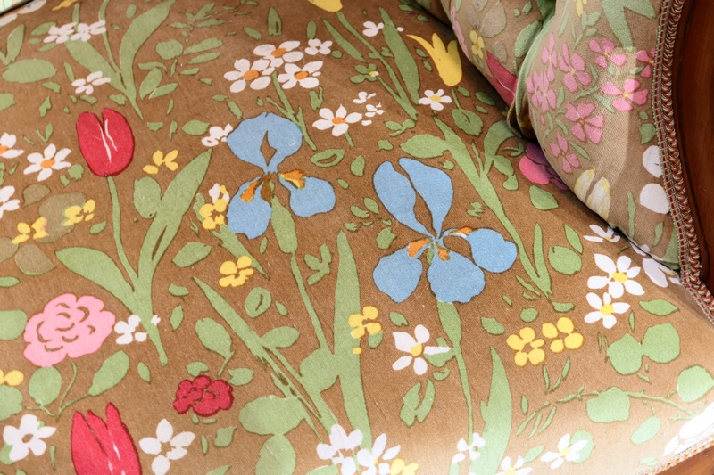 Un tissu printanier multicolore en parfait état recouvre ce canapé harmonieux.