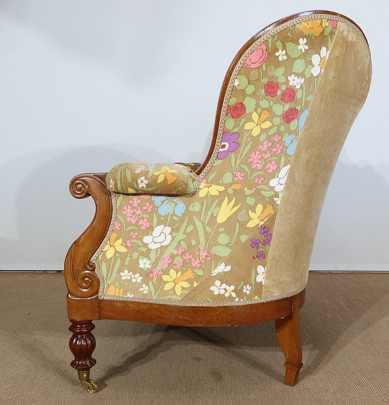 Charmant canapé en merisier aux formes courbes doté d’un large dossier capitonné présentant deux oreilles latérales prononcées. La partie centrale est creusée, en bois sculpté, formant une coquille accompagnée de volutes.