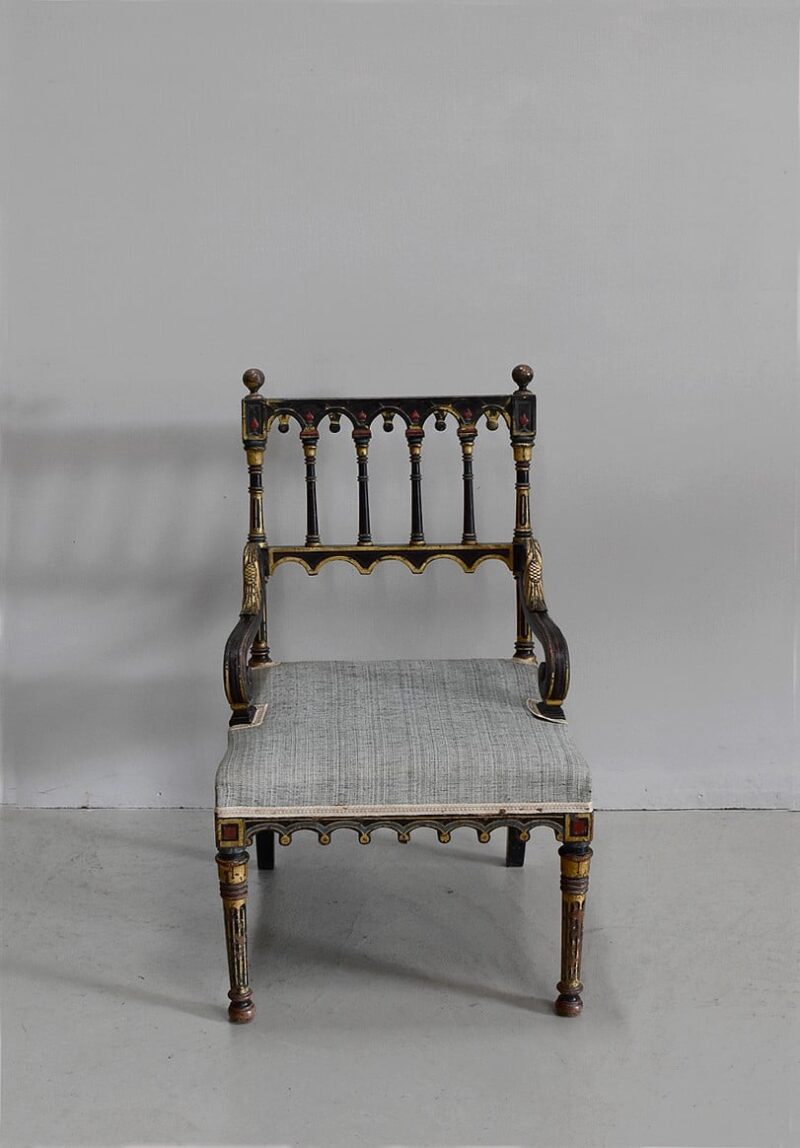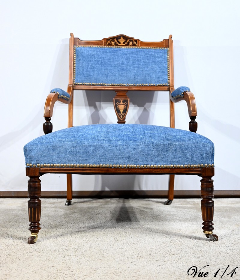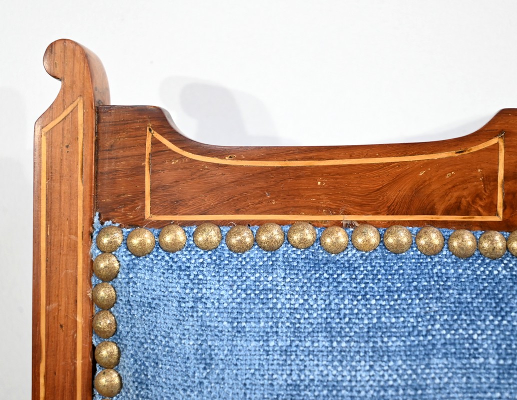 Ce petit fauteuil présente une fine ceinture reposant à l’avant sur des pieds tournés en palissandre souligné de filet de citronnier et se terminant par de petites roulettes en laiton.