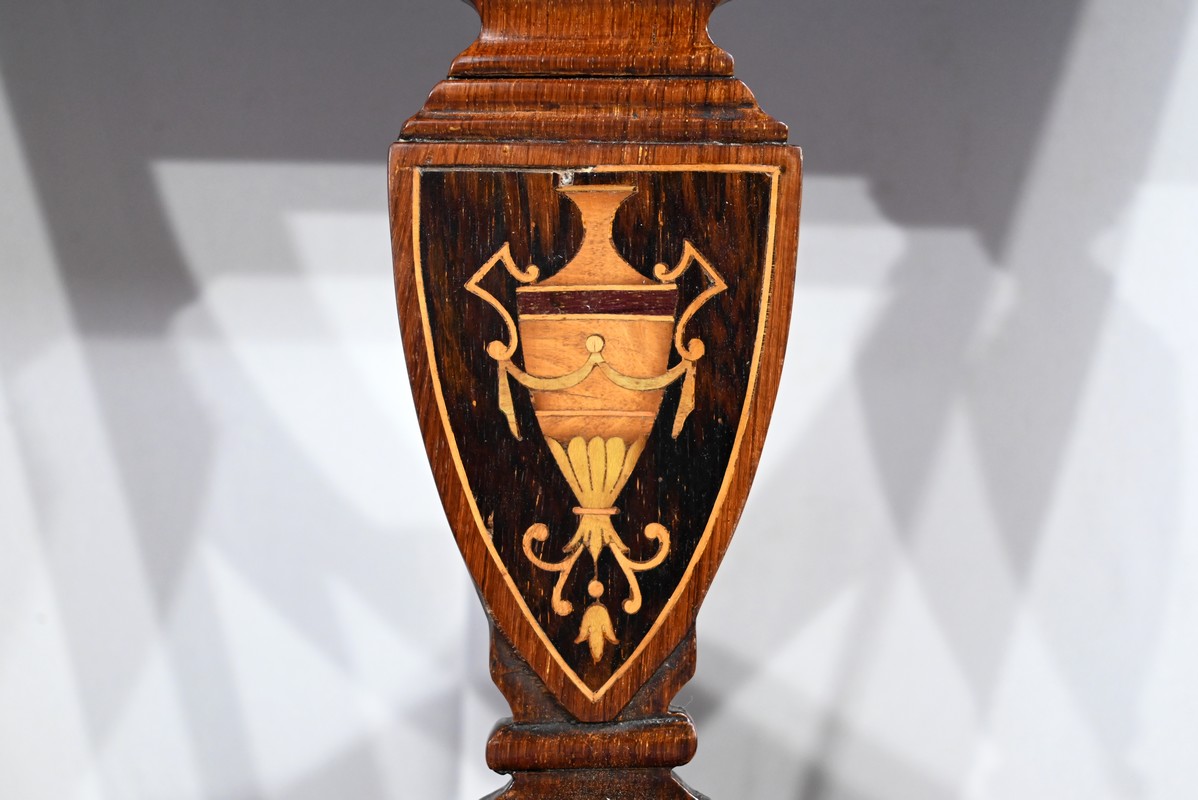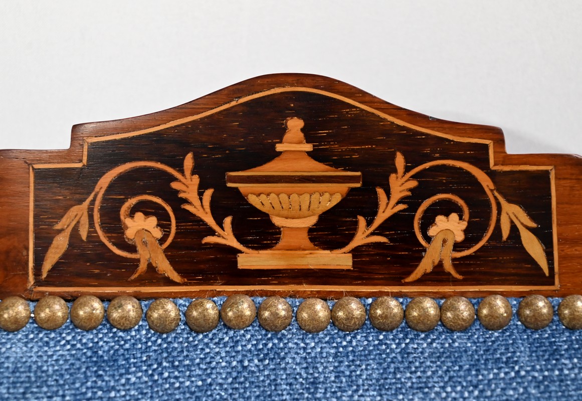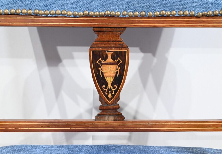 Ces accotoirs rejoignent un dossier droit ajouré orné d’une marqueterie en citronnier sur fond de palissandre à décor de vase, de soupière, de volutes et par ailleurs agrémenté de filets.