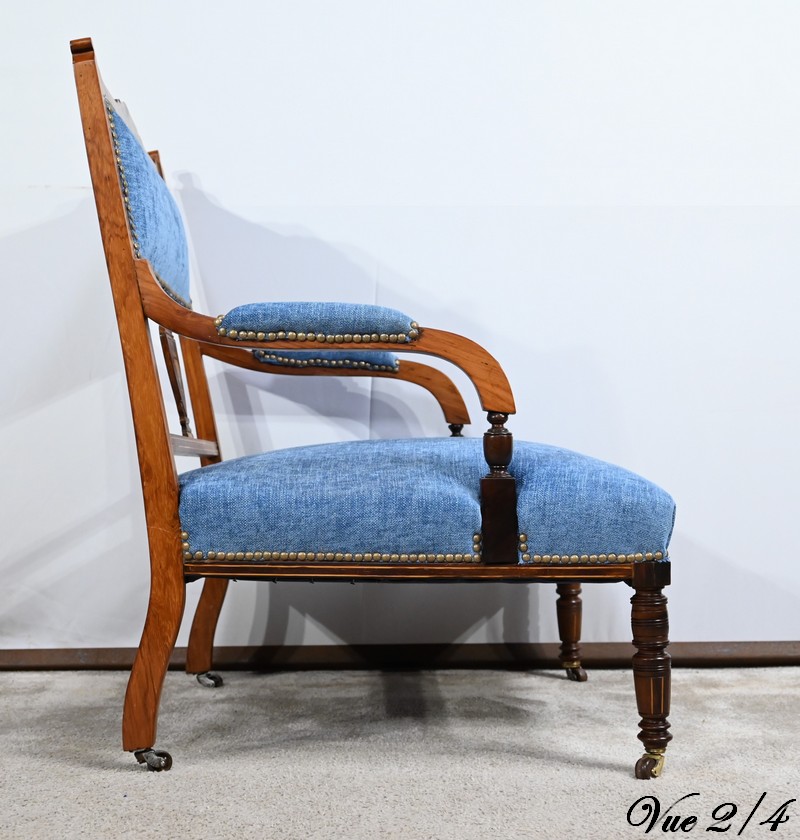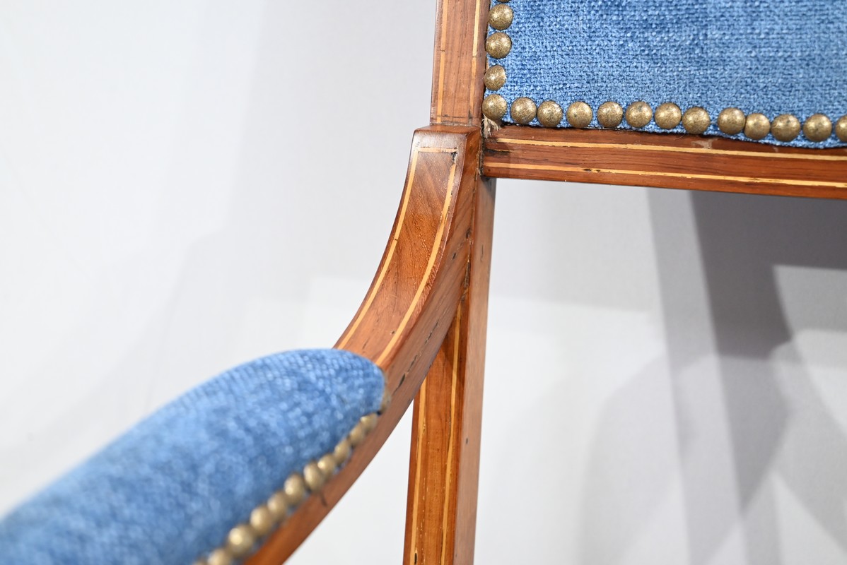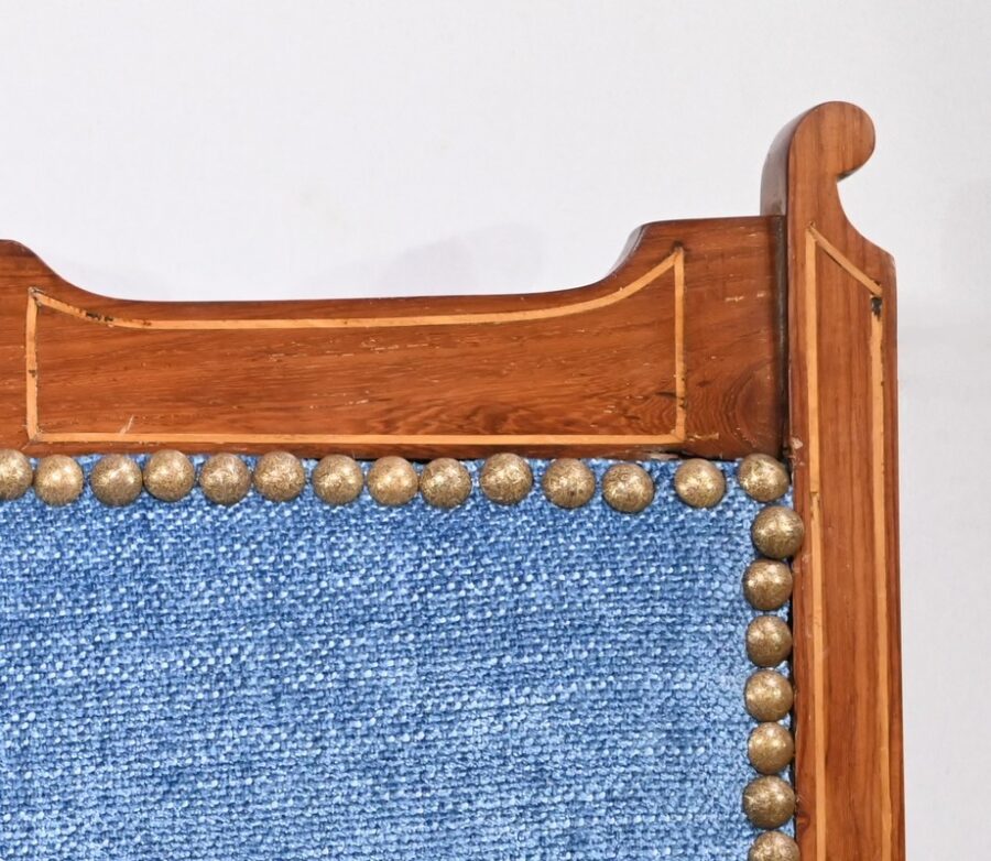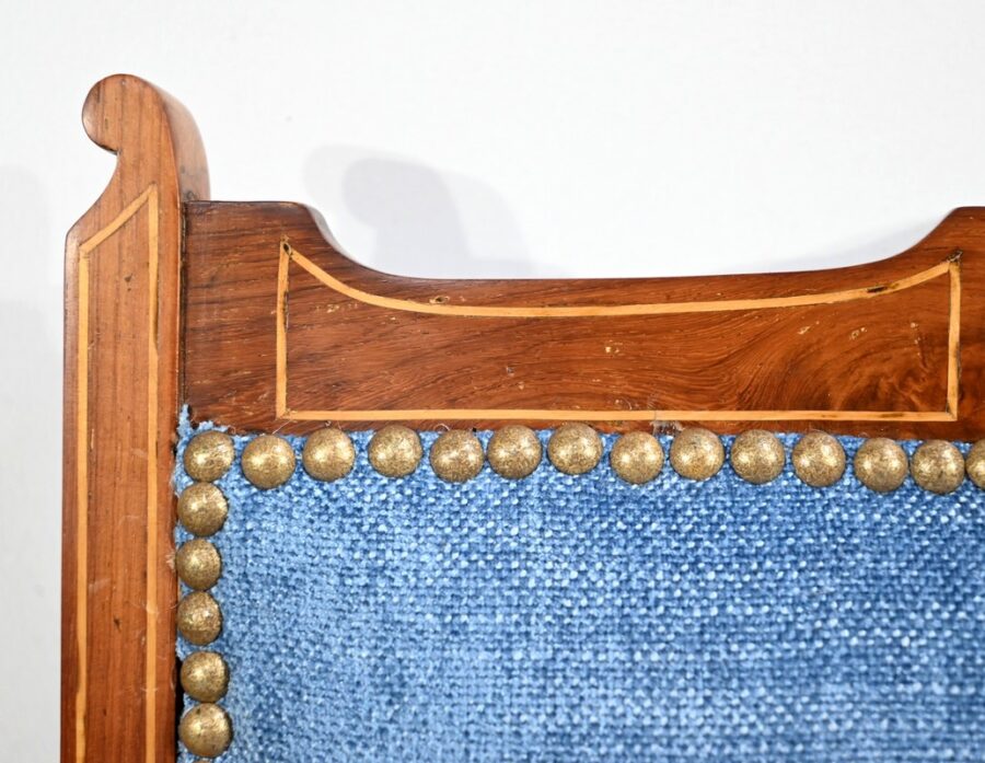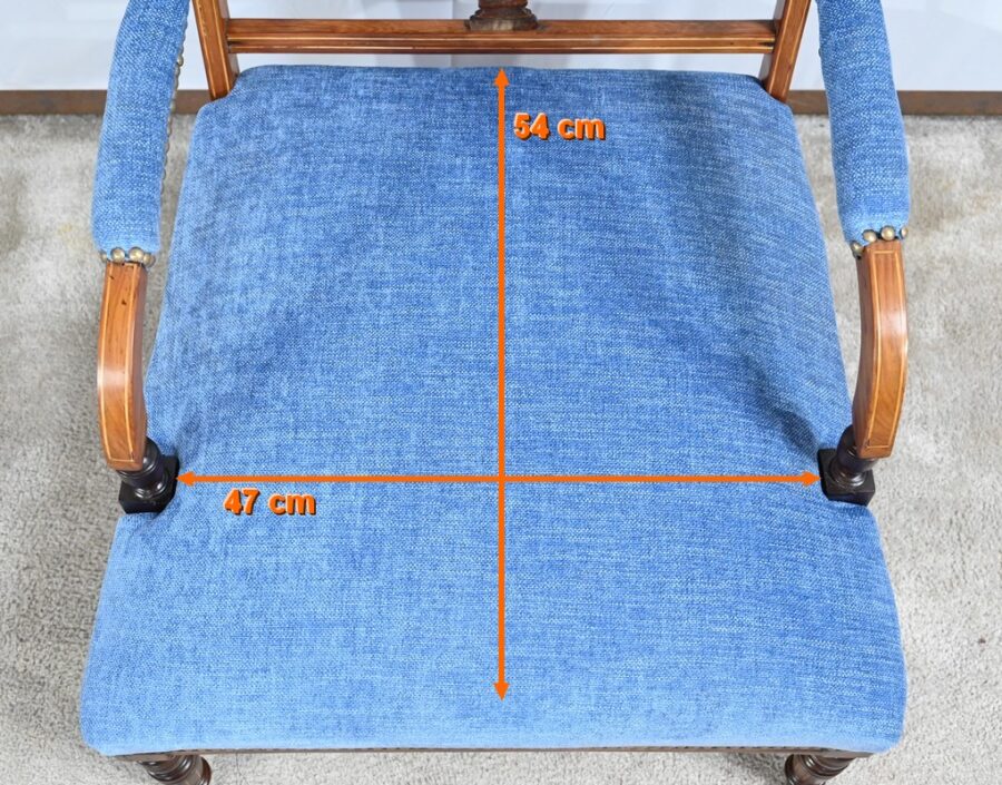L’assise à sangle et à ressorts est habillée, tout comme le dossier et les manchettes, d’un tissu bleu refait à clous légèrement vieillis.