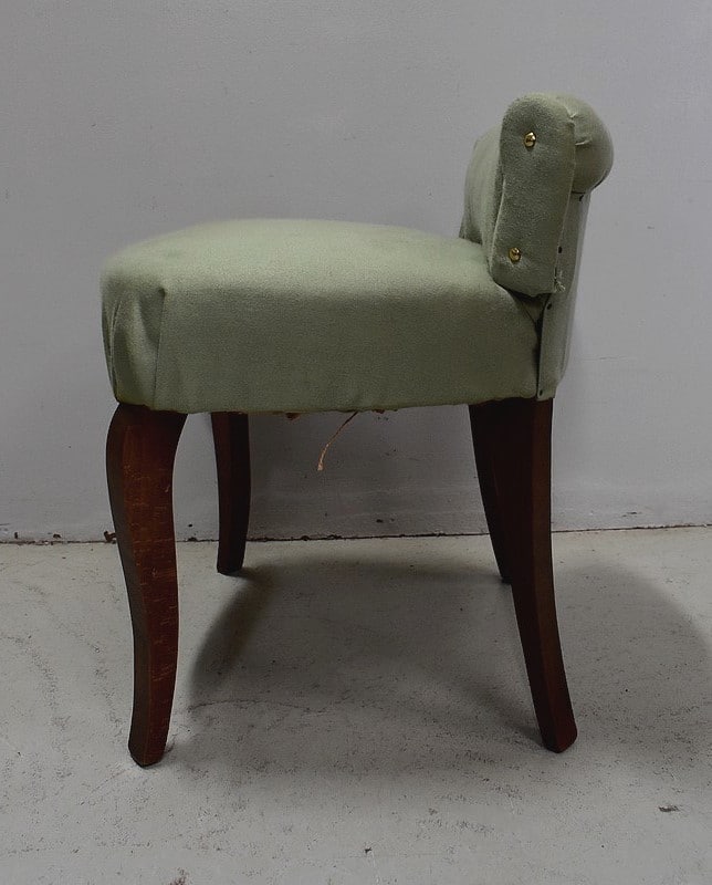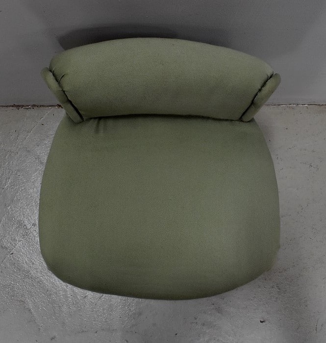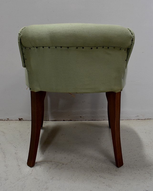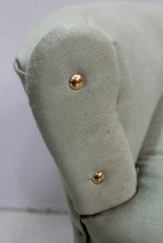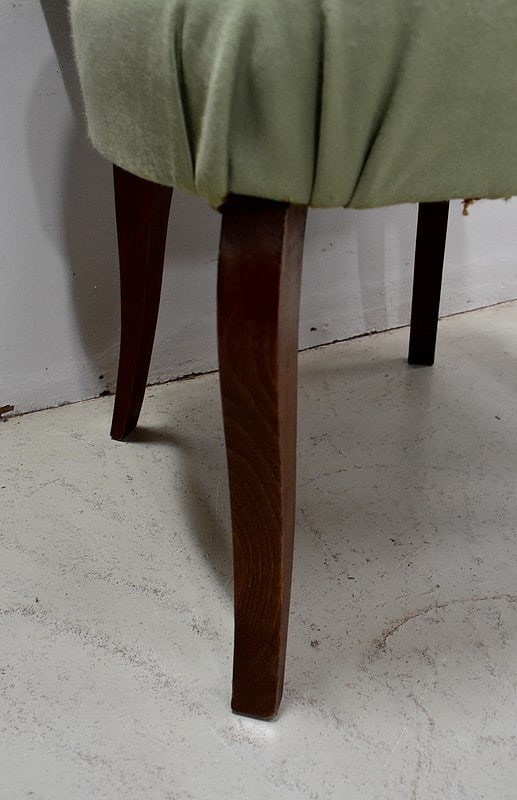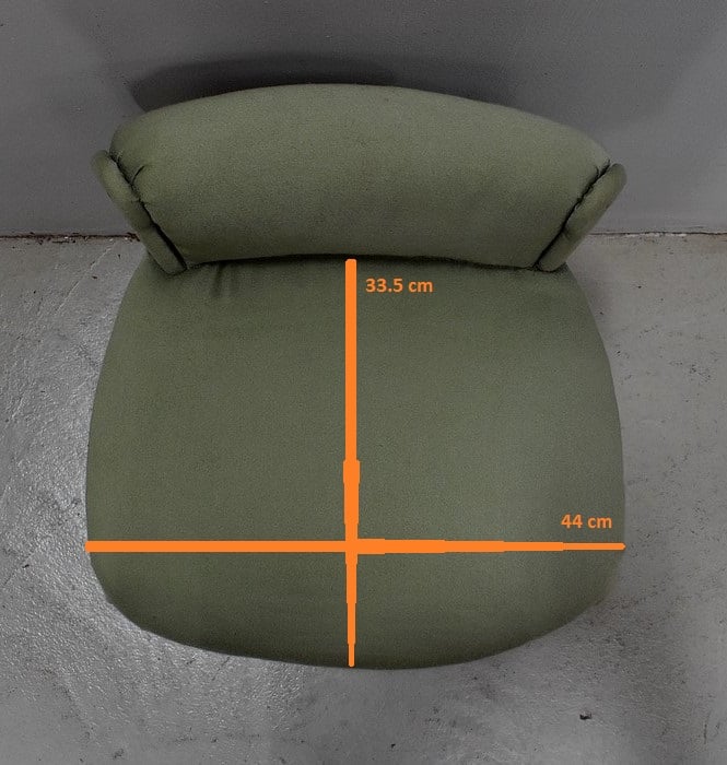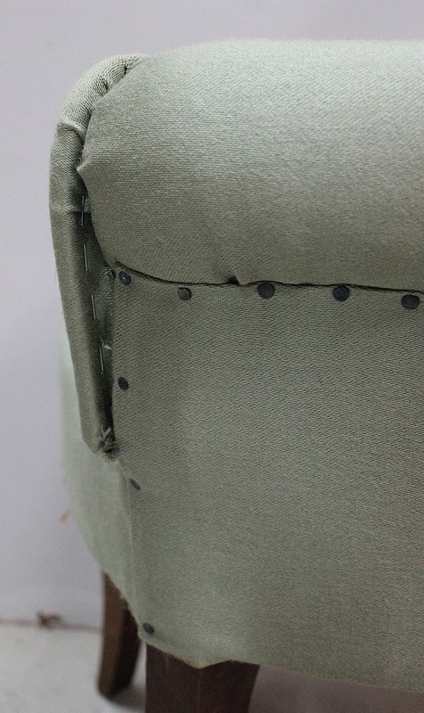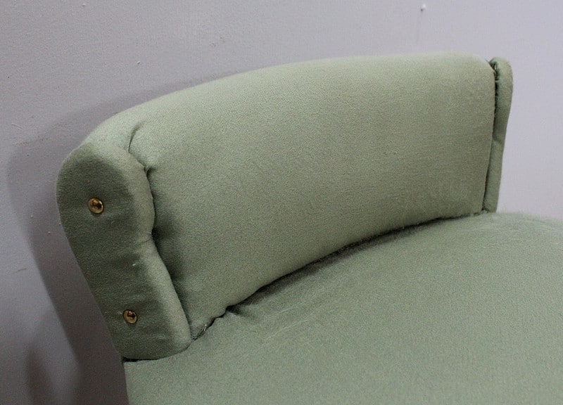 Siège avec assise basse et petit dossier recouverts d’un Tissu de couleur Verte en très bon état. Il a été posé volontairement plissé sur les angles avant, apportant ainsi du relief à l’assise. Ce revêtement est maintenu à l’arrière du Siège par des séries de petits clous gris, tandis que des Dorés fixés par Paire agrémentent les côtés du dossier.