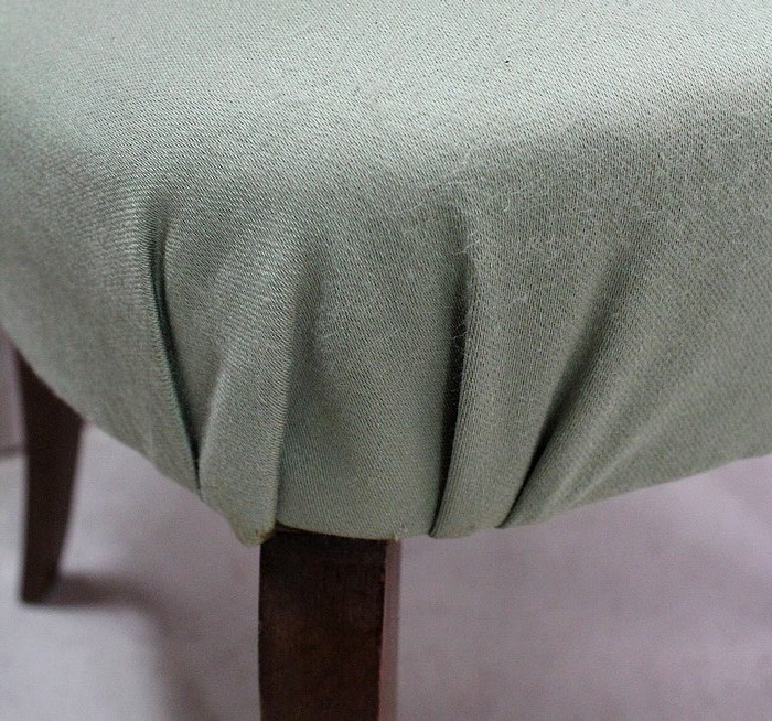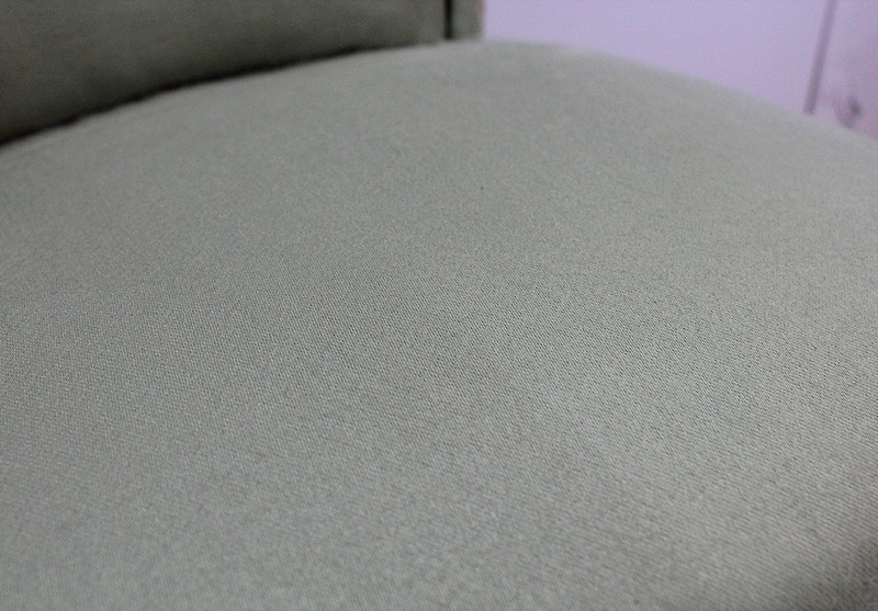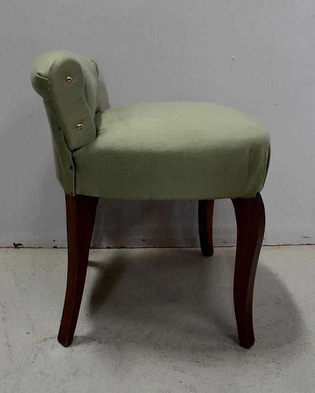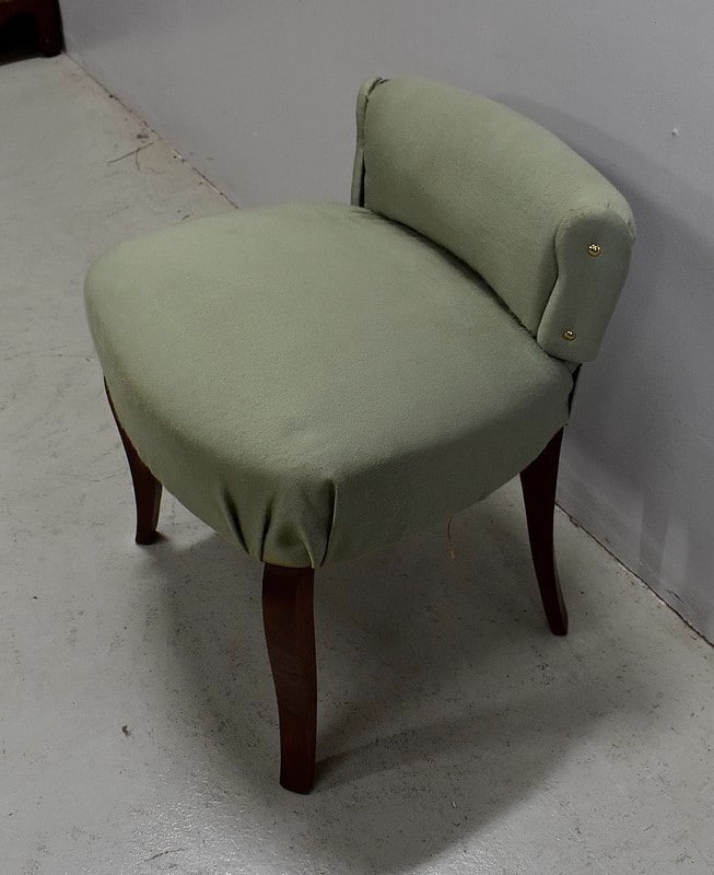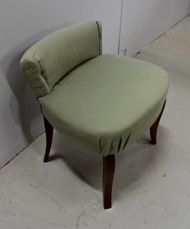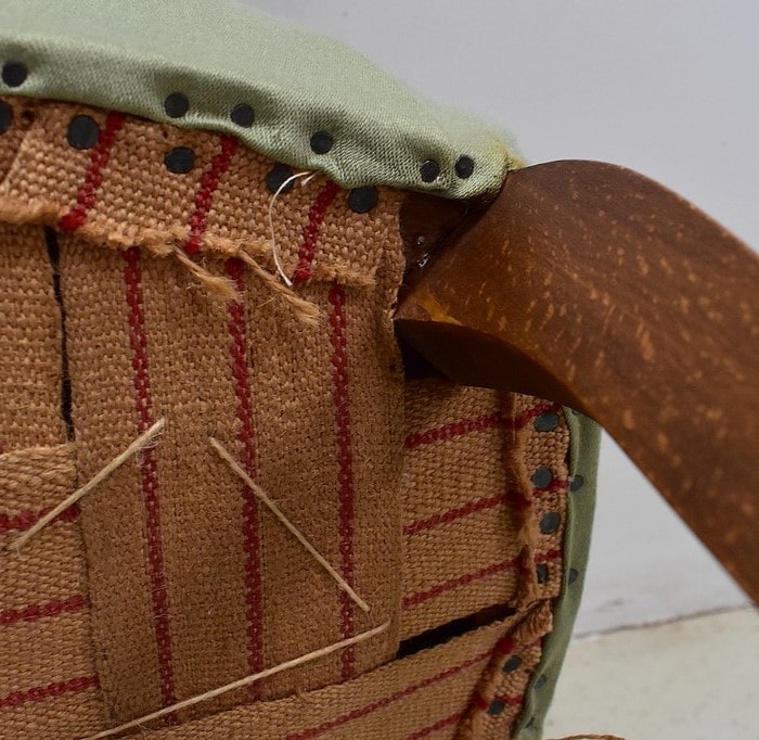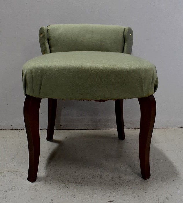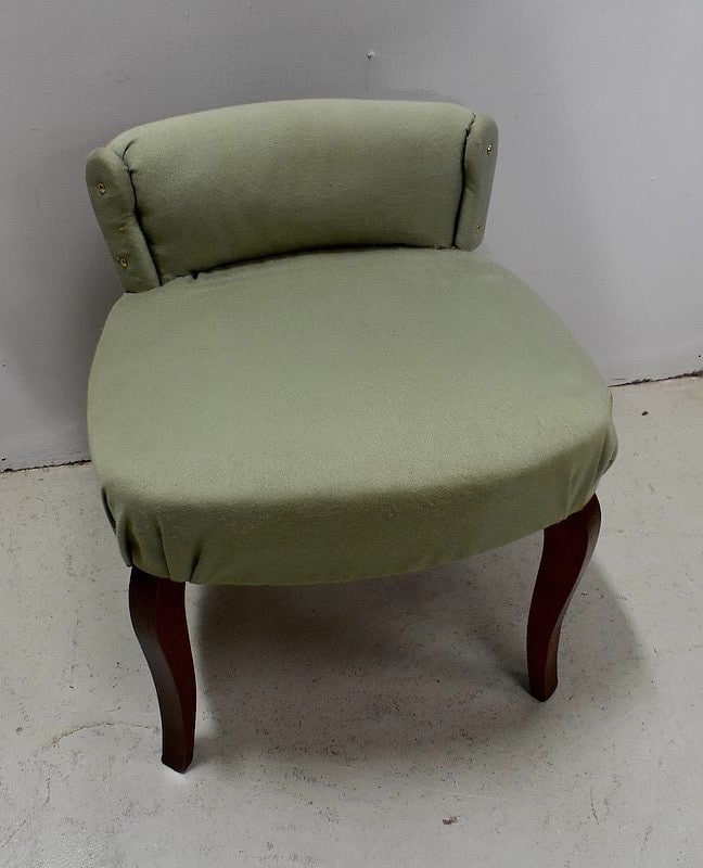 Siège avec assise basse et petit dossier recouverts d’un Tissu de couleur Verte en très bon état. Il a été posé volontairement plissé sur les angles avant, apportant ainsi du relief à l’assise. Ce revêtement est maintenu à l’arrière du Siège par des séries de petits clous gris, tandis que des Dorés fixés par Paire agrémentent les côtés du dossier.