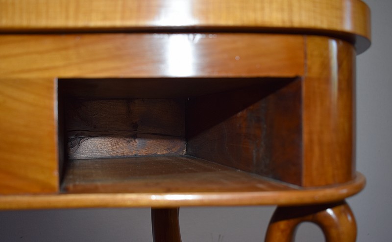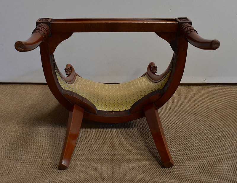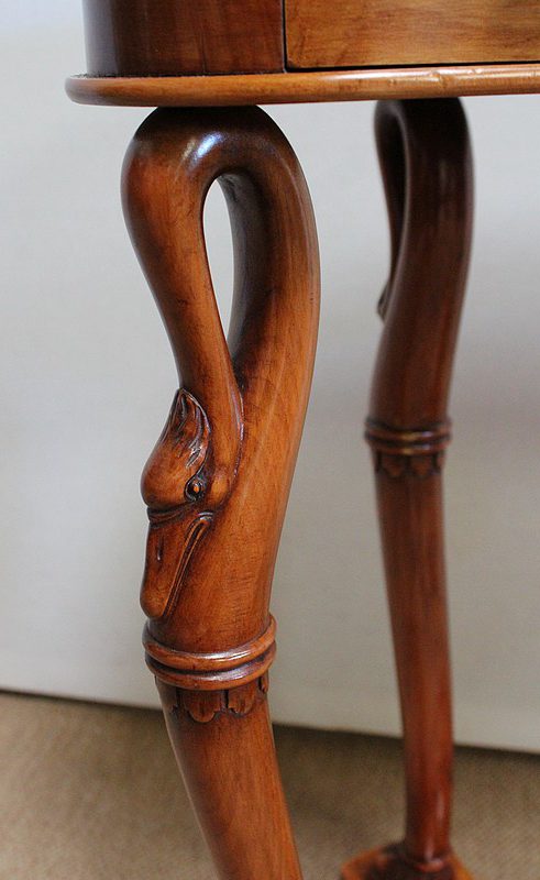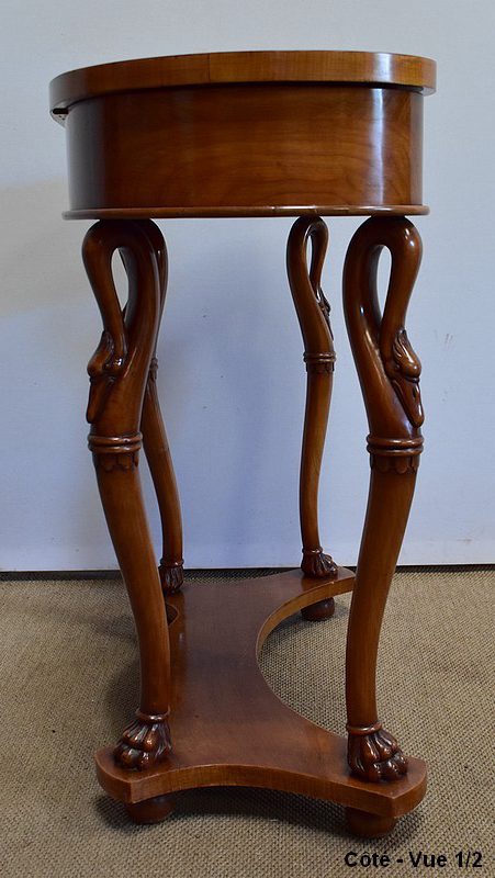 Ensemble de deux meubles en Merisier, constitué, en premier lieu, d’une petite coiffeuse de forme rognon, dans le goût retour d’Égypte. Son dessus, avec encadrement et placage de fil au centre, s’ouvre sur un intérieur compartimenté garni de fonds amovibles en tissu. Cette coiffeuse offre également un miroir au pourtour souligné par une large moulure, et aux lignes épousant celles de l’abattant. On ajoutera que, afin de préserver l’intimité de cet espace, il est équipé d’une serrure d’origine en état de fonctionnement et accompagnée de sa clé. En ceinture, ce meuble propose deux petits tiroirs à boutons lentilles en laiton, dans lesquels on retrouvera des fonds identiques à ceux décrits précédemment. Cette coiffeuse toutes faces se compose de quatre montants en merisier massif, sculptés en élégants cols de cygnes et terminés en griffes. Ils reposent sur une entretoise aux bords largement découpés, elle-même installée sur quatre pieds boules.