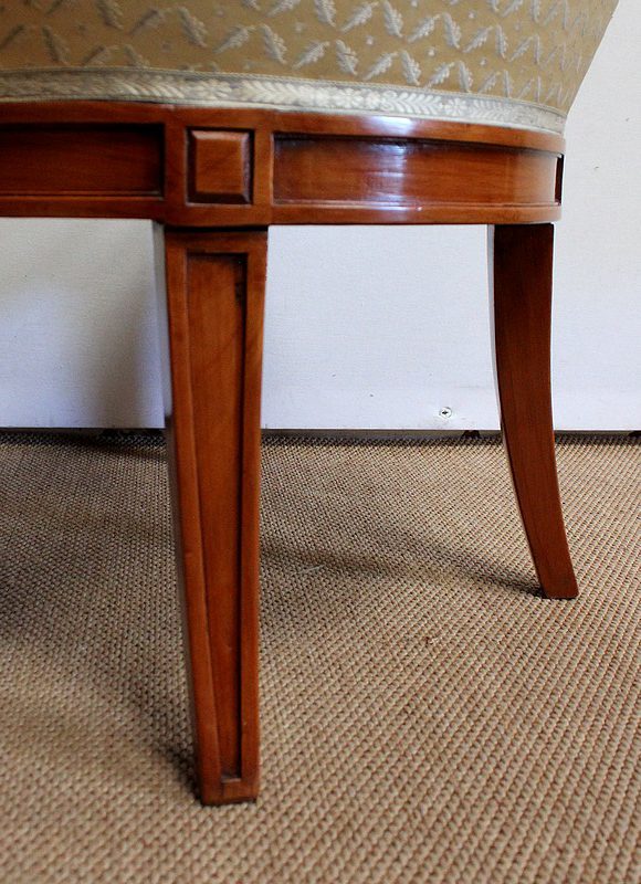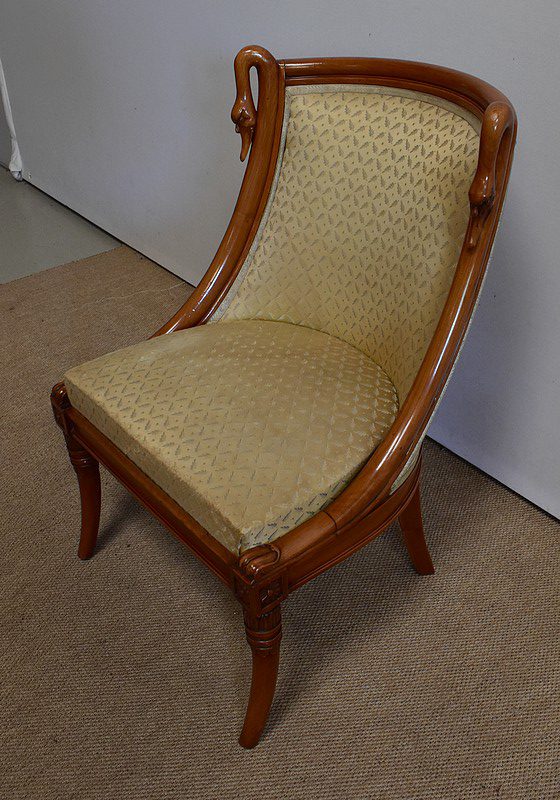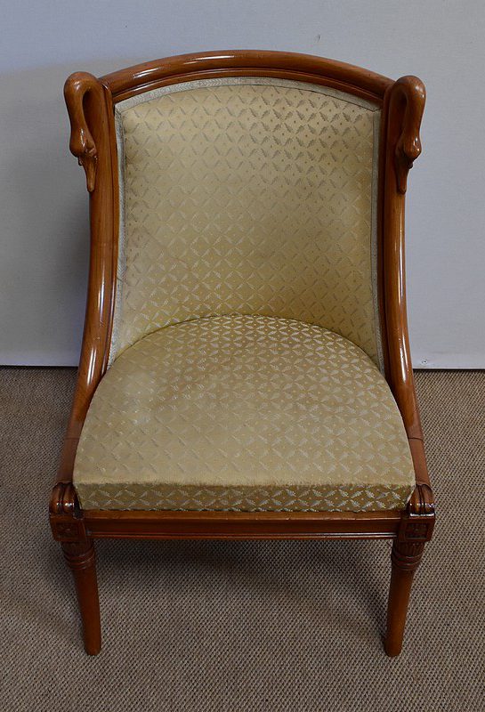 On associera à ce meuble une ravissante chauffeuse, à structure en merisier massif. Son dossier, idéalement incurvé, ainsi que son assise, équerrée, sont recouverts d’un tissu jaune champagne à motifs feuillagés, commun à celui utilisé pour la coiffeuse. On retrouvera également sur les montants les gracieux palmipèdes blancs. Ce siège repose sur quatre pieds sabres sommés, pour ceux de l’avant, de dés de raccordement à décors de fleurs.