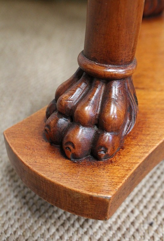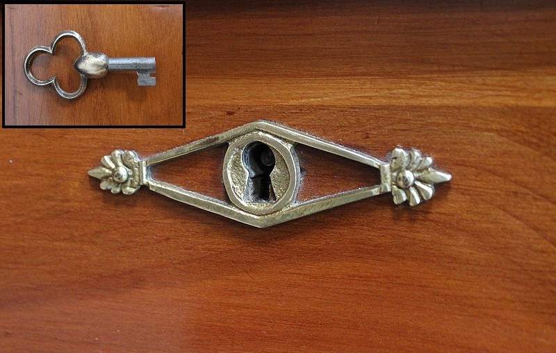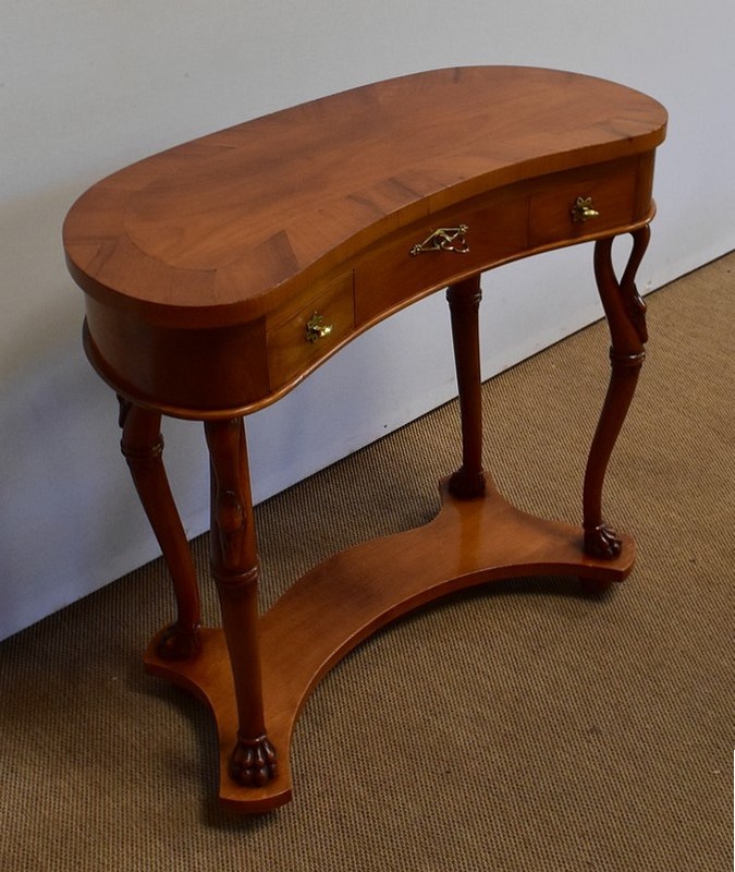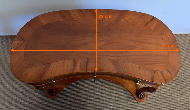 Ensemble de deux meubles en Merisier, constitué, en premier lieu, d’une petite coiffeuse de forme rognon, dans le goût retour d’Égypte. Son dessus, avec encadrement et placage de fil au centre, s’ouvre sur un intérieur compartimenté garni de fonds amovibles en tissu. Cette coiffeuse offre également un miroir au pourtour souligné par une large moulure, et aux lignes épousant celles de l’abattant. On ajoutera que, afin de préserver l’intimité de cet espace, il est équipé d’une serrure d’origine en état de fonctionnement et accompagnée de sa clé. En ceinture, ce meuble propose deux petits tiroirs à boutons lentilles en laiton, dans lesquels on retrouvera des fonds identiques à ceux décrits précédemment. Cette coiffeuse toutes faces se compose de quatre montants en merisier massif, sculptés en élégants cols de cygnes et terminés en griffes. Ils reposent sur une entretoise aux bords largement découpés, elle-même installée sur quatre pieds boules.