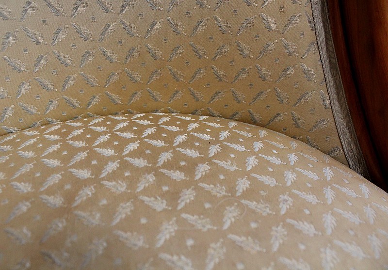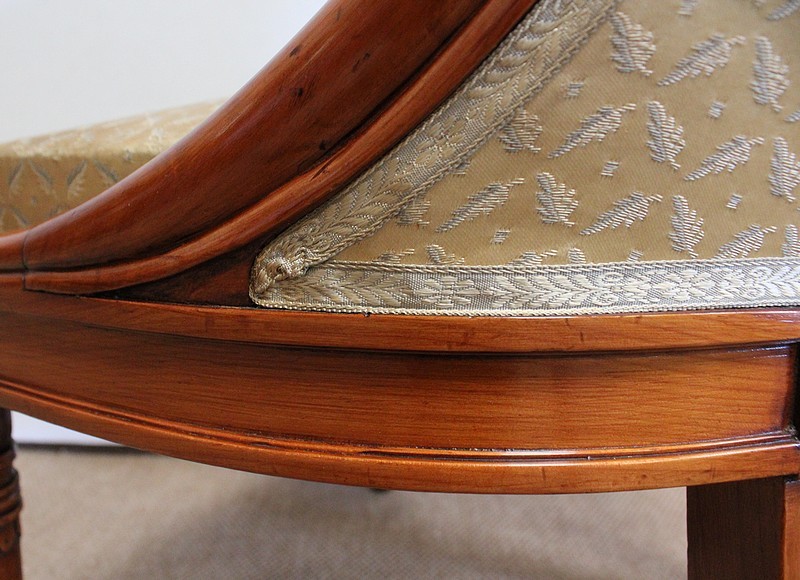 On associera à ce meuble une ravissante chauffeuse, à structure en merisier massif. Son dossier, idéalement incurvé, ainsi que son assise, équerrée, sont recouverts d’un tissu jaune champagne à motifs feuillagés, commun à celui utilisé pour la coiffeuse. On retrouvera également sur les montants les gracieux palmipèdes blancs. Ce siège repose sur quatre pieds sabres sommés, pour ceux de l’avant, de dés de raccordement à décors de fleurs.
