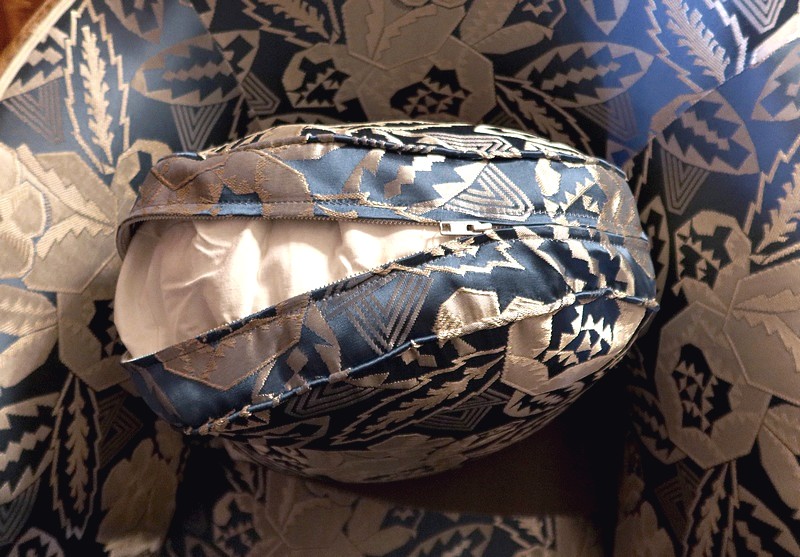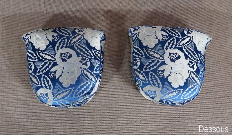 L’ensemble est habillé d’un tissu bleu reflétant la lumière décoré de motifs dorés de style Art déco représentant des fleurs et des feuilles. La finition est parfaite avec autour du bois un galon dit passe poil.