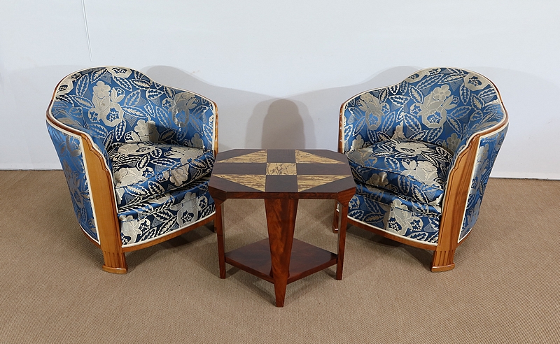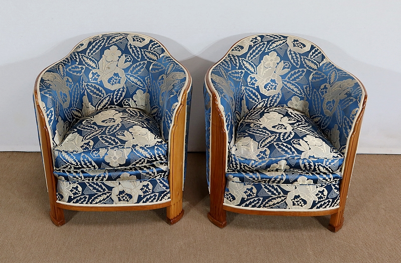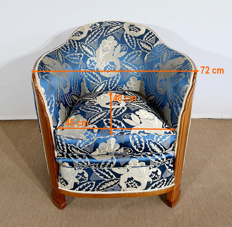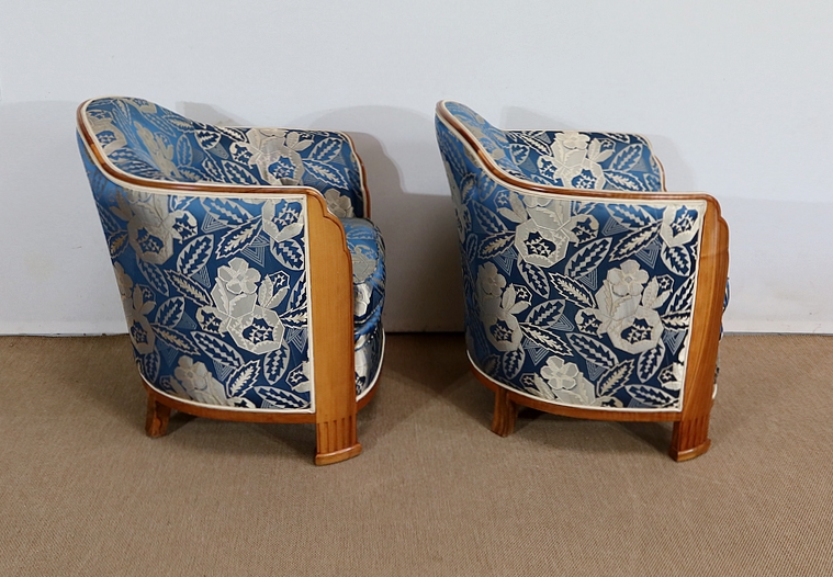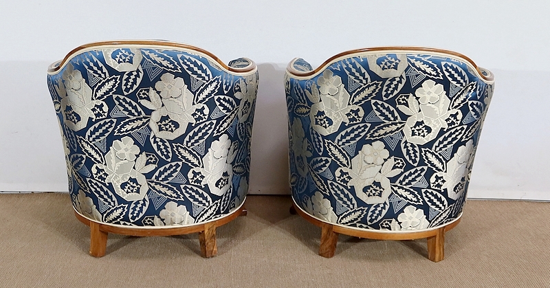 Magnifiques fauteuils de forme tonneau avec ossature en noyer massif, moulures Art Déco, dossier circulaire et soierie bleue avec motifs stylisés.
