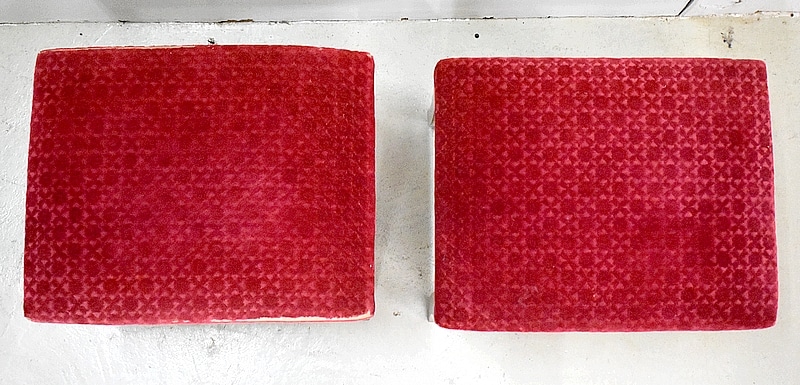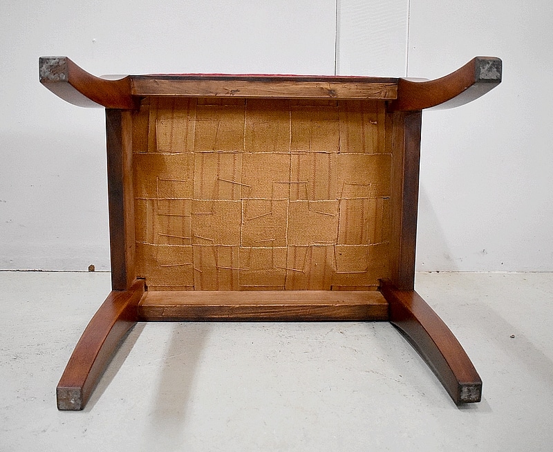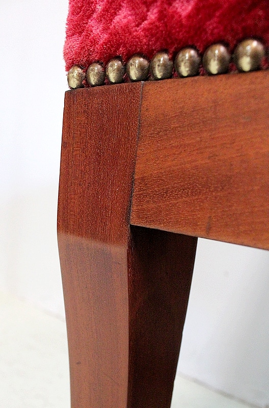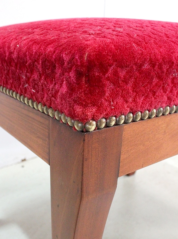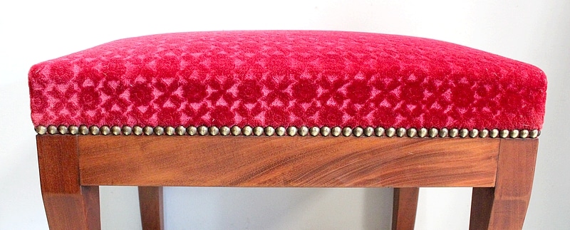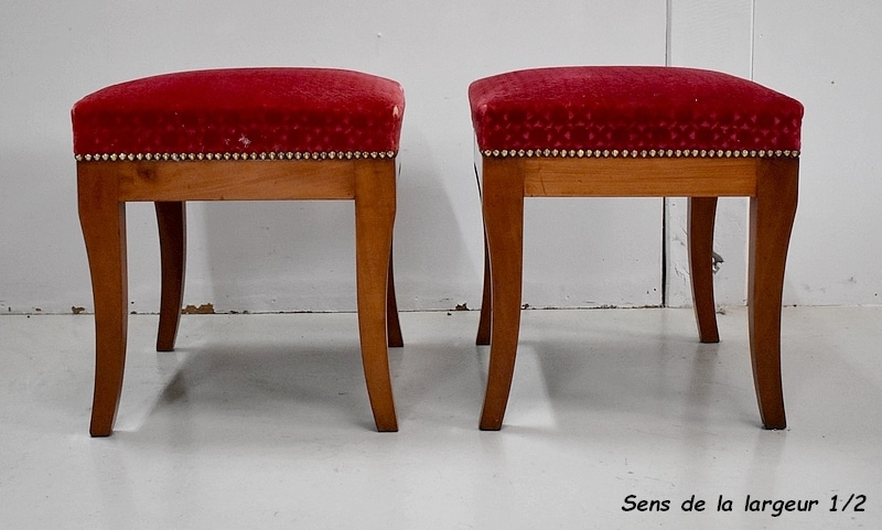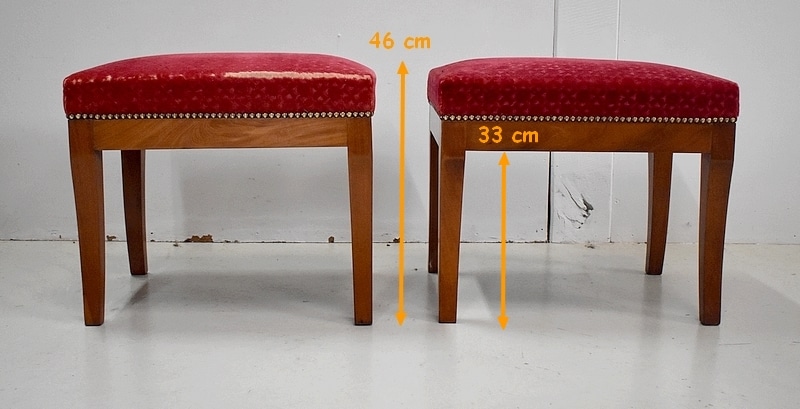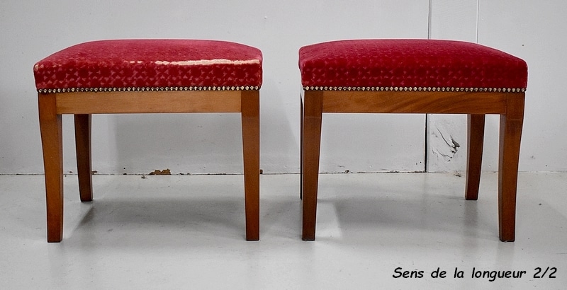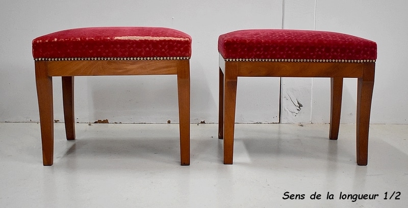 Les assises sont recouvertes d’un Tissu en Velours Rouge Frappé. Ces Tabourets, Confortable et Fermes, ont bénéficié d’une confection Qualitative et Traditionnelle avec Ressorts, Sangles et Crin Animal.