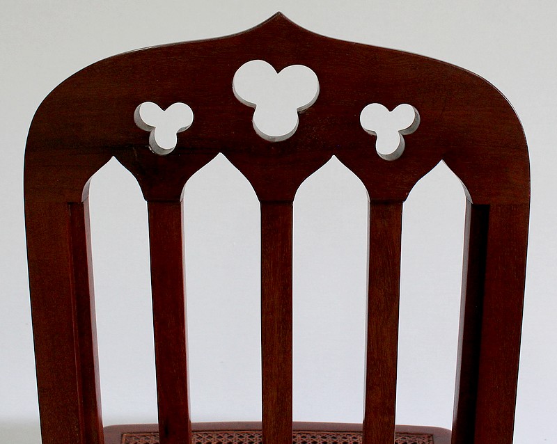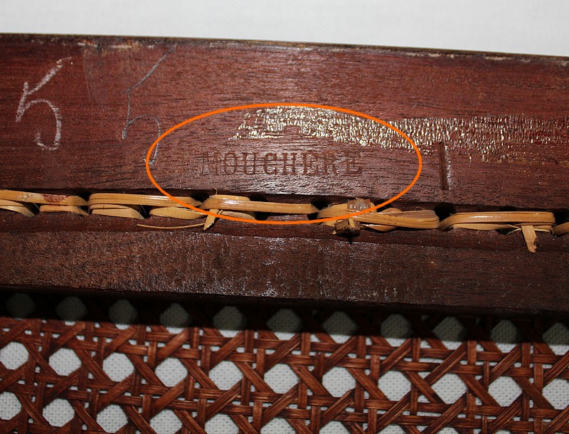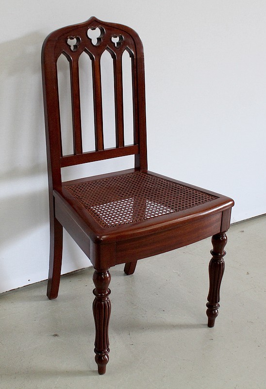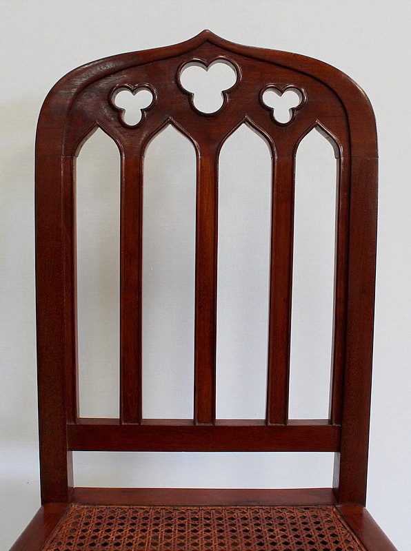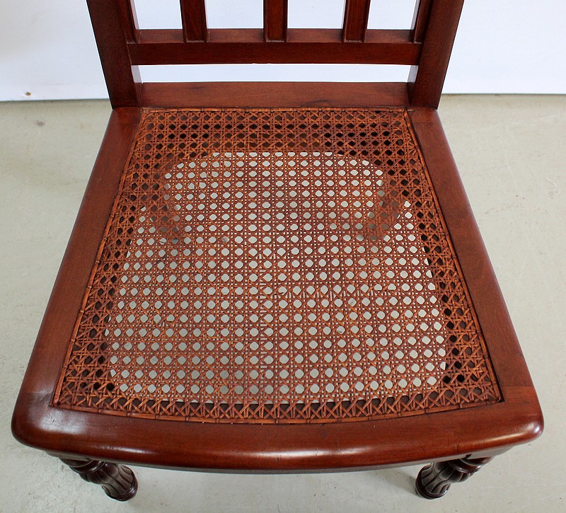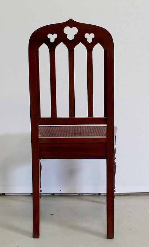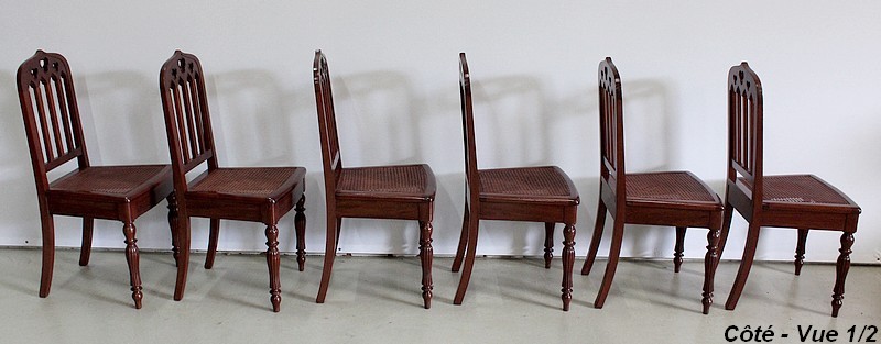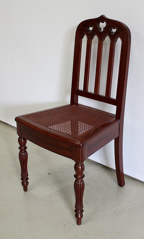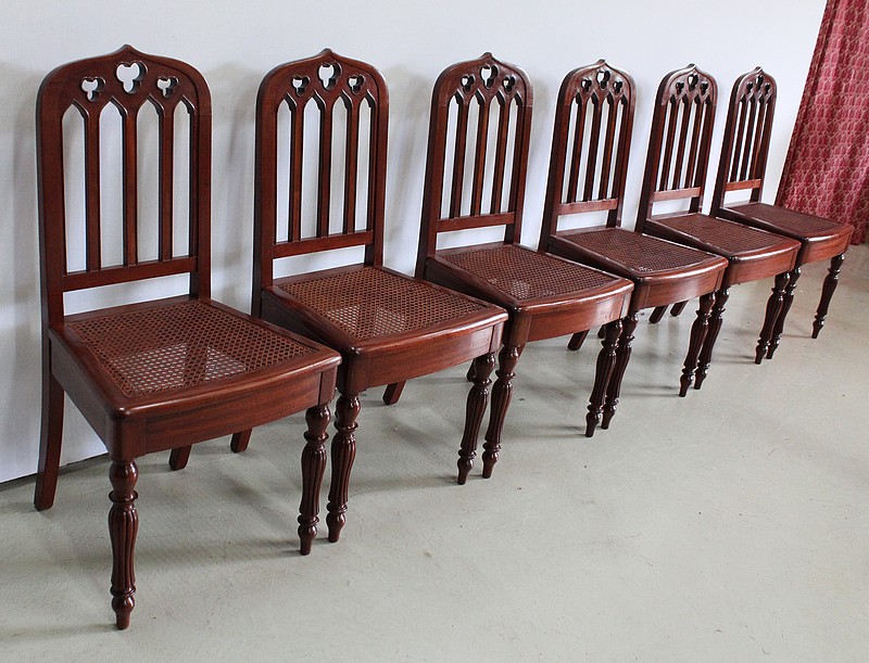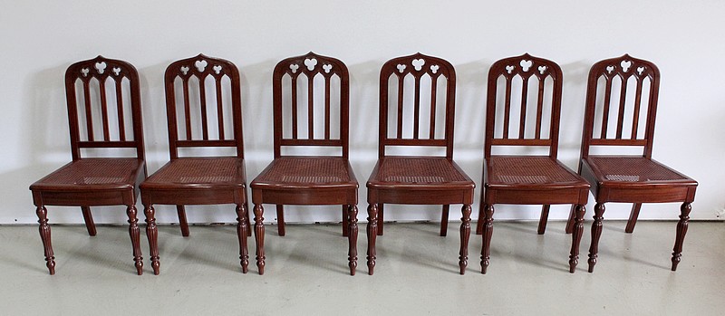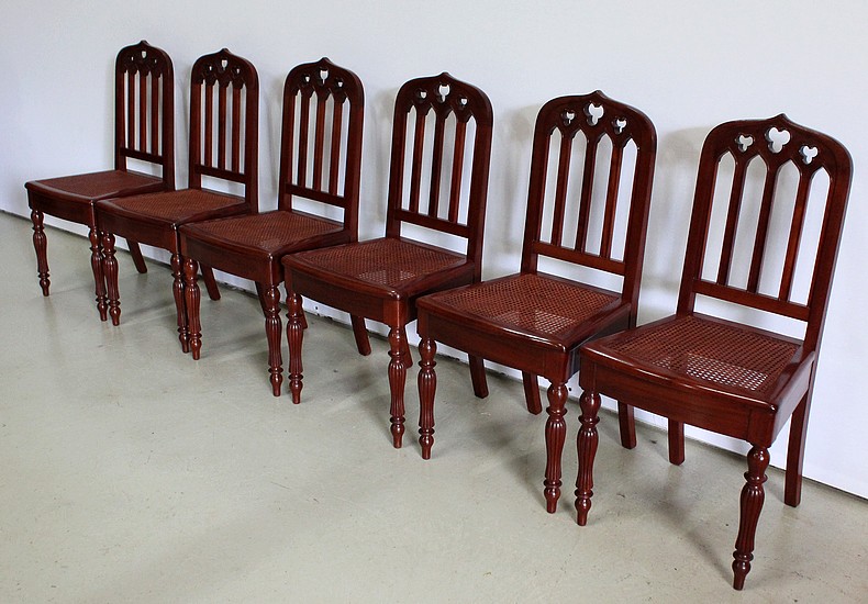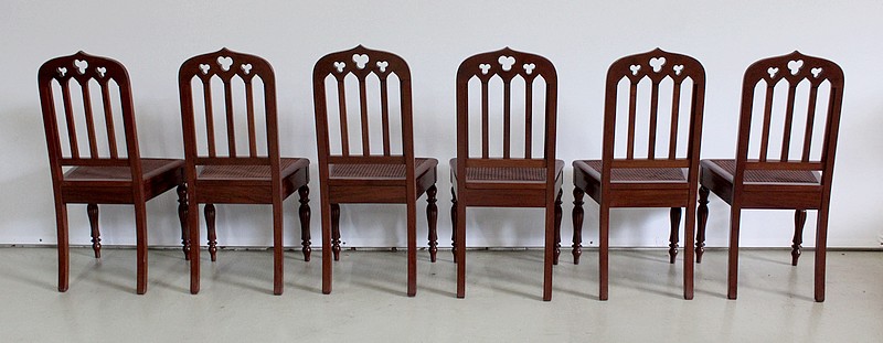 Suite de 6 Chaises en Acajou de Cuba avec Dossiers Cathédrale et Assise en Cannage, portant la marque « Mouchère ».