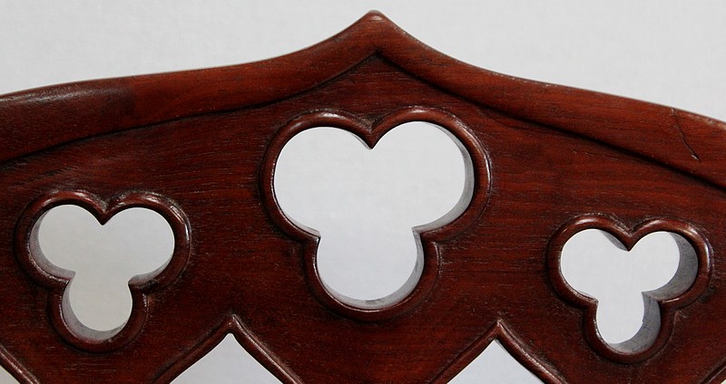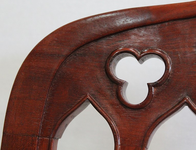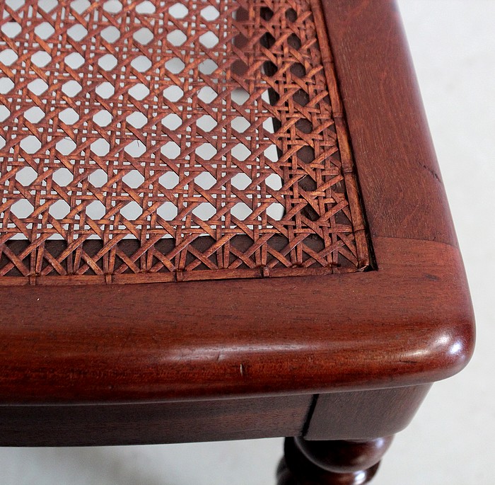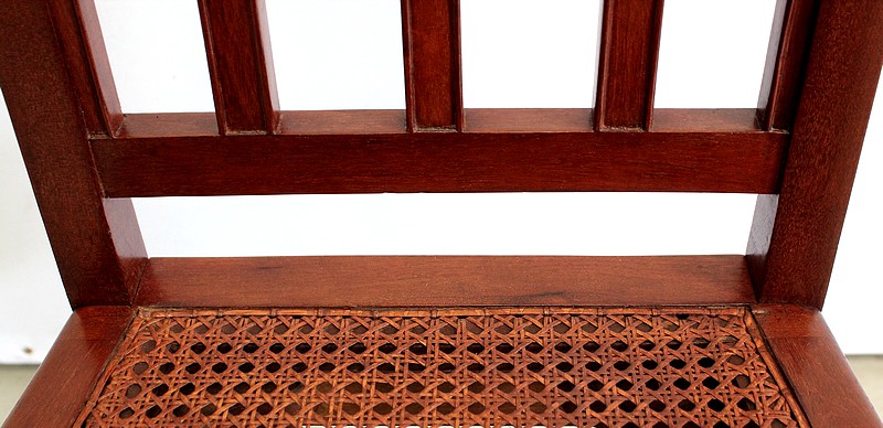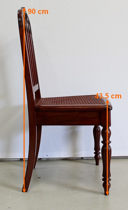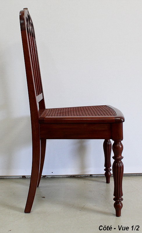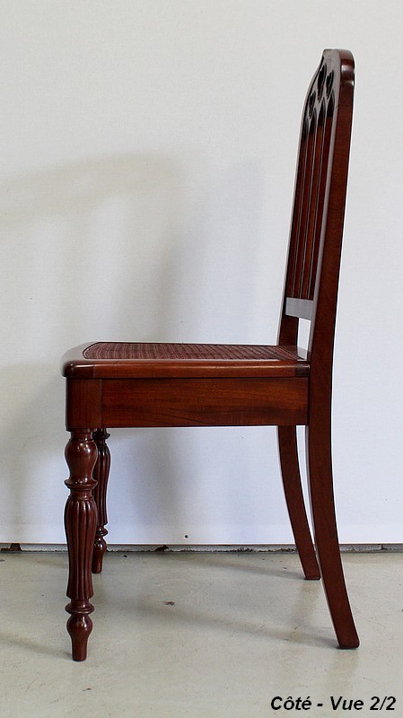 Chaque Chaise est composée d’un Dossier Ajouré à Défoncement finement travaillé, muni de trois Barreaux élégants.