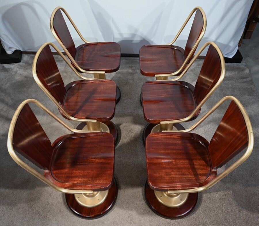 Chacun de ces 6 sièges est pivotant et composé d’acajou et de laiton. Sur la base tourne une galette en acajou dont l’arête légèrement arrondie repose en retrait d’un élément en laiton fixé par quatre vis. L’assise du siège est creusée en partie intérieure avec un léger mouvement au centre. Celle-ci repose sur un large fût cylindrique en laiton dont la partie basse comporte une grande collerette fixée sur une base circulaire en acajou massif.