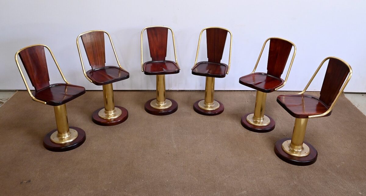 Chacun de ces 6 sièges est pivotant et composé d’acajou et de laiton. Sur la base tourne une galette en acajou dont l’arête légèrement arrondie repose en retrait d’un élément en laiton fixé par quatre vis. L’assise du siège est creusée en partie intérieure avec un léger mouvement au centre. Celle-ci repose sur un large fût cylindrique en laiton dont la partie basse comporte une grande collerette fixée sur une base circulaire en acajou massif.