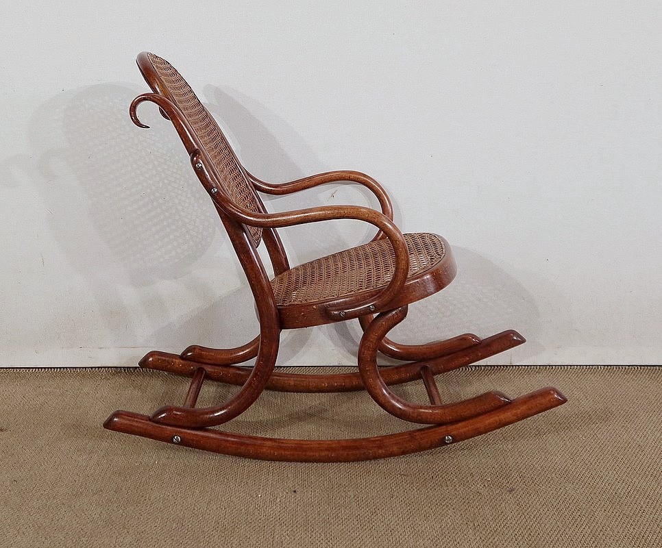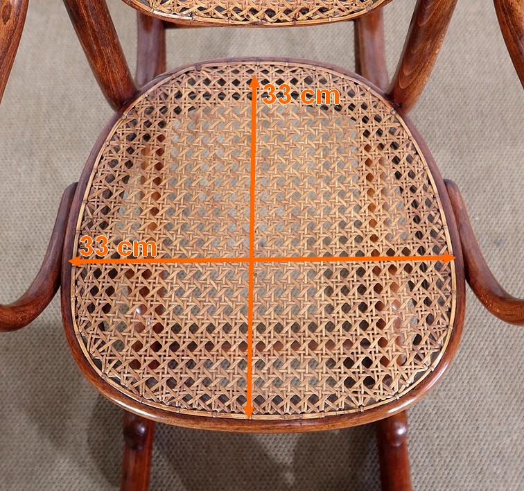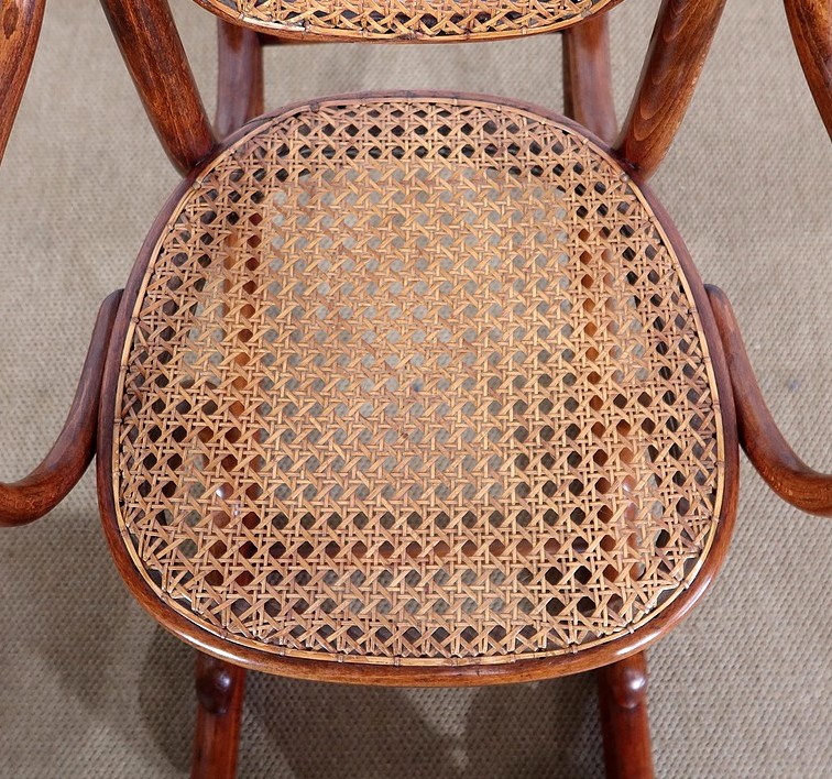 Composé d’un dossier et d’une assise en cannage, en parfait état, ce siège à bascule solide possède une patine refaite à l’identique du modèle original.