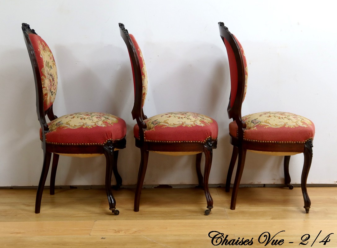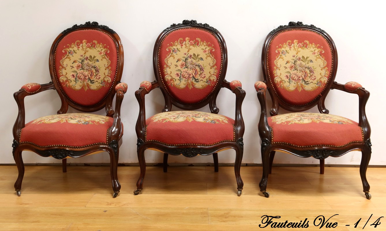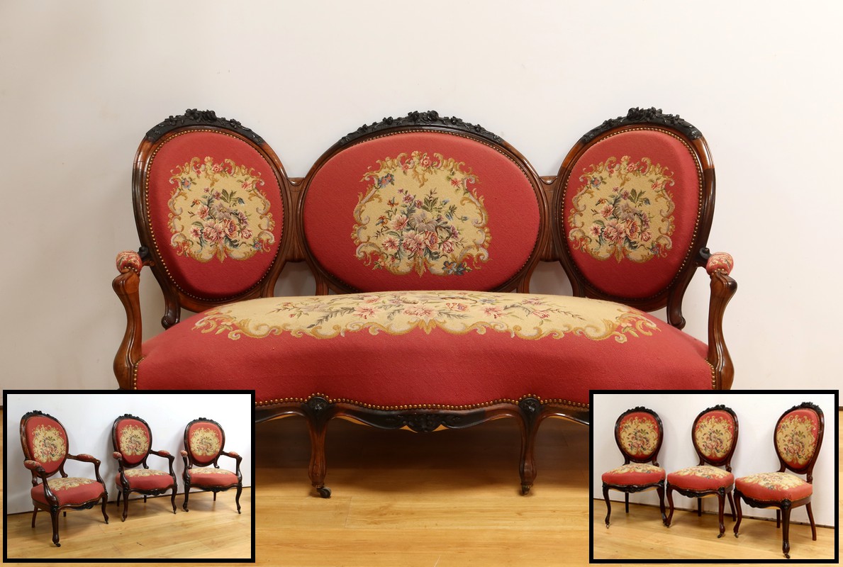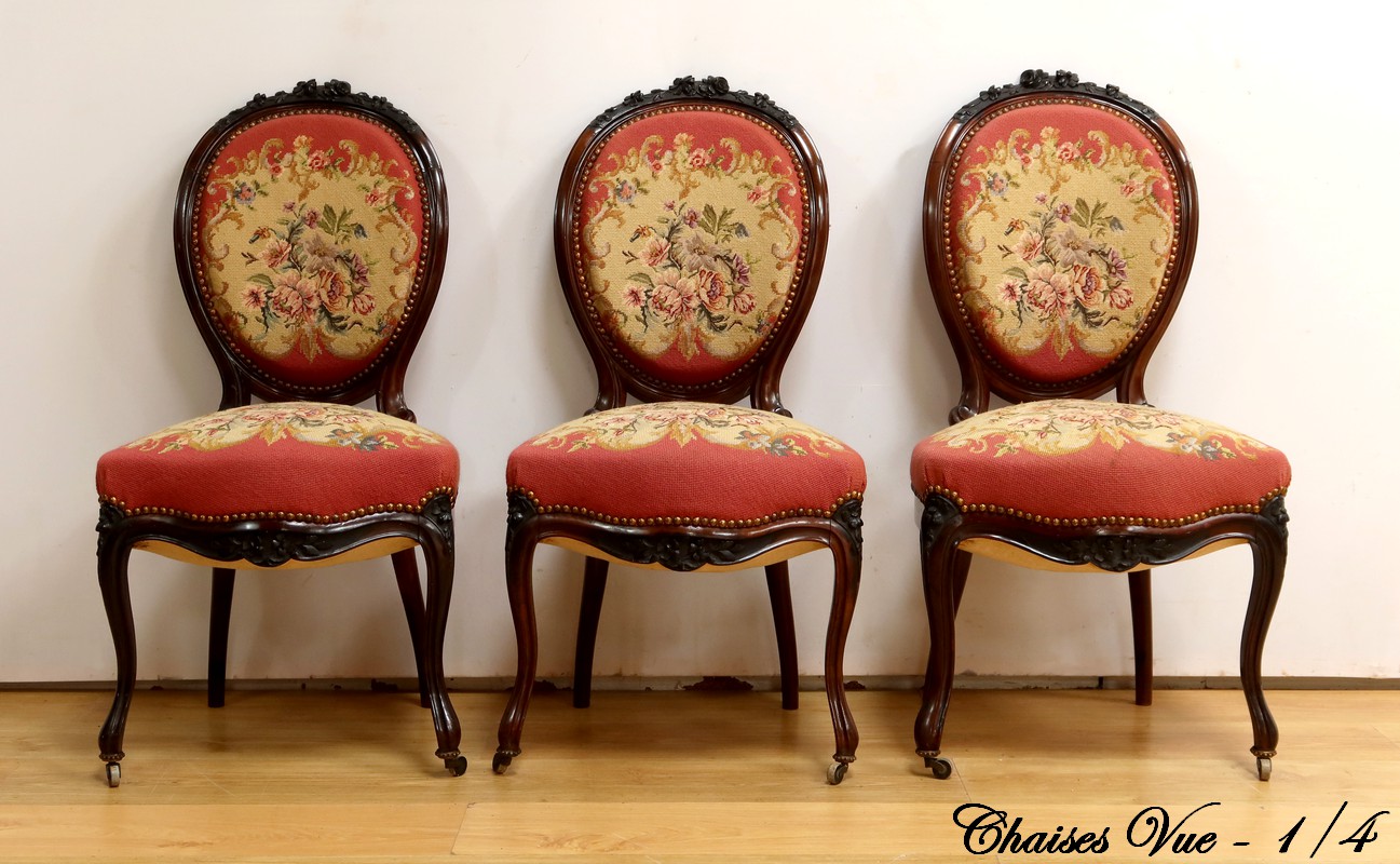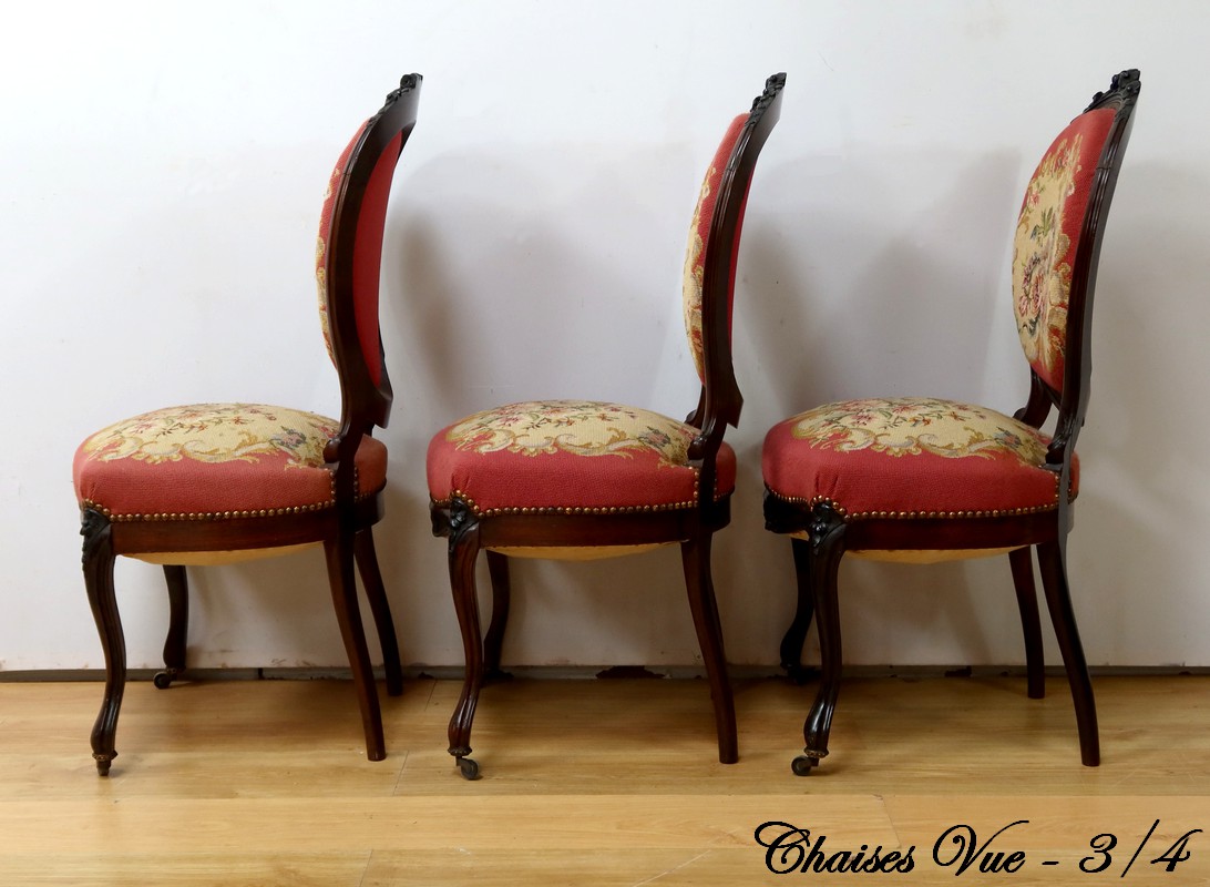 Ce magnifique salon Napoléon III en palissandre massif se compose de trois fauteuils, trois chaises et un canapé, chacun doté d’un dossier à raquette finement sculpté de motifs végétaux.