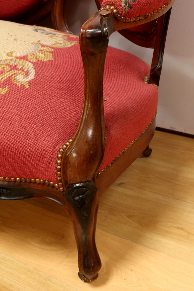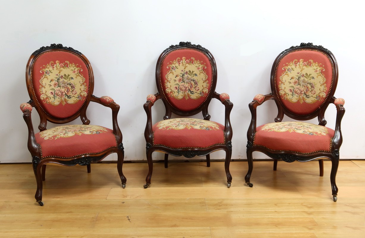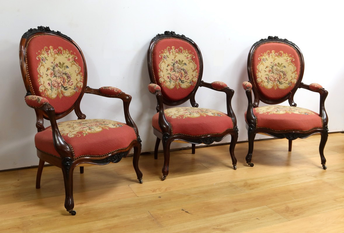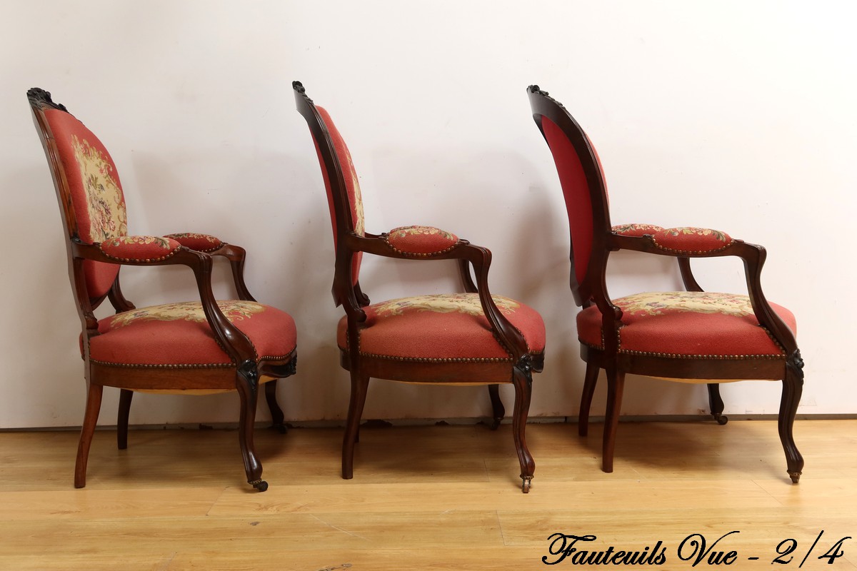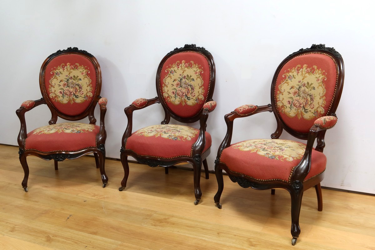 Ce magnifique salon Napoléon III en palissandre massif se compose de trois fauteuils, trois chaises et un canapé, chacun doté d’un dossier à raquette finement sculpté de motifs végétaux.
