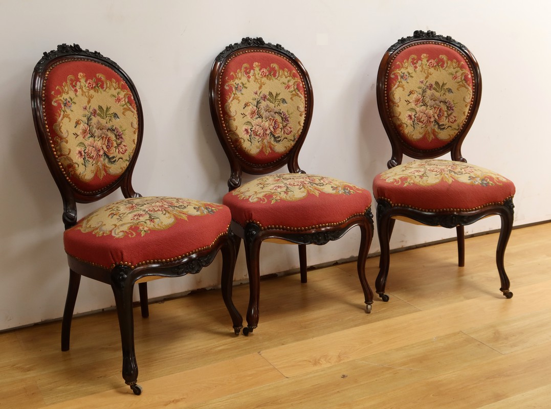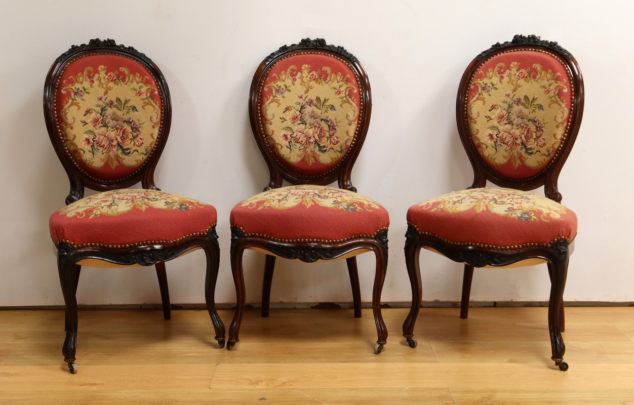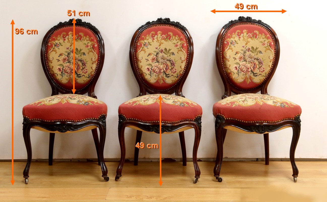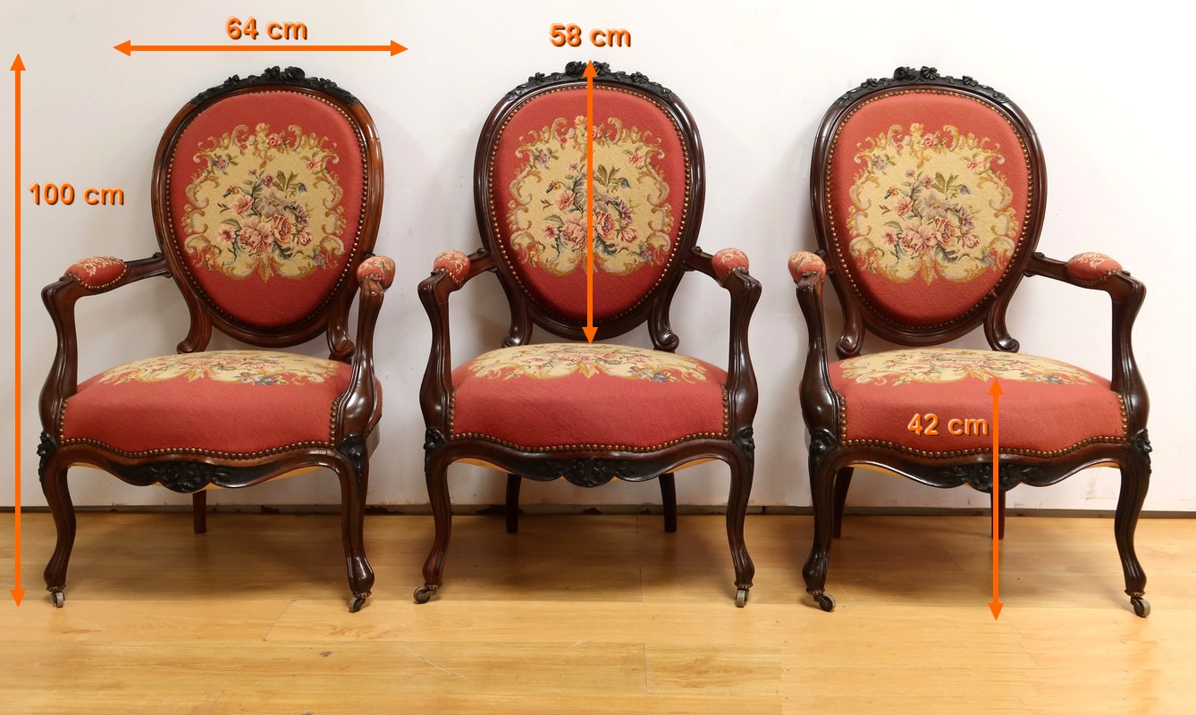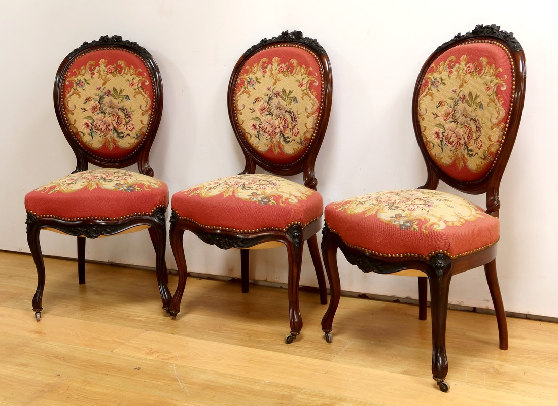 Ce magnifique salon Napoléon III en palissandre massif se compose de trois fauteuils, trois chaises et un canapé, chacun doté d’un dossier à raquette finement sculpté de motifs végétaux.