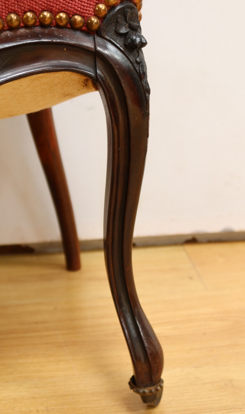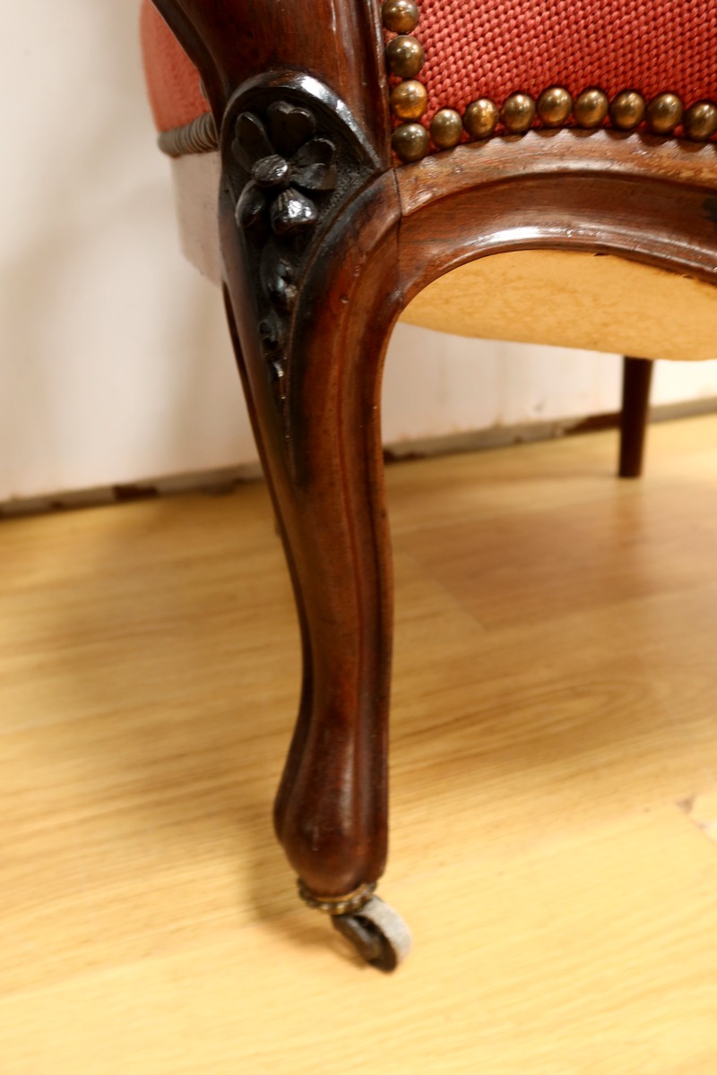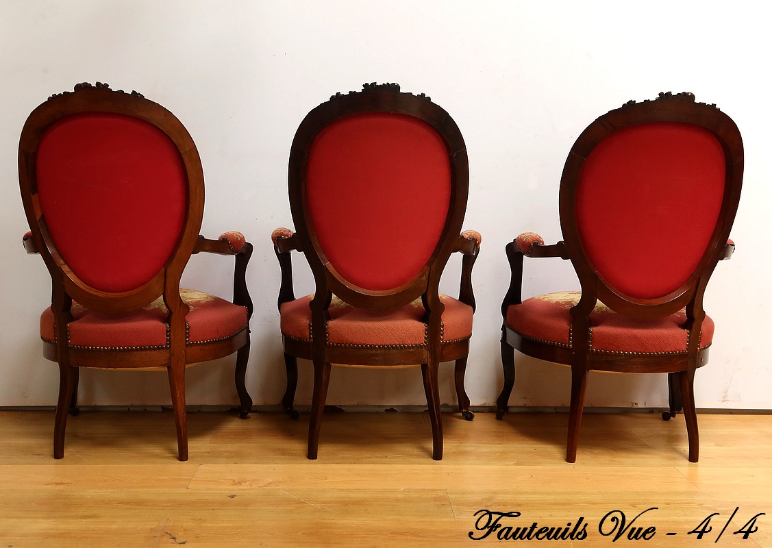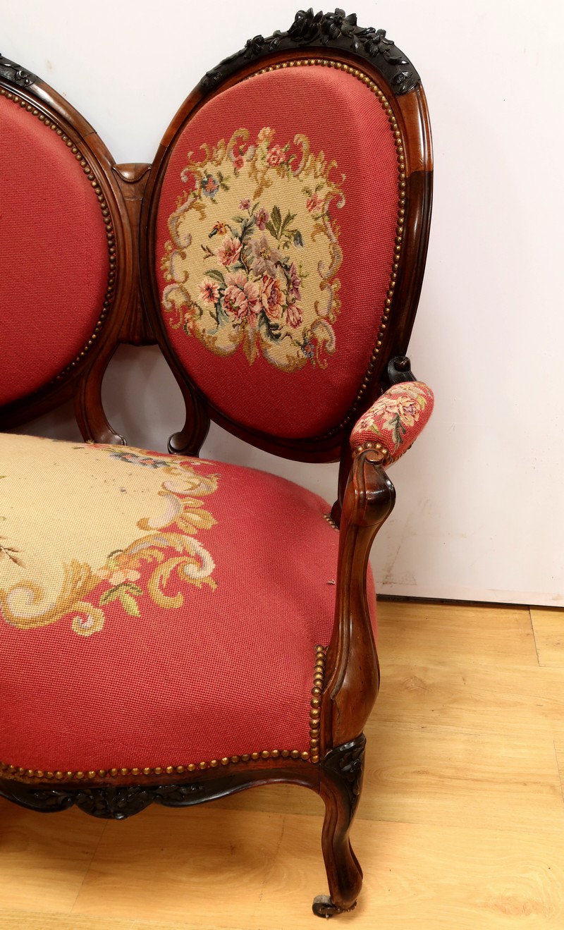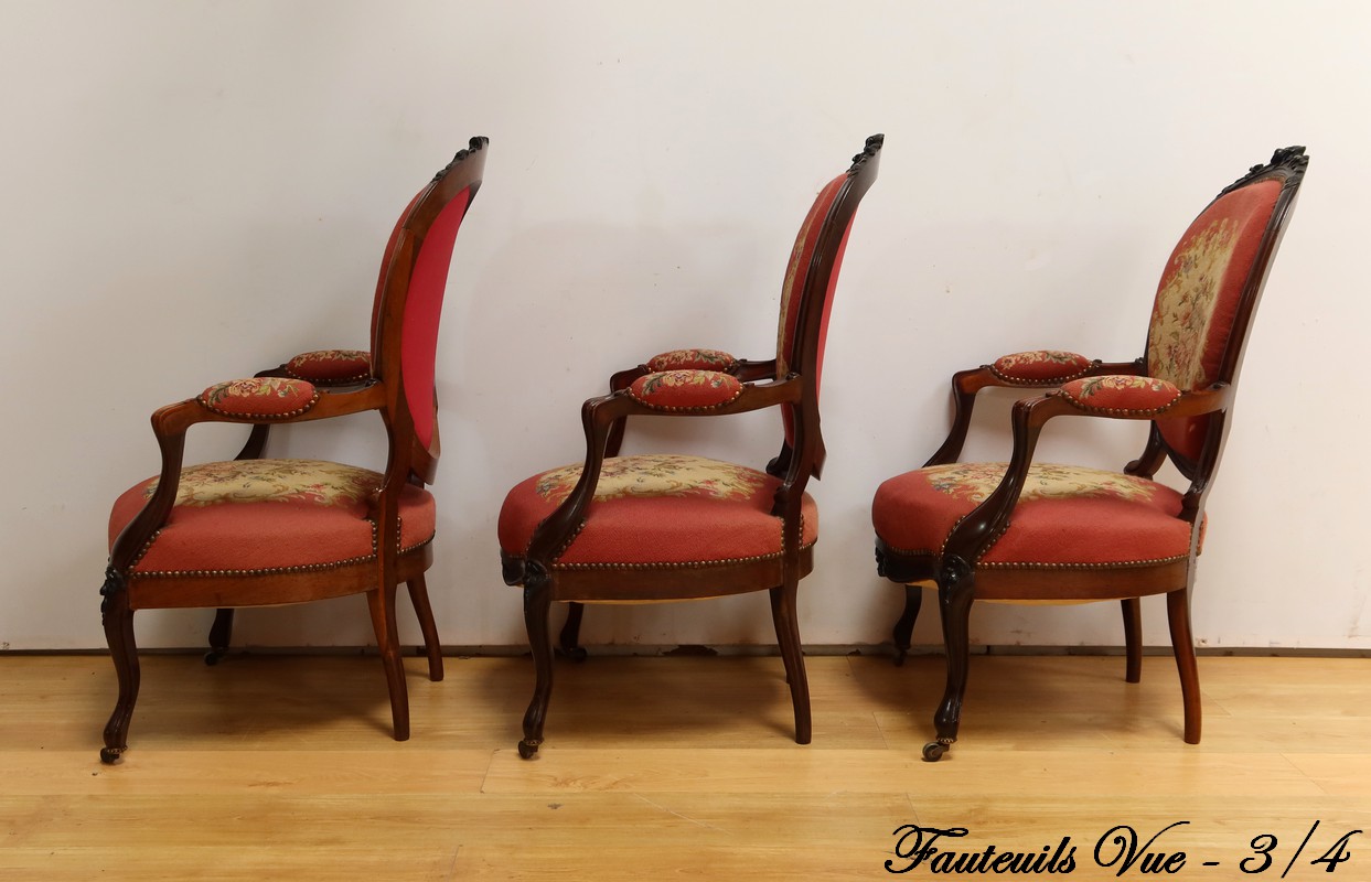 Ce magnifique salon Napoléon III en palissandre massif se compose de trois fauteuils, trois chaises et un canapé, chacun doté d’un dossier à raquette finement sculpté de motifs végétaux.