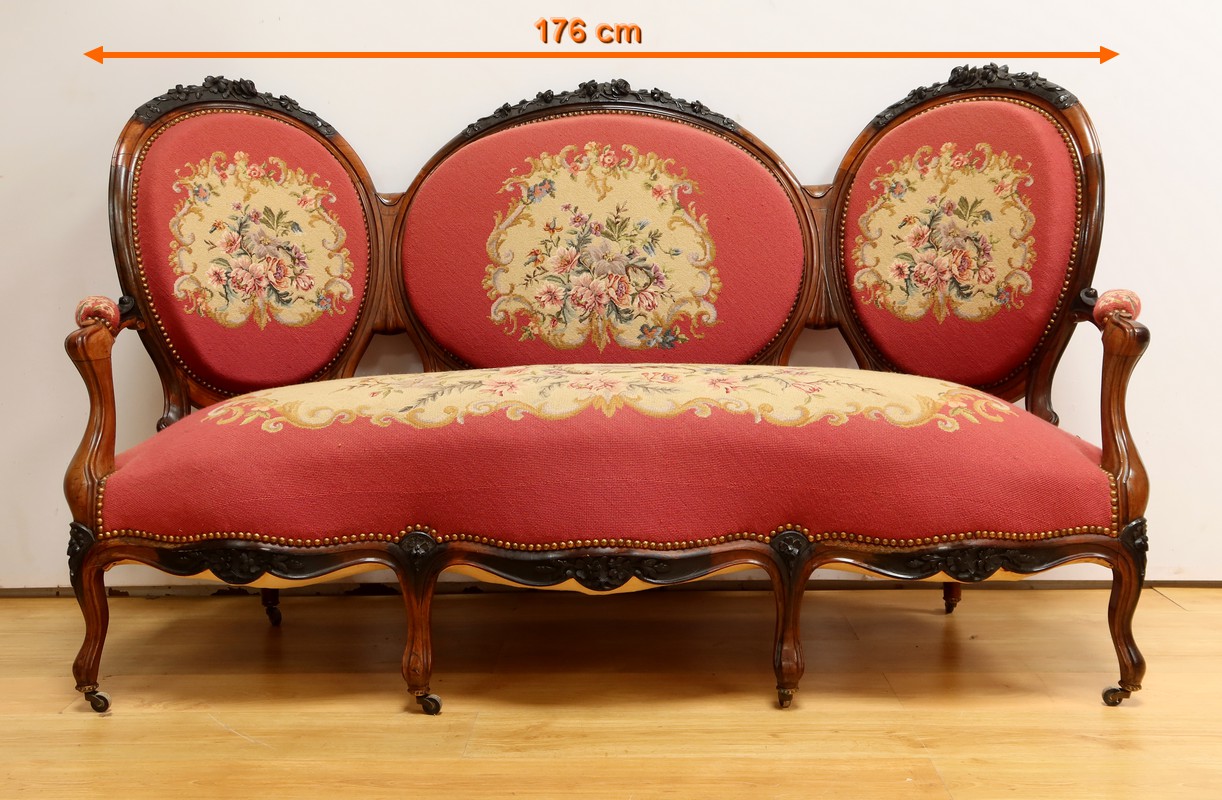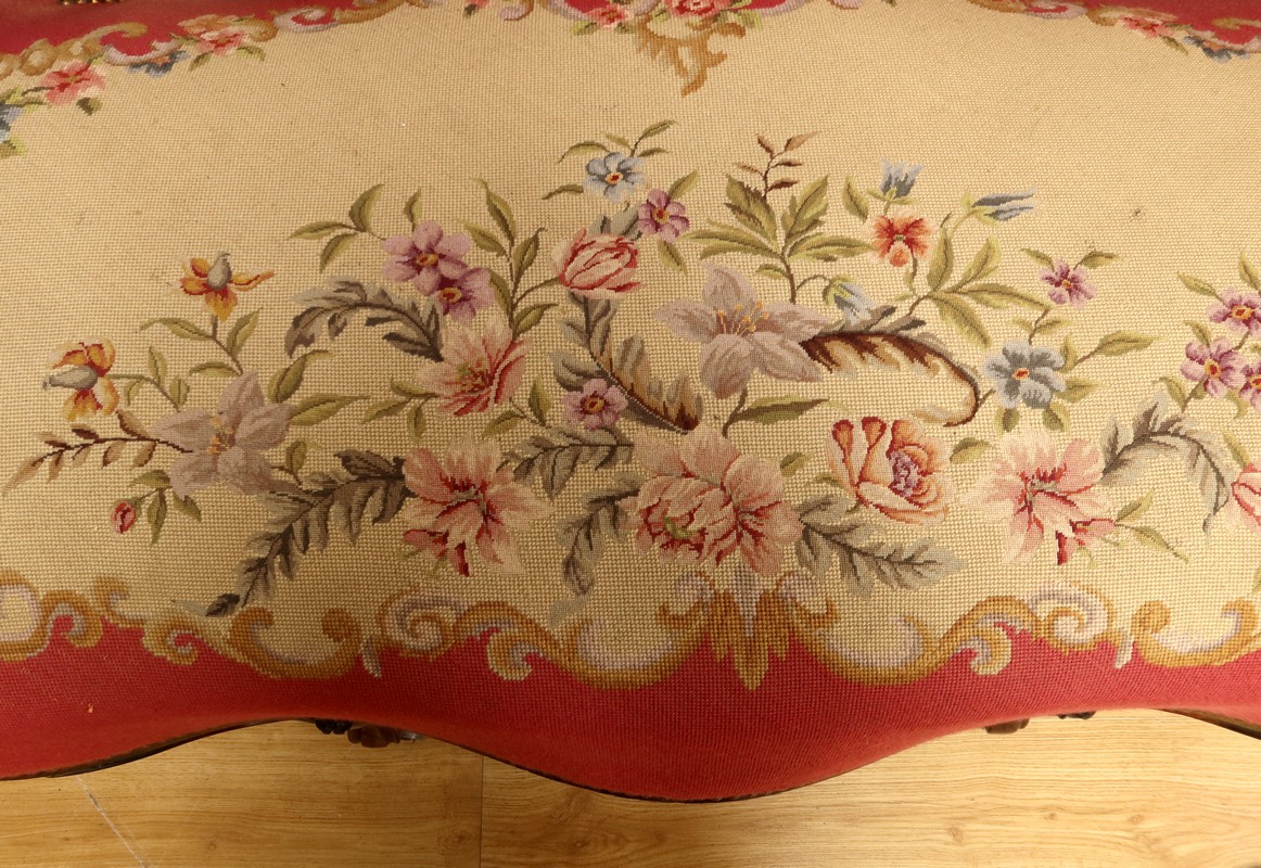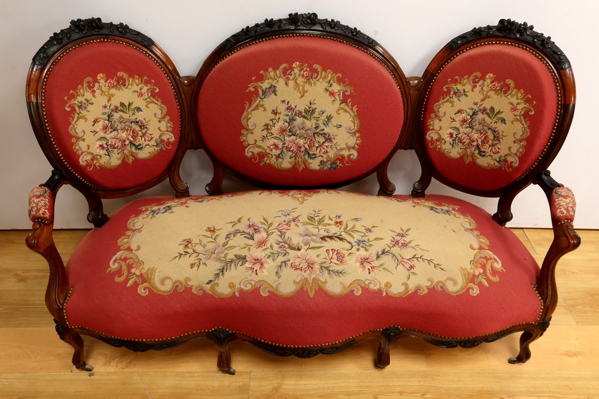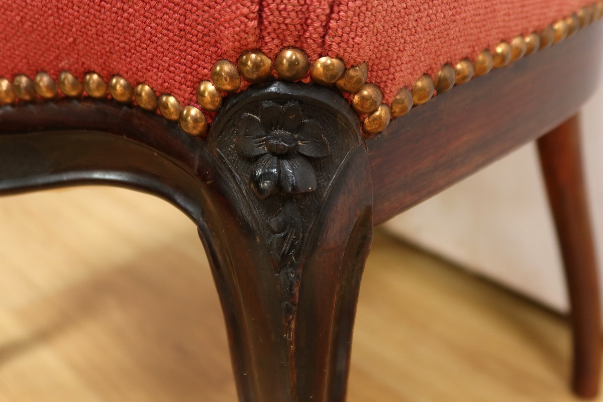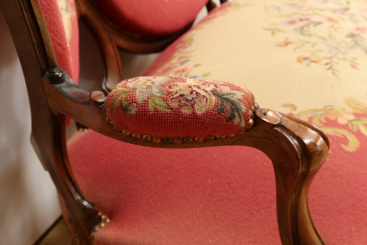 Les assises traditionnelles des fauteuils, chaises et du canapé sont recouvertes d’un tissu rosé brodé au crochet avec motifs fleuri en cartouche, fixé à l’aide de clous couleur bronze, ajoutant une touche de raffinement à l’ensemble.