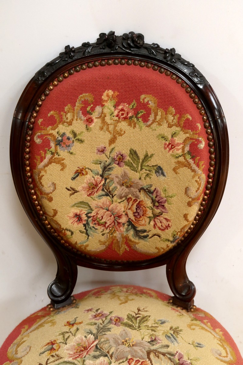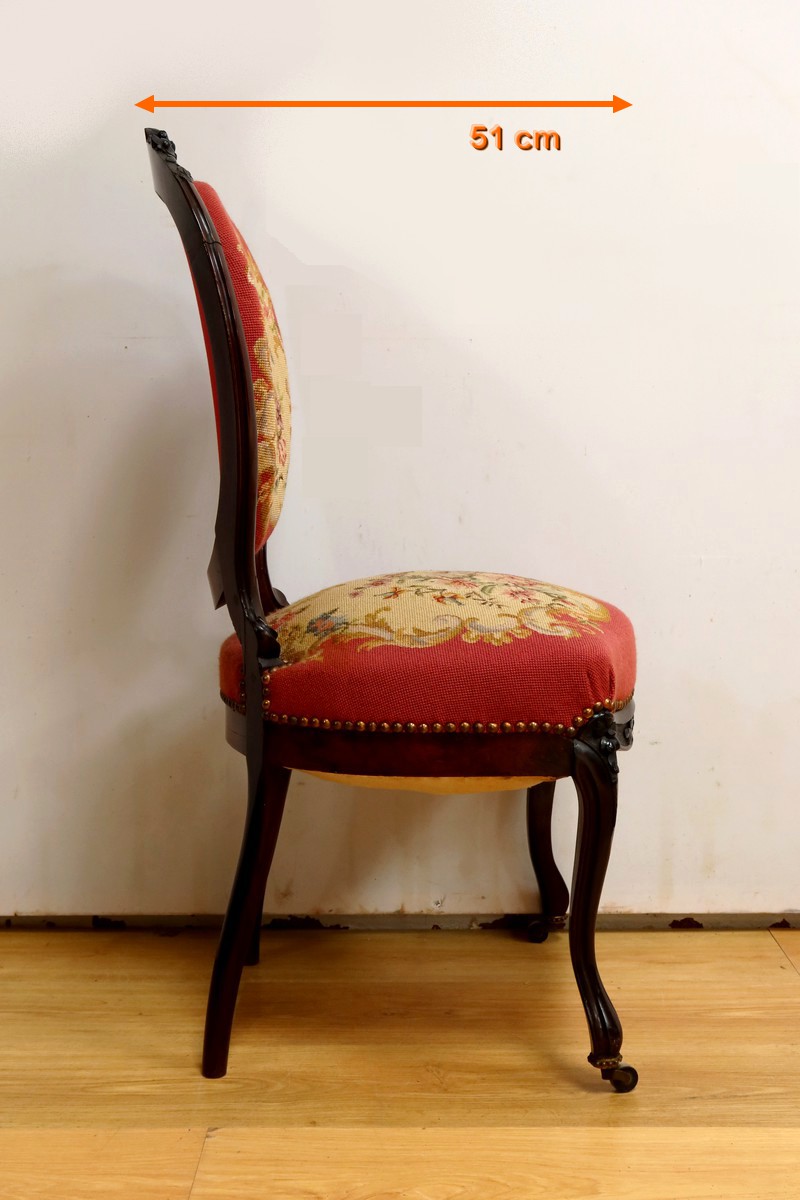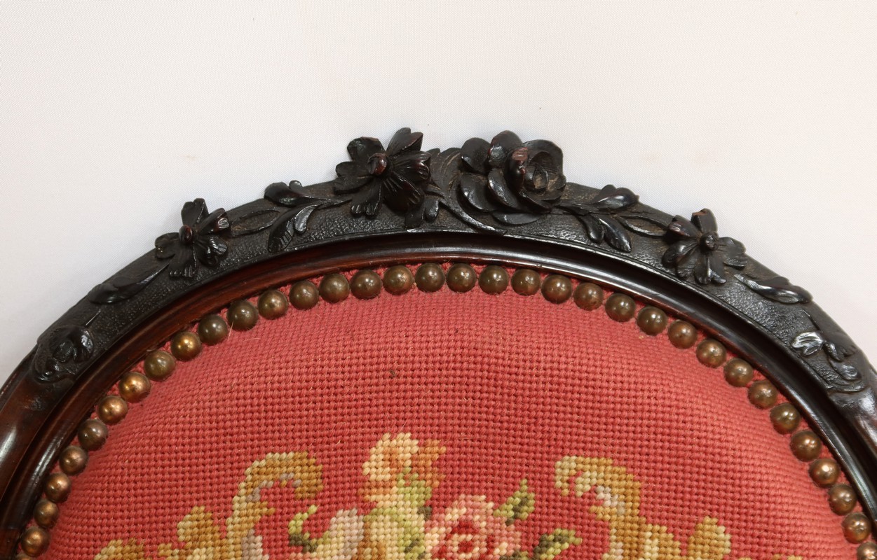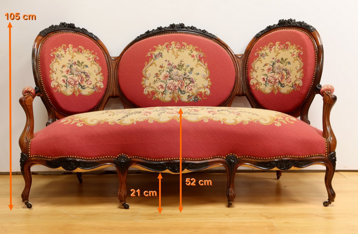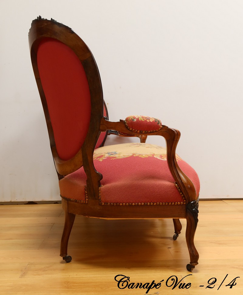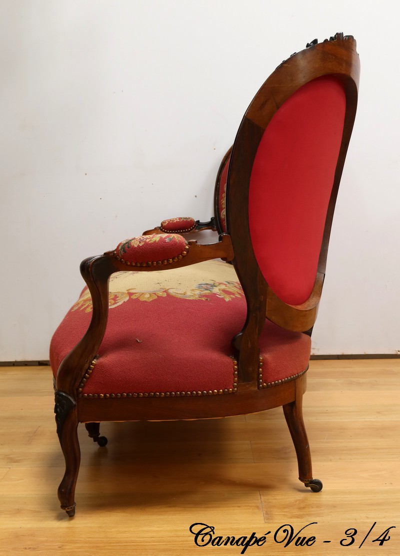 Les assises traditionnelles des fauteuils, chaises et du canapé sont recouvertes d’un tissu rosé brodé au crochet avec motifs fleuri en cartouche, fixé à l’aide de clous couleur bronze, ajoutant une touche de raffinement à l’ensemble.