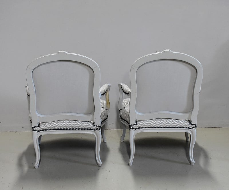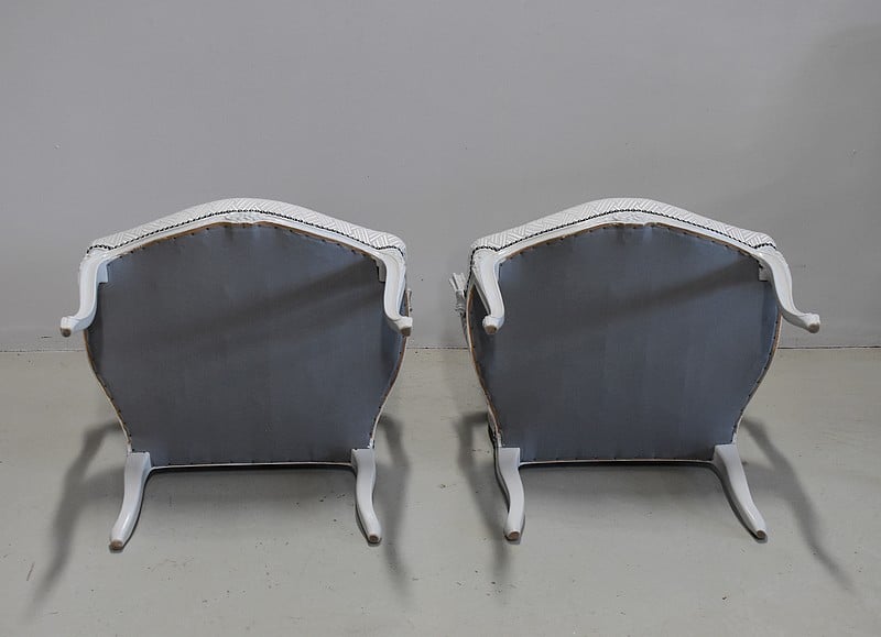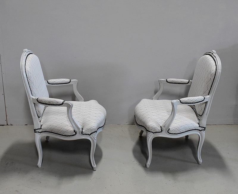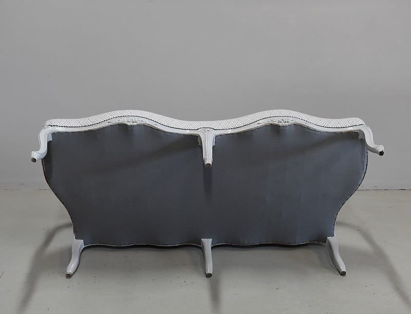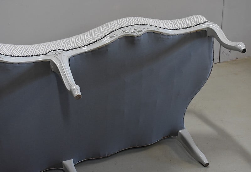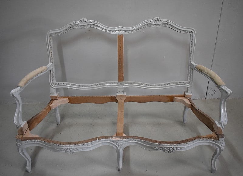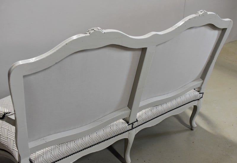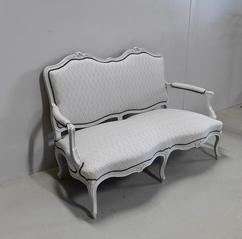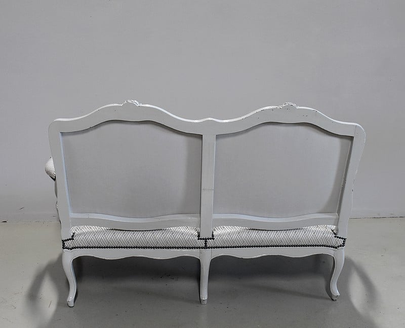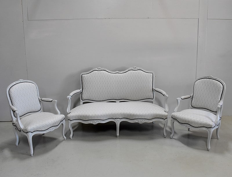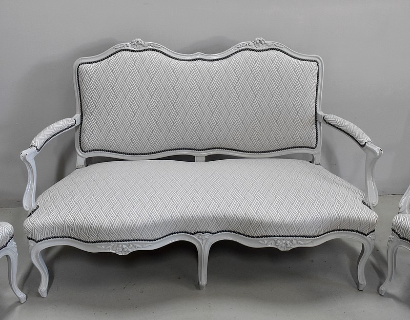 Très élégant salon de style Louis XV composé d’un canapé à 6 pieds et de ses deux fauteuils assortis en Hêtre peint d’un blanc-gris rechampi.