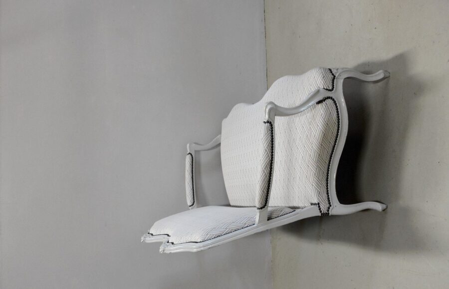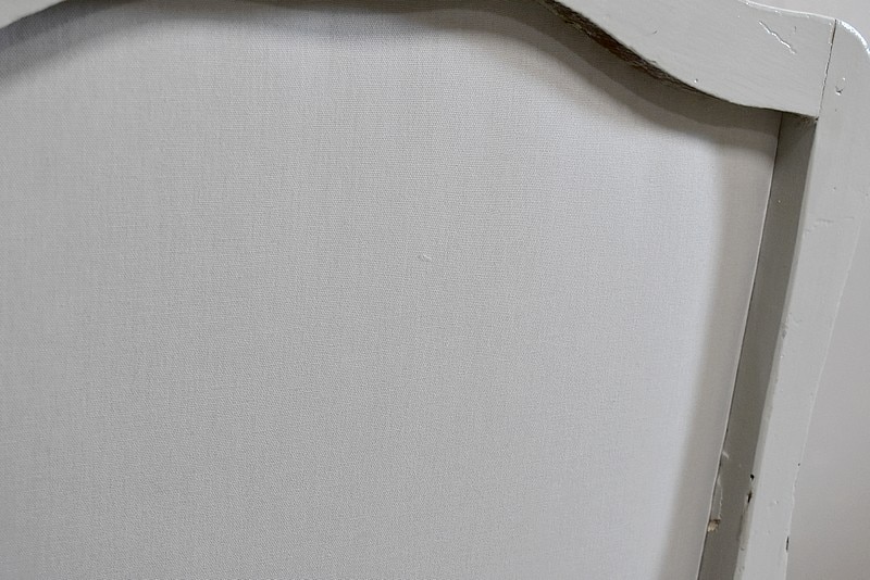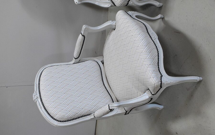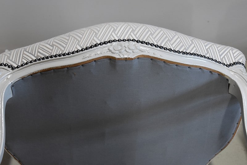 Les dossiers et assises équerrées ont été entièrement refaits à l’ancienne, avec sangles, ressorts et crin animal, de même que la toile et le tissu de finition ‘Vacoa’ de Chez Lelièvre encadré de clous noirs.