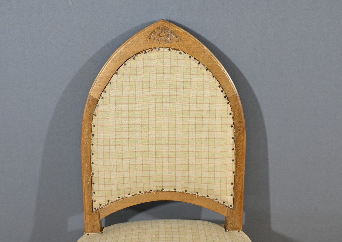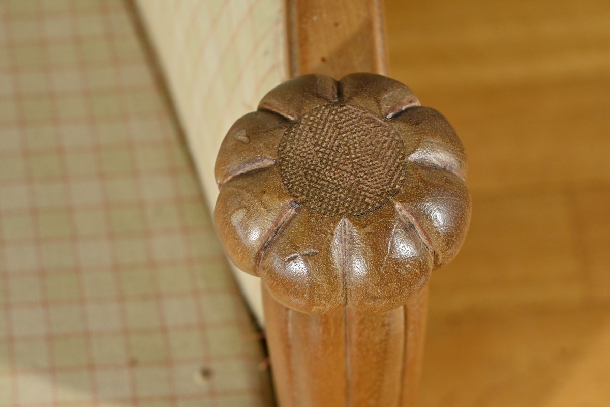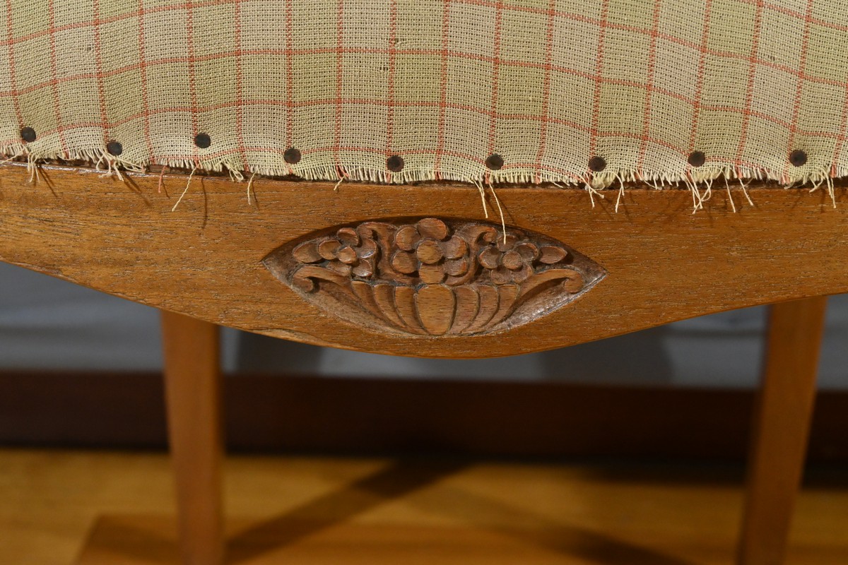 Composé d’une banquette, de deux fauteuils et de deux chaises, chaque élément de cet ensemble est agrémenté de sculptures de fleurs sur les dossiers et de vases fleuris sur les traverses, ajoutant une touche artistique et raffinée.