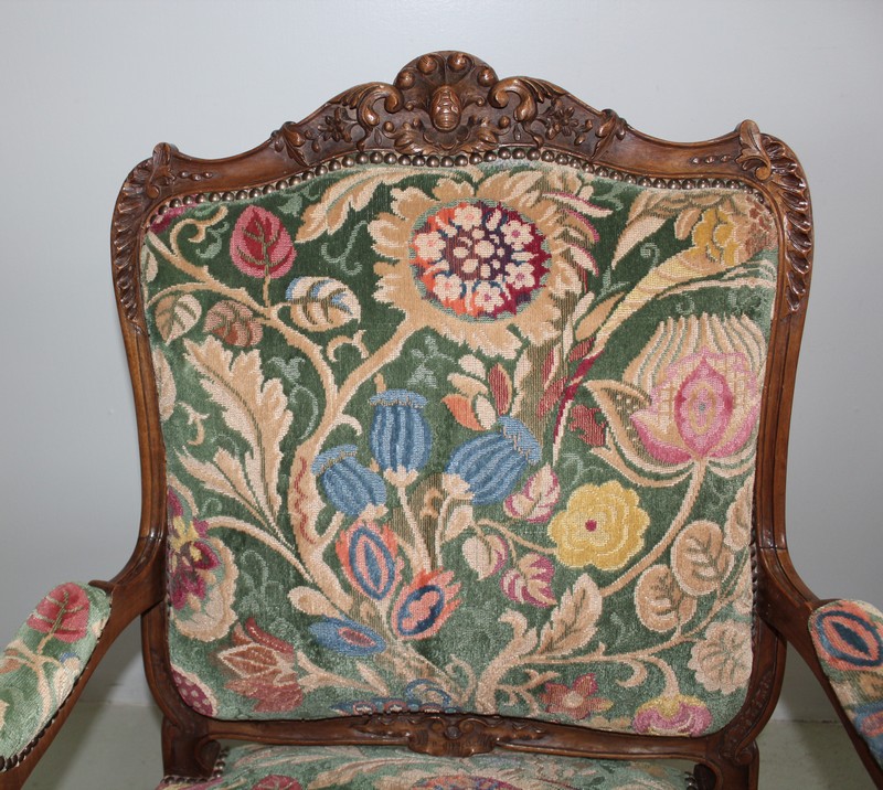 Suite de deux fauteuils et deux chaises à la Reine, de style Louis XV en noyer sculpté (sans piqures), les dossiers sommés d’une coquille d’acanthe.