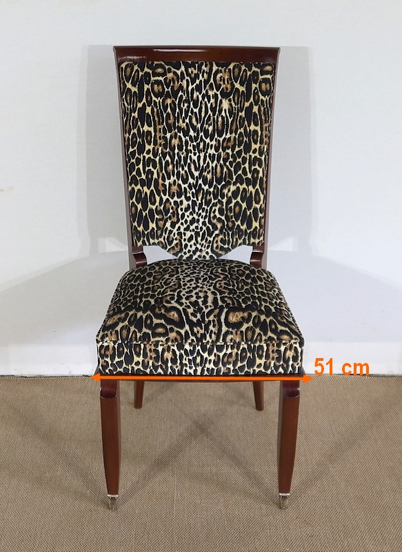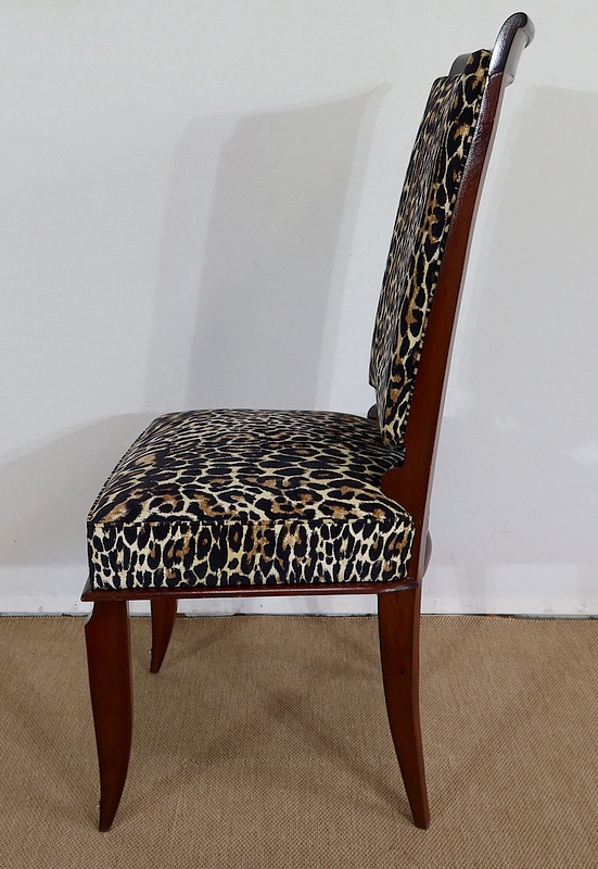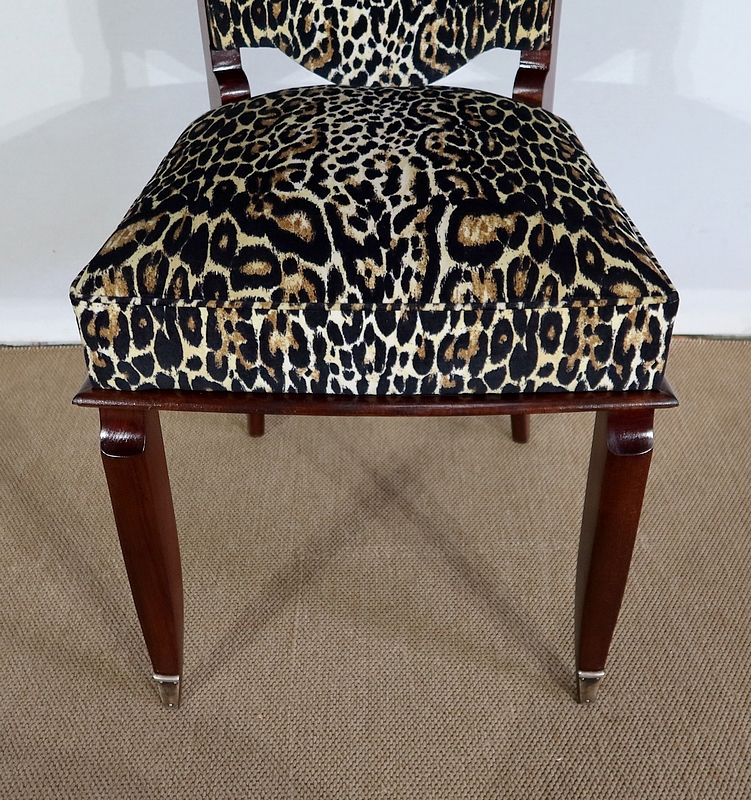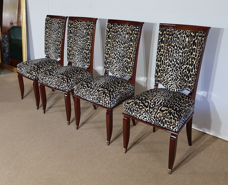 Suite de 4 grandes chaises en hêtre massif ton acajou au design unique, constituées d’une assise confortable, d’un grand dossier et garnies d’un tissu léopard de qualité.