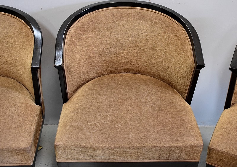 Suite de 4 fauteuils Art Déco en Hêtre noirci à dossiers Corbeille.