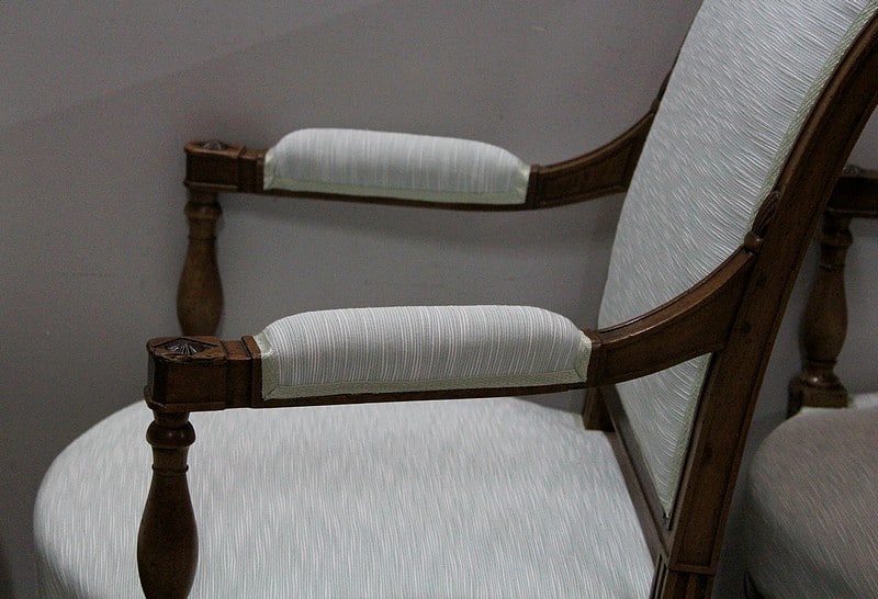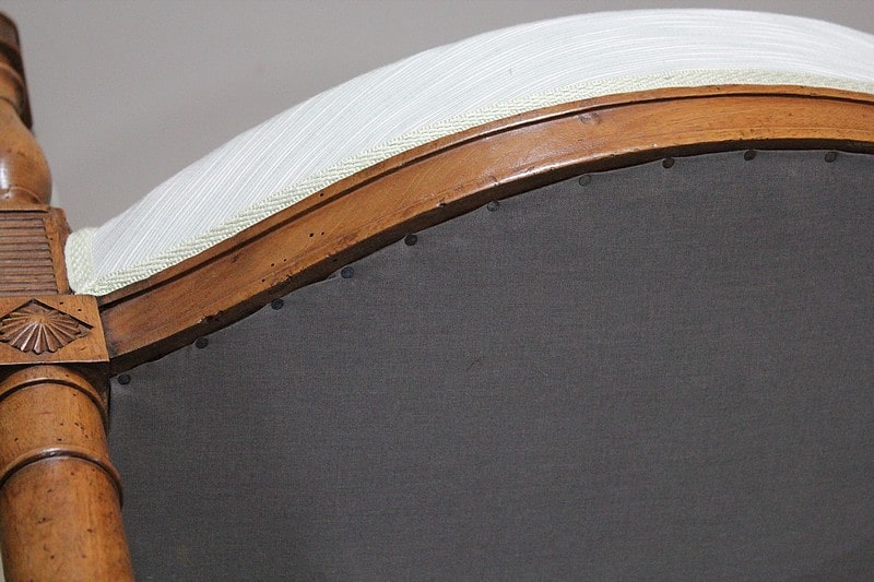 Les ossatures des dossiers, accotoirs, supports d’accotoirs et dés de raccordement sont entièrement sculptés et moulurés.
