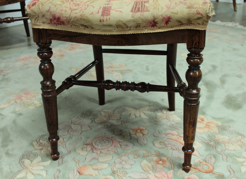 Suite de 6 chaises en hêtre teinté façon palissandre. Le dossier sinueux est ajouré d’une poignée et garni d’une traverse. Les pieds tourné et fuselés sont unis par une traverse également tournée. Garniture de tissu à décor chinois usagée. Époque NAPOLÉON III – seconde moitié du XIXe.