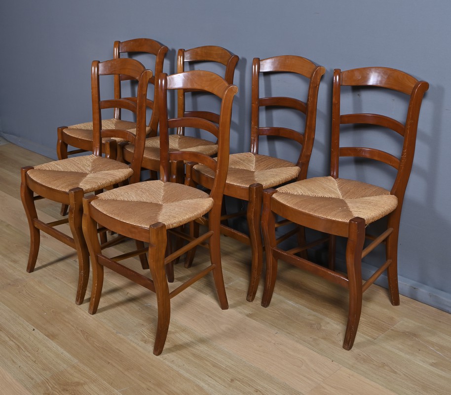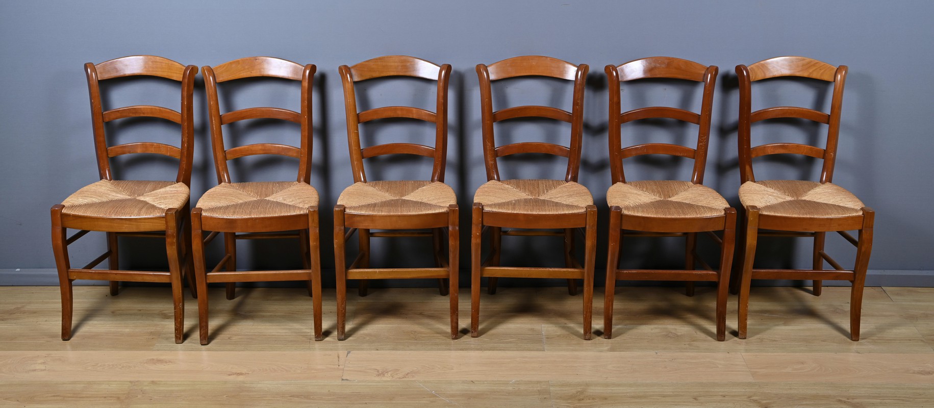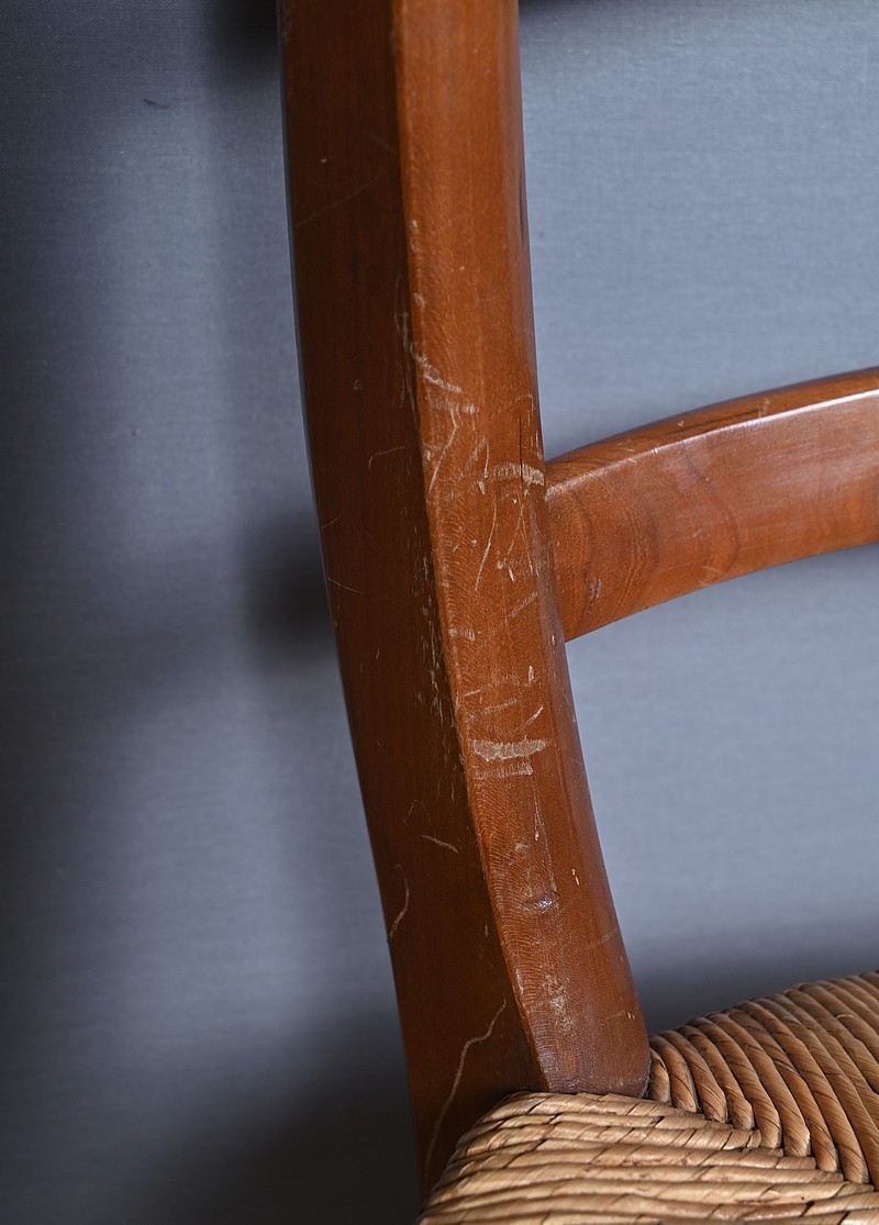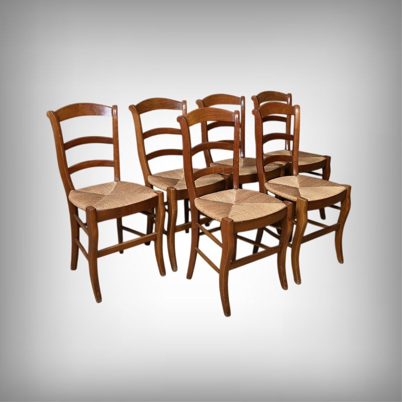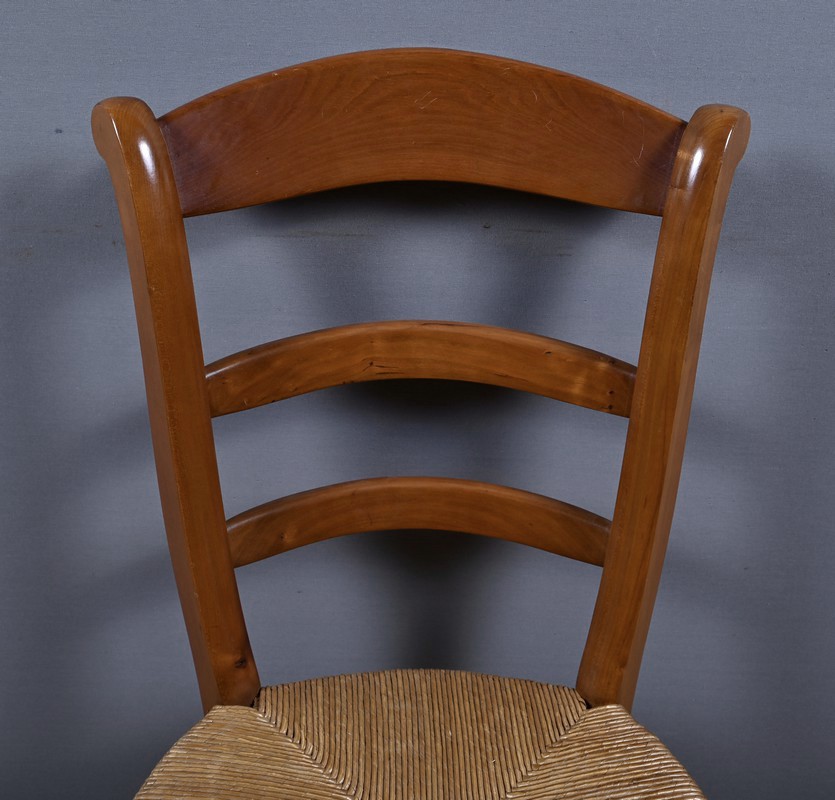 Ces six chaises en merisier présentent une silhouette classique et élégante, avec un dossier incurvé orné de trois bandeaux cintrés qui assurent à la fois maintien et légèreté visuelle. Les pieds légèrement galbés, reliés par des traverses horizontales, renforcent la stabilité tout en évoquant l’esthétique des sièges d’époque Restauration. L’assise, réalisée en fibres naturelles tressées selon un motif rayonnant, apporte une texture chaleureuse et artisanale qui contraste subtilement avec la rigueur du bois. Ces chaises traditionnelles se distinguent par leur charme rustique et leur authenticité, idéale pour une ambiance intérieure empreinte de simplicité raffinée.
