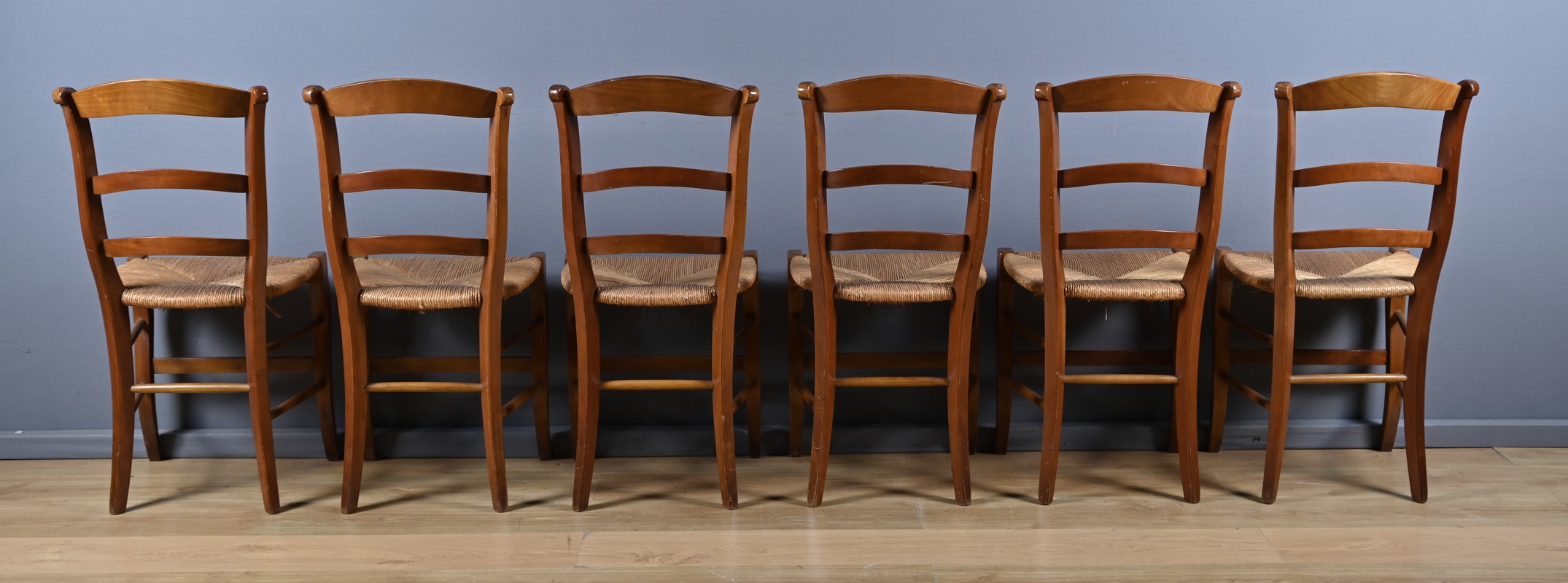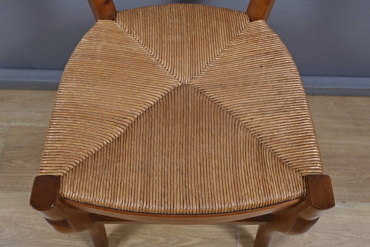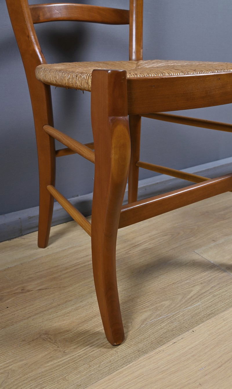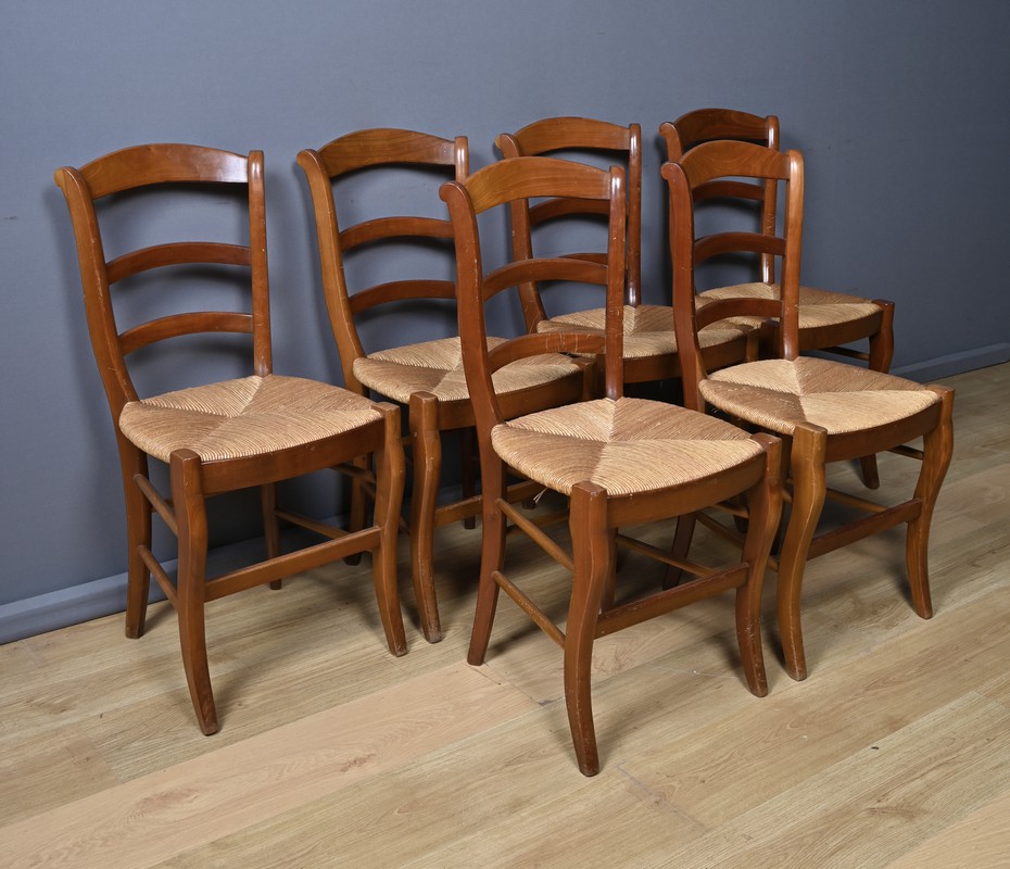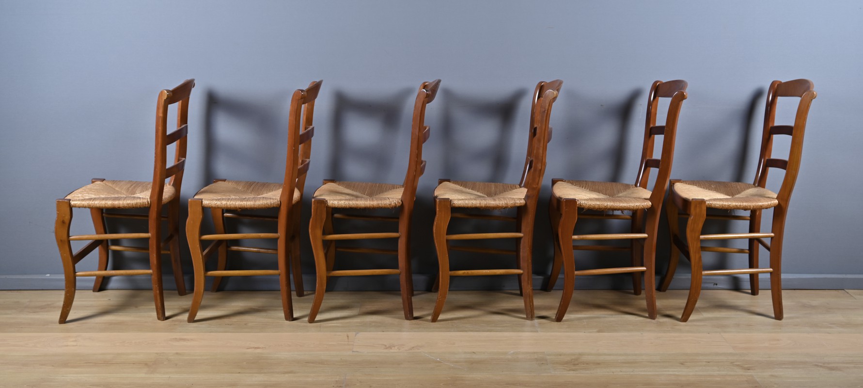 Ces six chaises en merisier présentent une silhouette classique et élégante, avec un dossier incurvé orné de trois bandeaux cintrés qui assurent à la fois maintien et légèreté visuelle. Les pieds légèrement galbés, reliés par des traverses horizontales, renforcent la stabilité tout en évoquant l’esthétique des sièges d’époque Restauration. L’assise, réalisée en fibres naturelles tressées selon un motif rayonnant, apporte une texture chaleureuse et artisanale qui contraste subtilement avec la rigueur du bois. Ces chaises traditionnelles se distinguent par leur charme rustique et leur authenticité, idéale pour une ambiance intérieure empreinte de simplicité raffinée.