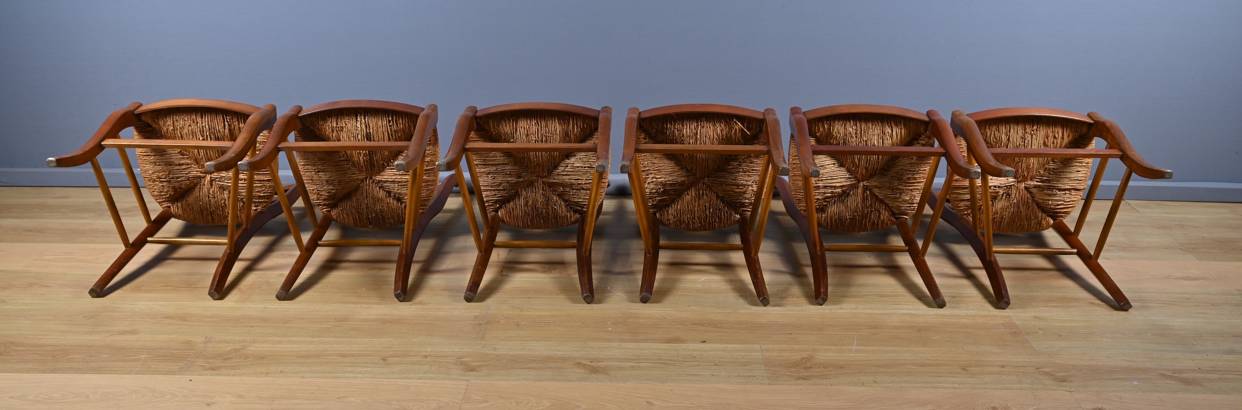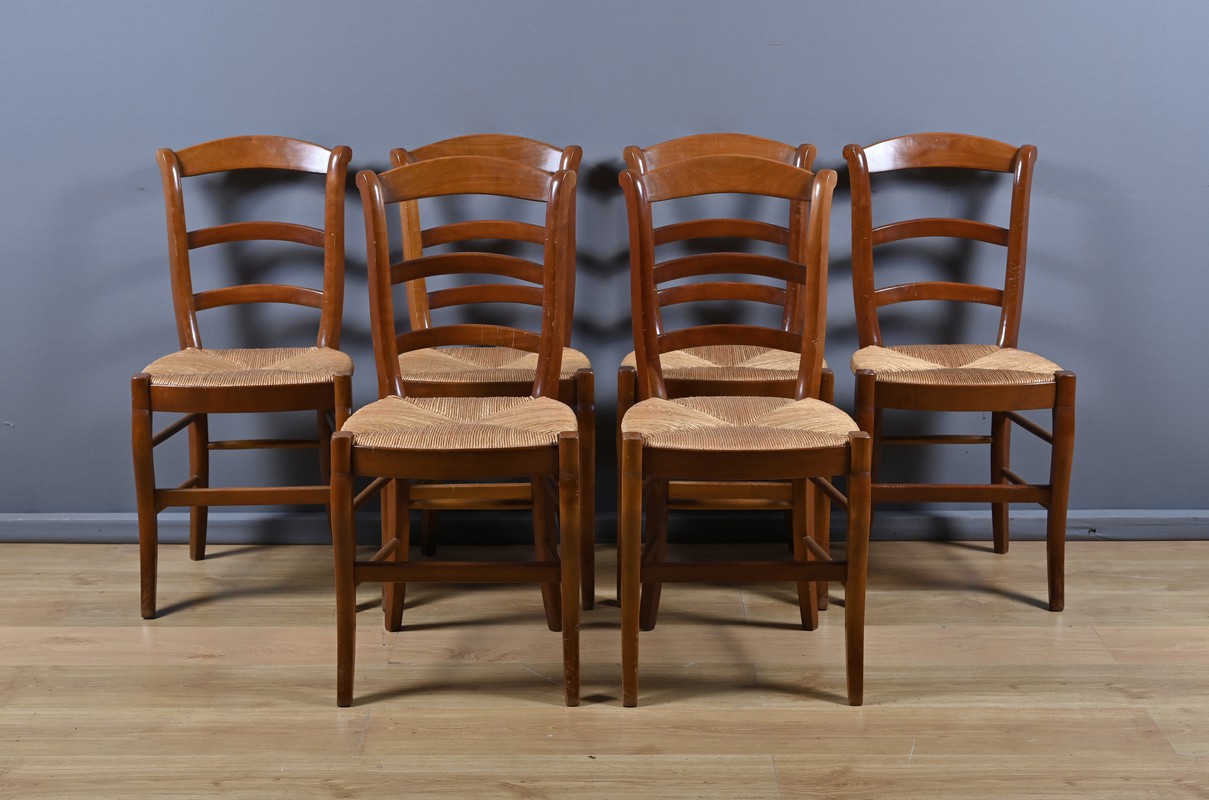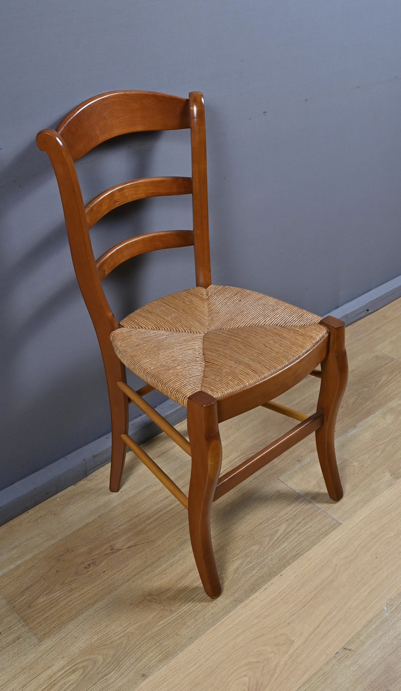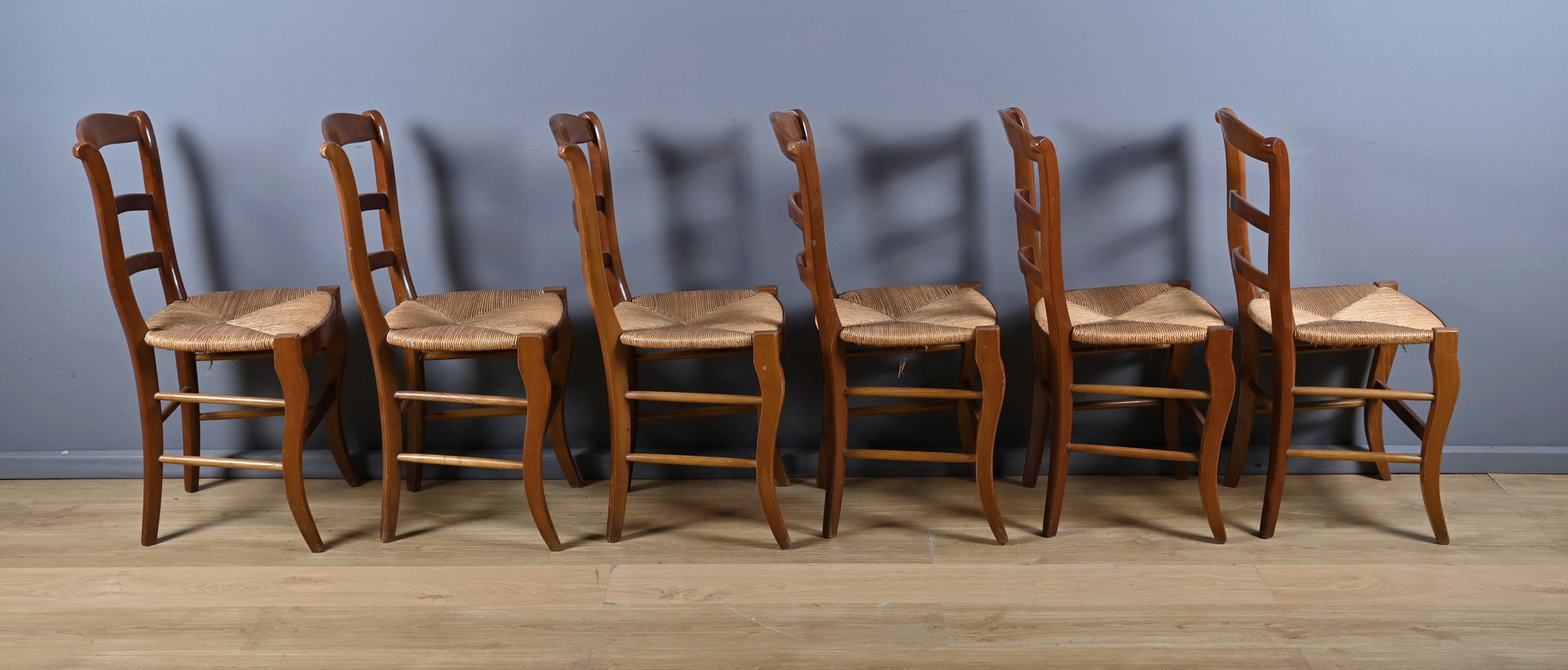 Ces six chaises en merisier présentent une silhouette classique et élégante, avec un dossier incurvé orné de trois bandeaux cintrés qui assurent à la fois maintien et légèreté visuelle. Les pieds légèrement galbés, reliés par des traverses horizontales, renforcent la stabilité tout en évoquant l’esthétique des sièges d’époque Restauration. L’assise, réalisée en fibres naturelles tressées selon un motif rayonnant, apporte une texture chaleureuse et artisanale qui contraste subtilement avec la rigueur du bois. Ces chaises traditionnelles se distinguent par leur charme rustique et leur authenticité, idéale pour une ambiance intérieure empreinte de simplicité raffinée.
