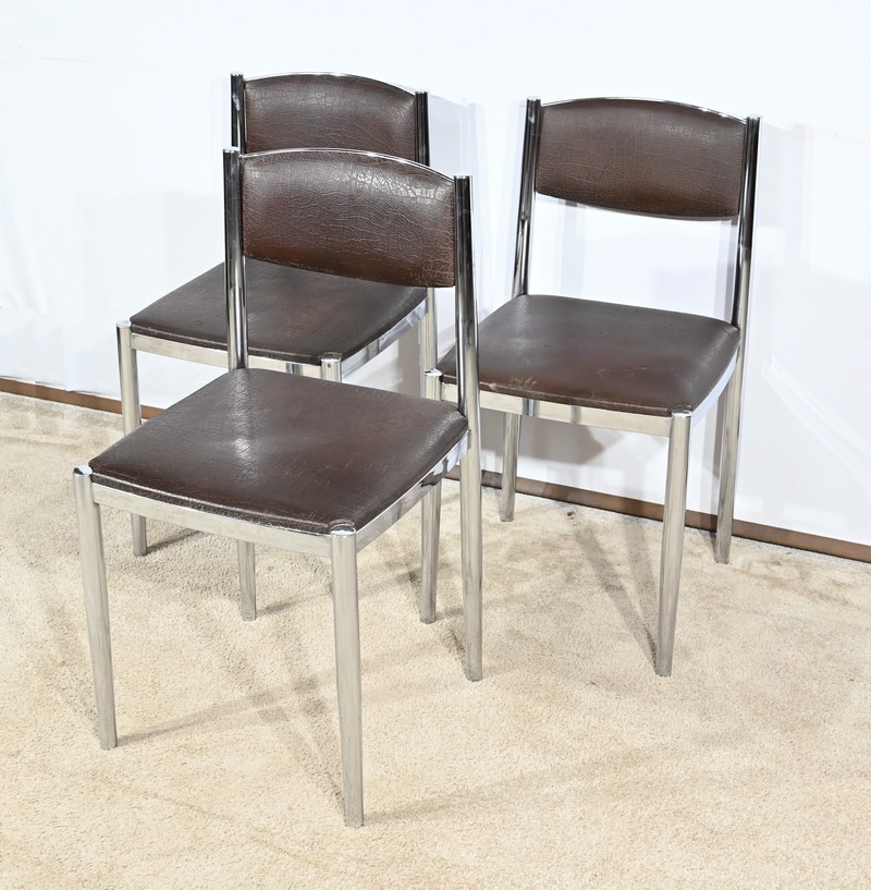 Suite de trois chaises, à ossatures métalliques chromées, reposant chacune sur quatre pieds tubulaires.